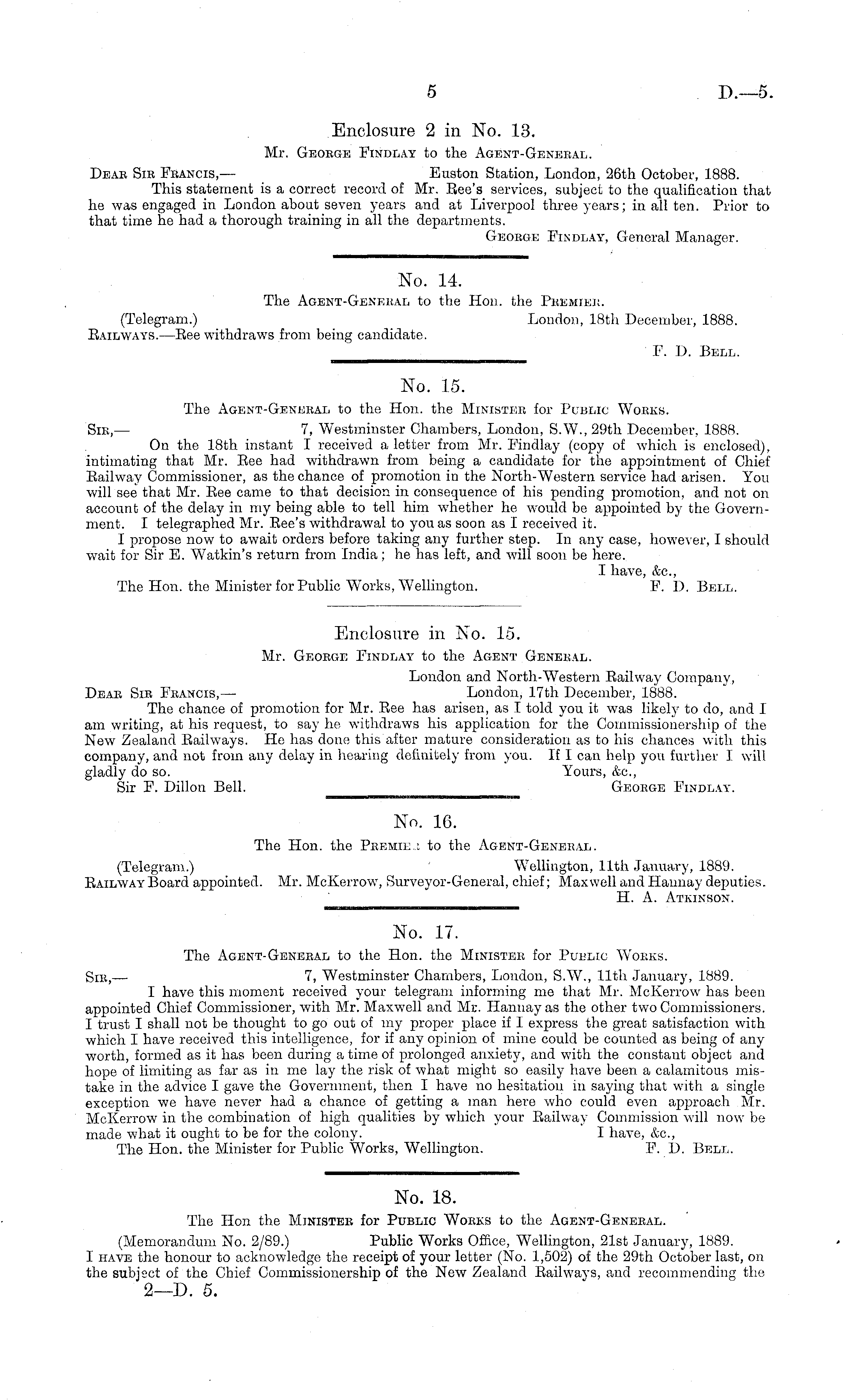 No. 17. The Agent-Geneeal to the Hon. the Ministeb for Public Woeks. Sib, — 7, Westminster Chambers, London, S.W., 11th January, 1889. I have this moment received your telegram informing me that Mr. McKerrow has been appointed Chief Commissioner, with Mr. Maxwell and Mr.. Hannayas the other two Commissioners. I trust I shall not be thought to go out of my proper place if I express the great satisfaction with which I have received this intelligence, for if any opinion of mine could be counted as being of any worth, formed as it has been during a time of prolonged anxiety, and with the constant object and hope of limiting as far as in me lay the risk of what might so easily have been a calamitous mistake in the advice I gave the Government, then I have no hesitation in saying that with a single exception we have never had a chance of getting a man here who could even approach Mr. McKerrow in the combination of high qualities by which your Eailway Commission will now be made what it ought to be for the colony. I have, &c, The Hon. the Minister for Public Works, Wellington. F. D. Bell.