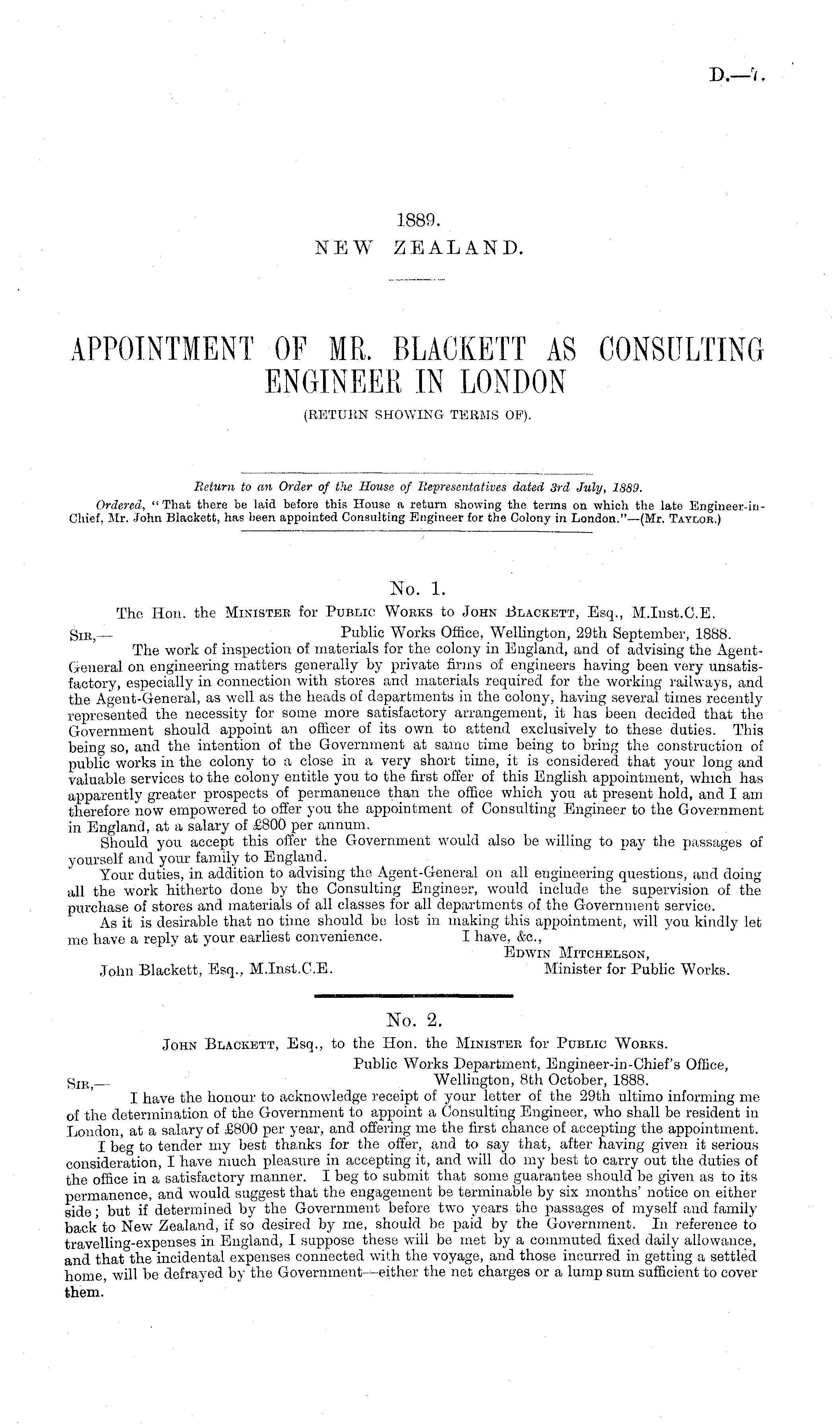 No. 1. The Hon. the Minister for Public Works to John ±$lackett, Esq., M.lust.C.E. Bib,— Public Works Office, Wellington, 29th September, 1888. The work of inspection of materials for the colony in England, and of advising the AgentGeneral on engineering matters generally by private firms of engineers having been very unsatisfactory, especially in connection with stores and materials required for the working railways, and the Agent-General, as well as the heads of departments in the colony, having several times recently represented the necessity for some more satisfactory arrangement, it has been decided that the Government should appoint an officer of its own to attend exclusively to these duties. This being so, and the intention of the Government at same time being to bring the construction of public works in the colony to a close in a very short time, it is considered that your long and valuable services to the colony entitle you to the first offer of this English appointment, which has apparently greater prospects of permanence than the office which you at present hold, and I am therefore now empowered to offer you the appointment of Consulting Engineer to the Government in England, at a salary of £800 per annum. Should you accept this offer the Government would also be willing to pay the passages of yourself and your family to England. Your duties, in addition to advising the Agent-General on all engineering questions, and doing all the work hitherto done by the Consulting Engineer, would include the supervision of the purchase of stores and materials of all classes for all departments of the Government service. As it is desirable that no time should bo lost in making this appointment, will you kindly let me have a reply at your earliest convenience. I have, &c, Edwin Mitchelson, John Blackett, Esq... M.lnst. C.E. Minister for Public Works.