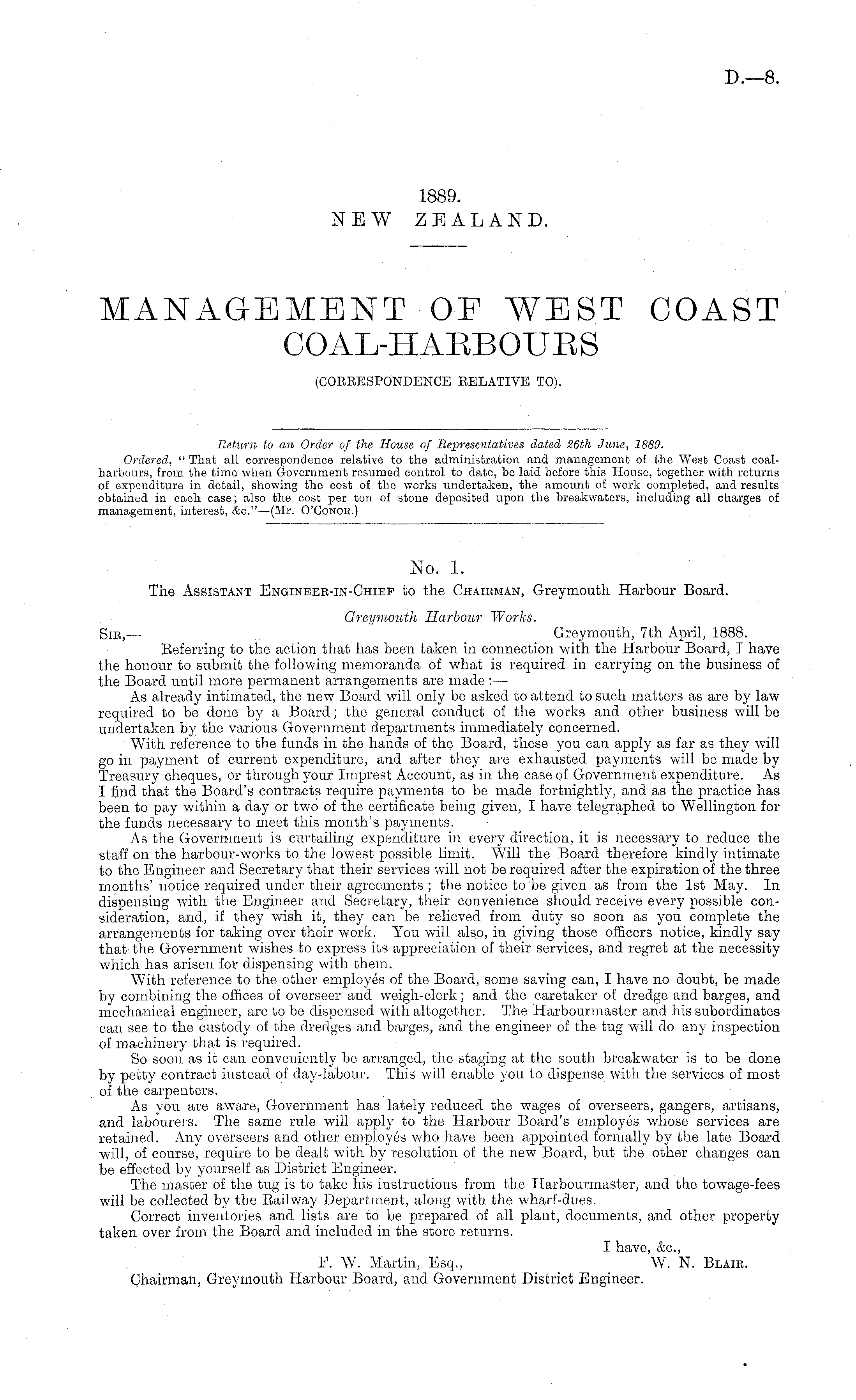 Betv/rn to an Order of the House of Representatives dated 26th June, 18S9. Ordered, " That all correspondence relative to the administration and management of the West Coast coalharbours, from the time when Government resumed control to date, be laid before this House, together with returns of expenditure in detail, showing the cost of the works undertaken, the amount of work completed, and results obtained in each case; also the cost per ton of stone deposited upon the breakwaters, including all charges of management, interest, &c." —(Mr. O'Gonoh.)