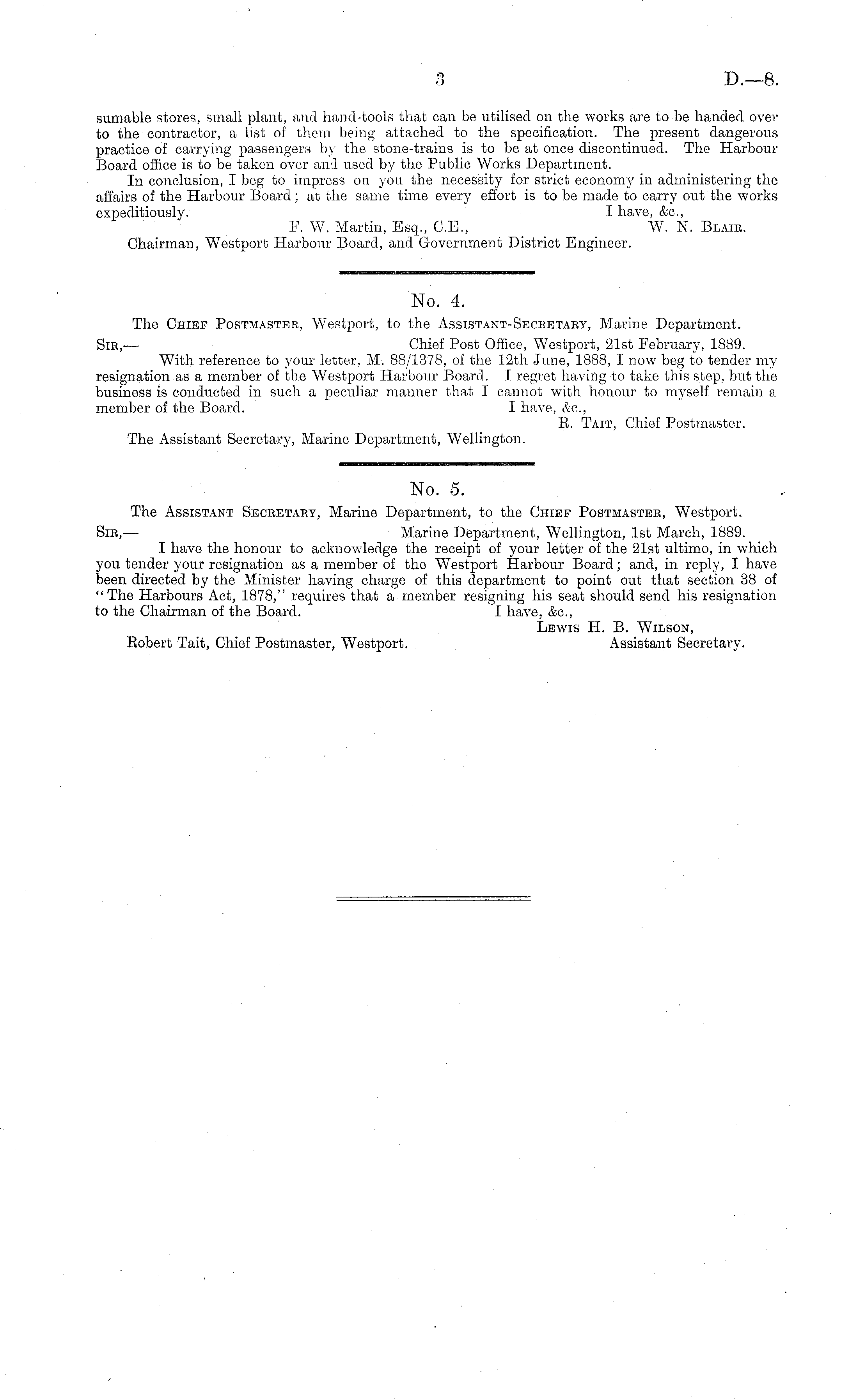 sumable stores, small plant, and hand-tools that can be utilised on the works are to be handed over to the contractor, a list of them being attached to the specification. The present dangerous practice of carrying passengers by the stone-trains is to be at once discontinued. The Harbour Board office is to be taken over and used by the Public Works Department. In conclusion, I beg to impress on you the necessity for strict economy in administering the affairs of the Harbour Board; at the same time every effort is to be made to carry out the works expeditiously. I have, &c, F. W. Martin, Esq., C.E., W. N. Blaib. Chairman, Westport Harbour Board, and Government District Engineer. No. 4. The Chief Postmaster, Westport, to the Assistant-Secretary, Marine Department. Sir,— Chief Post Office, Westport, 21st February, 1889. With reference to your letter, M. 88/1378, of the 12th June, 1888, I now beg to tender my resignation as a member of the Westport Harbour Board. I regret having to take this step, but the business is conducted in such a peculiar manner that 1 cannot with honour to myself remain a member of the Board. I have, Ac, li. Tait, Chief Postmaster. The Assistant Secretary, Marine Department, Wellington. No. 5. The Assistant Secretary, Marine Department, to the Chief Postmaster, Westport. Sir, — Marine Department, Wellington, Ist March, 1889. I have the honour to acknowledge the receipt of your letter of the 21st ultimo, in which you tender your resignation as a member of the Westport Harbour Board; and, in reply, I have been directed by the Minister having charge of this department to point out that section 38 of "The Harbours Act, 1878," requires that a member resigning his seat should send his resignation to the Chairman of the Board. I have, &c, Lewis H. B. Wilson, Robert Tait, Chief Postmaster, Westport. Assistant Secretary.