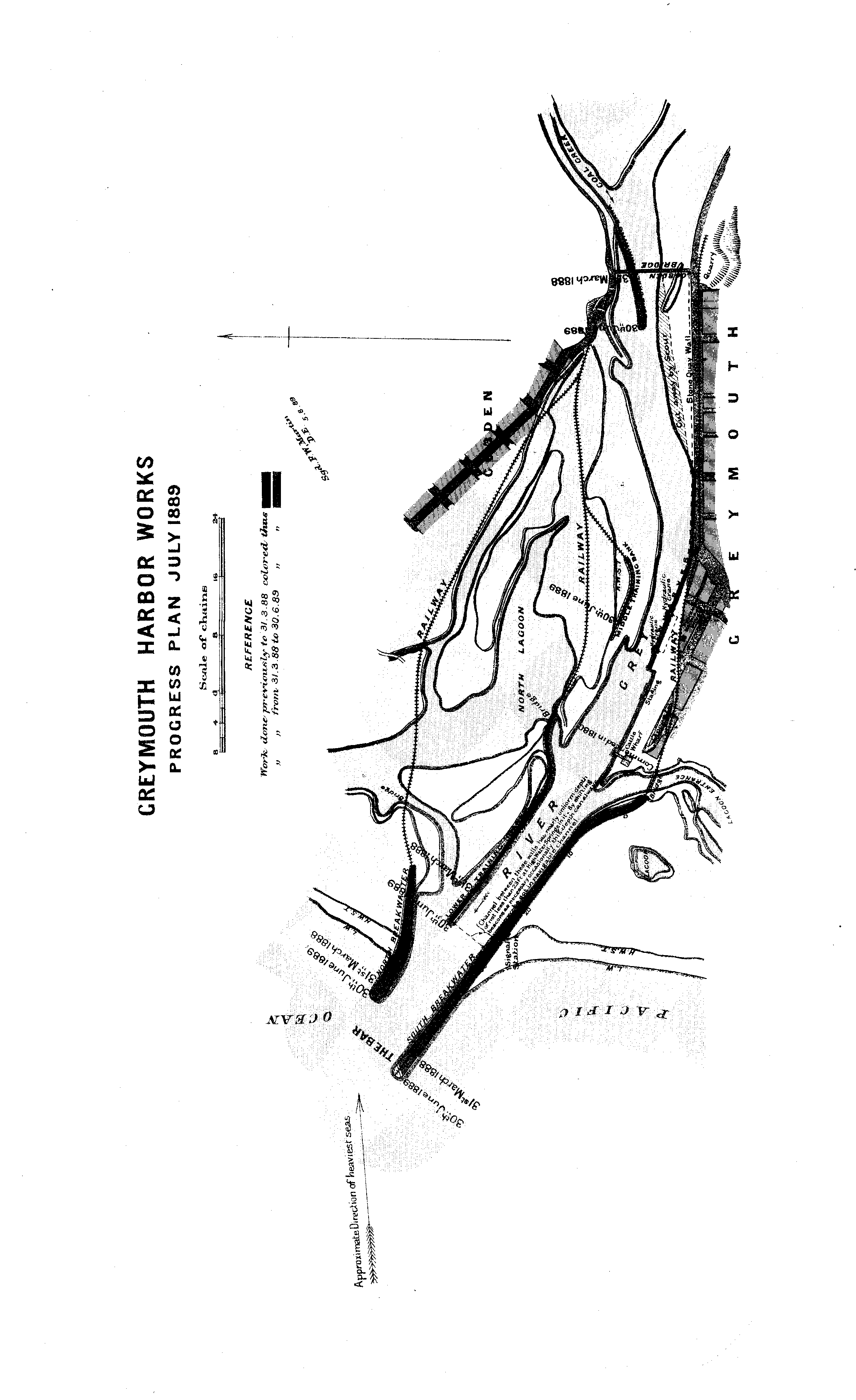 GREYMOUTH HARBOR WORKS PROGRESS PLAN JULY 1889 Scale of chains REFERENCE
