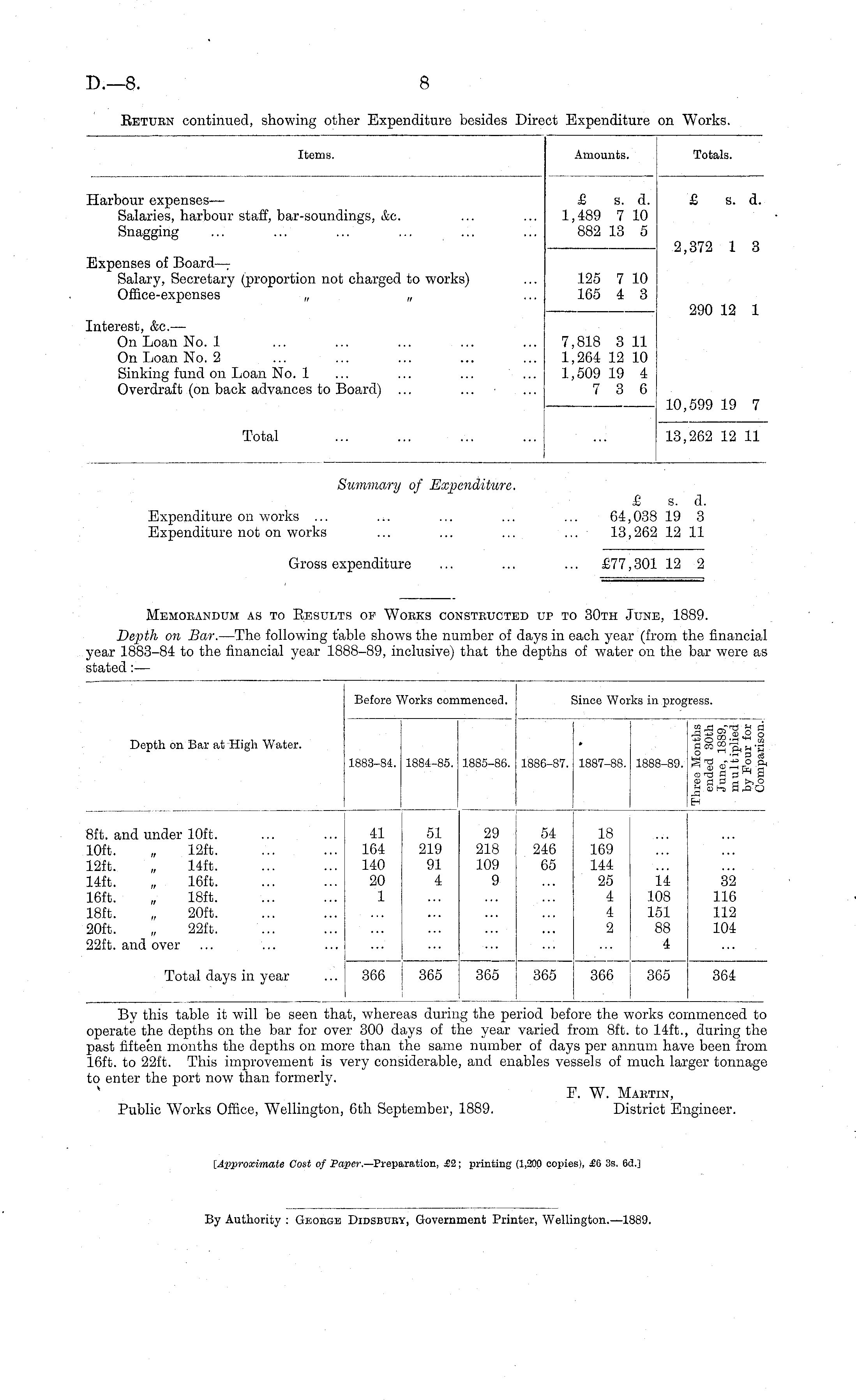 By this table it will be seen that, whereas during the period before the works commenced to operate the depths on the bar for over 300 days of the year varied from Bft. to 14ft., during the past fifteen months the depths on more than the same number of days per annum have been from 16ft. to 22ft. This improvement is very considerable, and enables vessels of much larger tonnage to enter the port now than formerly. F. W. Mahtin, Public Works Office, Wellington, 6th September, 1889. District Engineer. [Approximate Cost of Paper.— Preparation, £1 ; printing (1,200 copies), £6 3s. 63.]