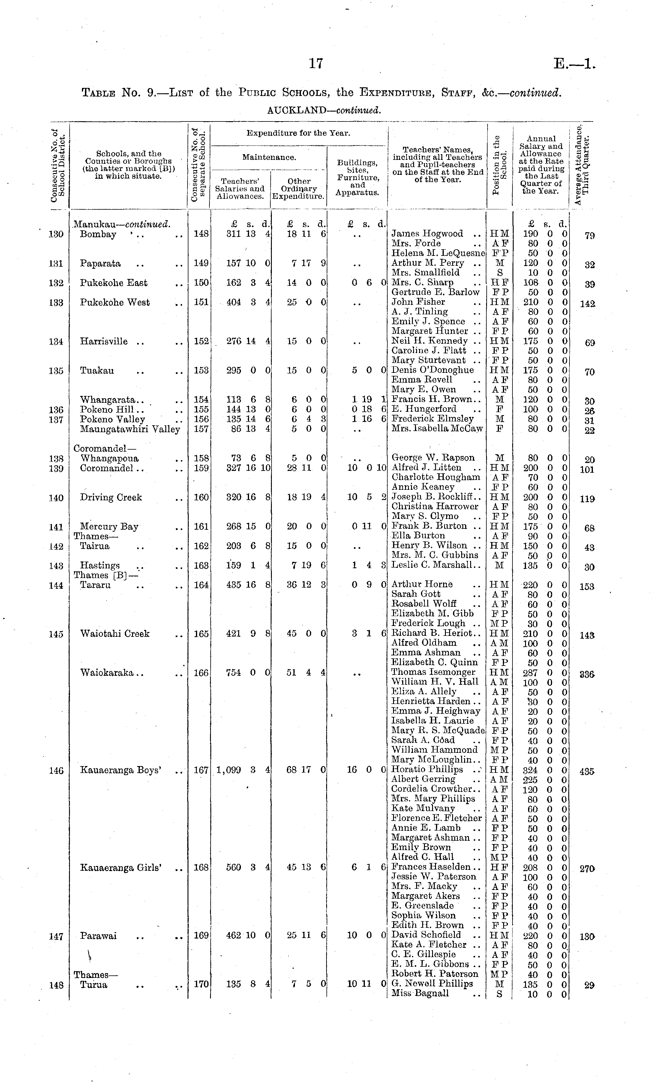 Table No. 9. —List of the Public Schools, the Expenditure, Staff, &c. — continued. AUCKLAND — continued.