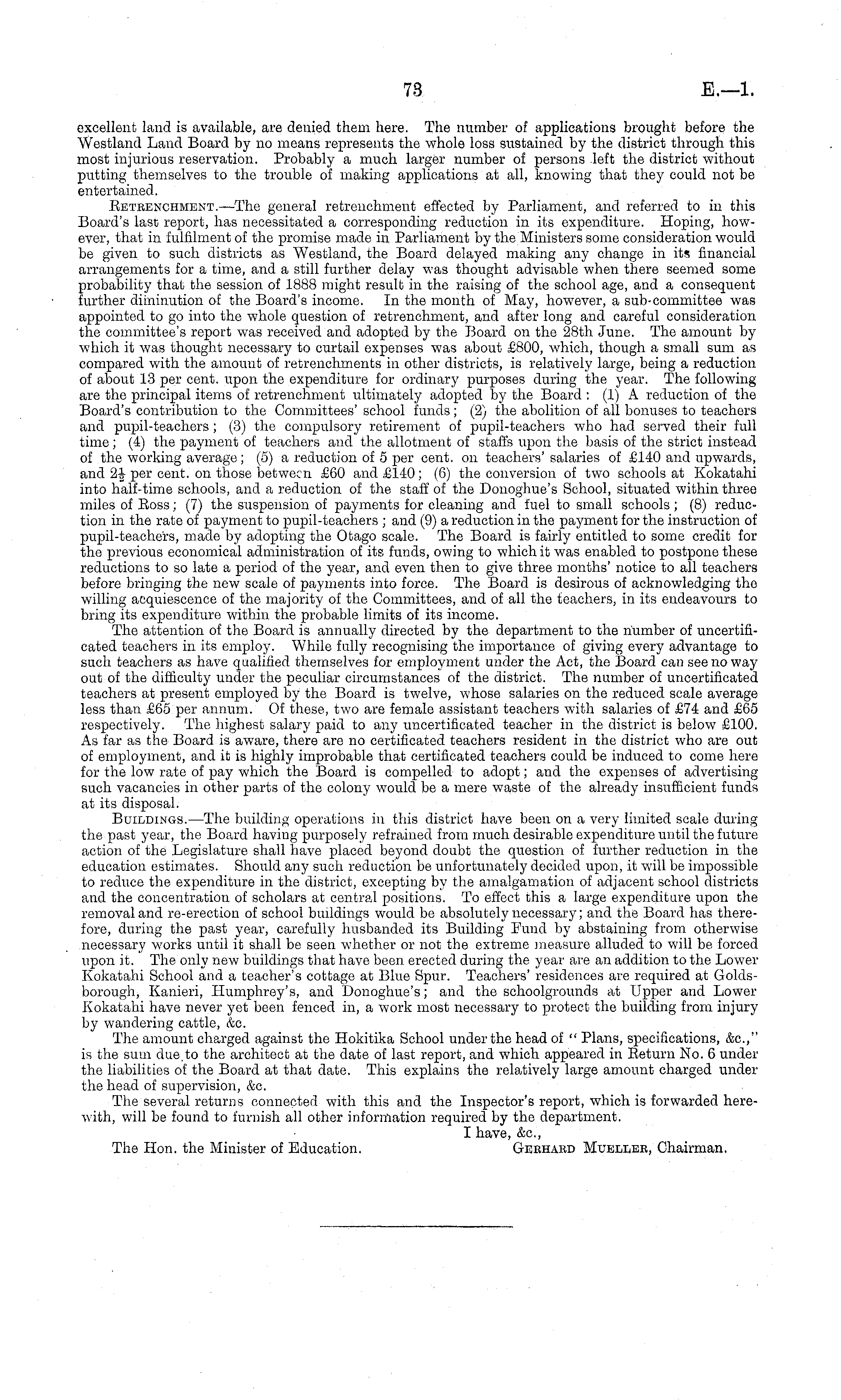 excellent land is available, are denied them here. The number of applications brought before the Westland Laud Board by no means represents the whole loss sustained by the district through this most injurious reservation. Brobably a much larger number of persons left the district without putting themselves to the trouble of making applications at all, knowing that they could not be entertained. Beteenchment. —The general retrenchment effected by Barliament, and referred to in this Board's last report, has necessitated a corresponding reduction in its expenditure. Hoping, however, that in fulfilment of the promise made in Barliament by the Ministers some consideration would be given to such districts as Westland, the Board delayed making any change in its financial arrangements for a time, and a still further delay was thought advisable when there seemed some probability that the session of 1888 might result in the raising of the school age, and a consequent further diminution of the Board's income. In the month of May, however, a sub-committee was appointed to go into the whole question of retrenchment, and after long and careful consideration the committee's report was received and adopted by the Board on the 28th June. The amount by which it was thought necessary to curtail expenses was about £800, which, though a small sum as compared with the amount of retrenchments in other districts, is relatively large, being a reduction of .about 13 per cent, upon the expenditure for ordinary purposes during the year. The following are the principal items of retrenchment ultimately adopted by the Board : (1) A reduction of the Board's contribution to the Committees' school funds; (2) the abolition of all bonuses to teachers and pupil-teachers ; (3) the compulsory retirement of pupil-teachers who had served their full time; (4) the payment of teachers and the allotment of staffs upon the basis of the strict instead of the working average; (5) a reduction of 5 per cent, on teachers' salaries of £140 and upwards, and 2-| per cent, on those between £60 and £140; (6) the conversion of two schools at Kokatahi into half-time schools, and a reduction of the staff of the Donoghue's School, situated within three miles of Boss; (7) the suspension of payments for cleaning and fuel to small schools ; (8) reduction in the rate of payment to pupil-teachers ; and (9) a reduction in the payment for the instruction of pupil-teachers, made by adopting the Otago scale. The Board is fairly entitled to some credit for the previous economical administration of its funds, owing to which it was enabled to postpone these reductions to so late a period of the year, and even then to give three months' notice to all teachers before bringing the new scale of payments into force. The Board is desirous of acknowledging the willing acquiescence of the majority of the Committees, and of all the teachers, in its endeavours to bring its expenditure within the probable limits of its income. The attention of the Board is annually directed by the department to the number of uncertificated teachers in its employ. While fully recognising the importance of giving every advantage to such teachers as have qualified themselves for employment under the Act, the Board can see no way out of the difficulty under the peculiar circumstances of the district. The number of uncertificated teachers at present employed by the Board is twelve, whose salaries on the reduced scale average less than £65 per annum. Of these, two are female assistant teachers with salaries of £74 and £65 respectively. The highest salary paid to any uncertificated teacher in the district is below £100. As far as the Board is aware, there are no certificated teachers resident in the district who are out of employment, and it is highly improbable that certificated teachers could be induced to come here for the low rate of pay which the Board is compelled to adopt; and the expenses of advertising such vacancies in other parts of the colony would be a mere waste of the already insufficient funds at its disposal. Buildings.—The building operations in this district have been on a very limited scale during the past year, the Board having purposely refrained from much desirable expenditure until the future action of the Legislature shall have placed beyond doubt the question of further reduction in the education estimates. Should any such reduction be unfortunately decided upon, it will be impossible to reduce the expenditure in the district, excepting by the amalgamation of adjacent school districts and the concentration of scholars at central positions. To effect this a large expenditure upon the removal and re-erection of school buildings would be absolutely necessary; and the Board has therefore, during the past year, carefully husbanded its Building Fund by abstaining from, otherwise necessary works until it shall be seen whether or not the extreme measure alluded to will be forced upon it. The only new buildings that have been erected during the year are an addition to the Lower Kokatahi School and a teacher's cottage at Blue Spur. Teachers' residences are required at Goldsborough, Kanieri, Humphrey's, and Donoghue's; and the schoolgrounds at Upper and Lower Kokatahi have never yet been fenced in, a work most necessary to protect the building from injury by wandering cattle, &c. The amount charged against the Hokitika School under the head of " Flans, specifications, &c," is the sum due,to the architect at the date of last report, and which appeared in Beturn No. 6 under the liabilities of the Board at that date. This explains the relatively large amount charged under the head of supervision, &c. The several returns connected with this and the Inspector's report, which is forwarded herewith, will be found to furnish all other information required by the department. I have, &c, The Hon. the Minister of Education. Geehaed Muellee, Chairman.