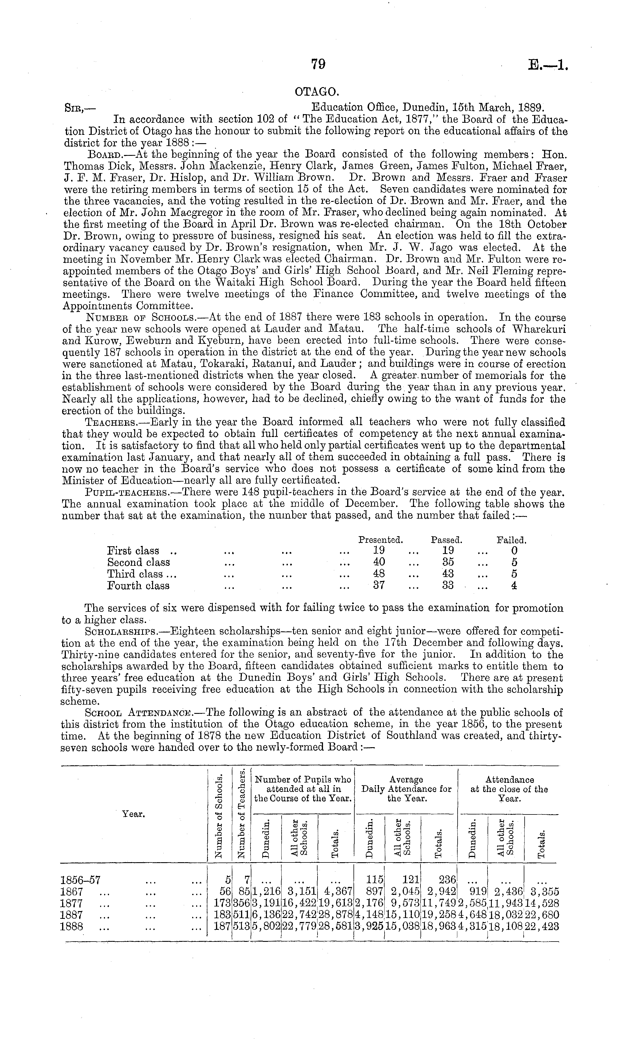 OTAGO. Sie, — Education Office, Dunedin, 15th March, 1889. In accordance with section 102 of " The Education Act, 1877," the Board of the Education District of Otago has the honour to submit the following report on the educational affairs of the district for the year 1888 : — Boaed.—At the beginning of the year the Board consisted of the following members: Hon. Thomas Dick, Messrs. John Mackenzie, Henry Clark, James Green, James Fulton, Michael Fraer, J. F. M. Praser, Dr. Hislop, and Dr. William Brown. Dr. Brown and Messrs. Fraer and Fraser were the retiring members in terms of section 15 of the Act. Seven candidates were nominated for the three vacancies, and the voting resulted in the re-election of Dr. Brown and Mr. Fraer, and the election of Mr. John Macgregor in the room of Mr. Fraser, who declined being again nominated. At the first meeting of the Board in April Dr. Brown was re-elected chairman. On the 18th October Dr. Brown, owing to pressure of business, resigned his seat. An election was held to fill the extraordinary vacancy caused by Dr. Brown's resignation, when Mr. J. W. Jago was elected. At the meeting in November Mr. Henry Clark was elected Chairman. Dr. Brown and Mr. Fulton were reappointed members of the Otago Boys' and Girls' High School Board, and Mr. Neil Fleming representative of the Board on the Waitaki High School Board. During the year the Board held fifteen meetings. There were twelve meetings of the Finance Committee, and twelve meetings of the Appointments Committee. Numbeb of Schools. —At the end of 1887 there were 183 schools in operation. In the course of the year new schools were opened at Lauder and Matau. The half-time schools of Wharekuri and Kurow, Eweburn and Kyebum, have been erected into full-time schools. There were consequently 187 schools in operation in the district at the end of the year. During the year new schools were sanctioned at Matau, Tokaraki, Eatanui, and Lauder ; and buildings were in course of erection in the three last-mentioned districts when the year closed. A greater, number of memorials for the establishment of schools were considered by the Board during the year than in any previous year. Nearly all the applications, however, had to be declined, chiefly owing to the want of funds for the erection of the buildings. Teachbes. —Early in the year the Board informed all teachers who were not fully classified that they would be expected to obtain full certificates of competency at the next annual examination. It is satisfactory to find that all who held only partial certificates went up to the departmental examination last January, and that nearly all of them succeeded in obtaining a full pass. There is now no teacher in the Board's service who does not possess a certificate of some kind from the Minister of Education—nearly all are fully certificated. PupiL-TEACHBES.—There were 148 pupil-teachers in the Board's service at the end of the year. The annual examination took place at the middle of December. The following table shows the number that sat at the examination, the number that passed, and the number that failed : — Presented. Passed. Failed. First class .. ... ... ... 19 ... 19 ... 0 Second class ... ... ... 40 ... 35 ... 5 Third class... ... ... ... 48 ... 43 ... 5 Fourth class ... ... ... 37 ... 33 ... 4 The services of six were dispensed with for failing twice to pass the examination for promotion to a higher class. Scholarships.—Eighteen scholarships—ten senior and eight junior—were offered for competition at the end of the year, the examination being held on the 17th December and following days. Thirty-nine candidates entered for the senior, and seventy-five for the junior. In addition to the scholarships awarded by the Board, fifteen candidates obtained sufficient marks to entitle them to three years' free education at the Dunedin Boys' and Girls' High Schools. There are at present fifty-seven pupils receiving free education at the High Schools in connection with the scholarship scheme. School Attendance.—The following is an abstract of the attendance at the public schools of this district from the institution of the Otago education scheme, in the year 1856, to the present time. At the beginning of 1878 the new Education District of Southland was created, and thirtyseven schools were handed over to the newly-formed Board:—■