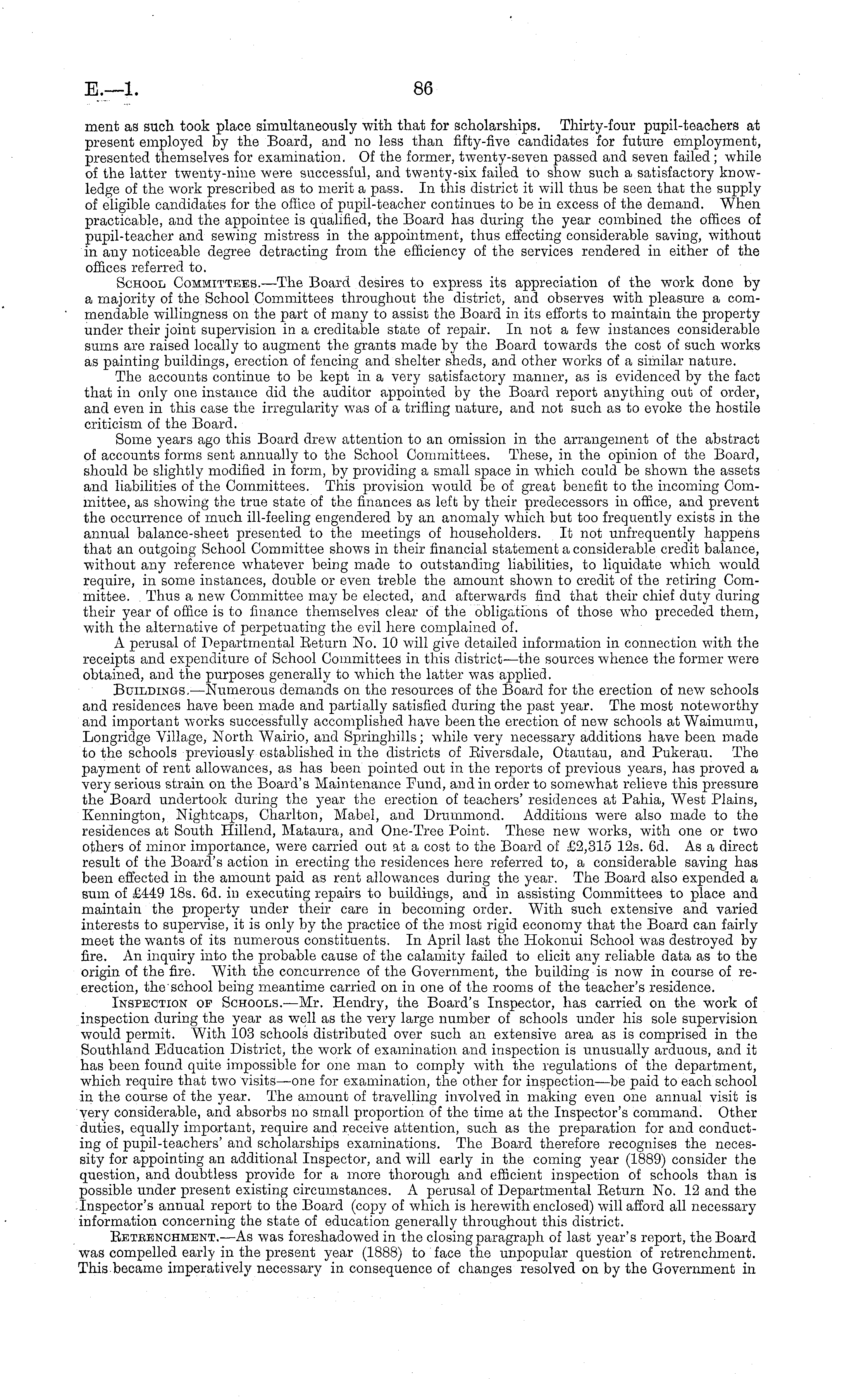ment as such took place simultaneously with that for scholarships. Thirty-four pupil-teachers at present employed by the Board, and no less than fifty-five candidates for future employment, presented themselves for examination. Of the former, twenty-seven passed and seven failed; while of the latter twenty-nine were successful, and twenty-six failed to show such a satisfactory knowledge of the work prescribed as to merit a pass. In this district it will thus be seen that the supply of eligible candidates for the office of pupil-teacher continues to be in excess of the demand. When practicable, and the appointee is qualified, the Board has during the year combined the offices of pupil-teacher and sewing mistress in the appointment, thus effecting considerable saving, without in any noticeable degree detracting from the efficiency of the services rendered in either of the offices referred to. School Committees. —The Board desires to express its appreciation of the work done by a majority of the School Committees throughout the district, and observes with pleasure a commendable willingness on the part of many to assist the Board in its efforts to maintain the property under their joint supervision in a creditable state of repair. In not a few instances considerable sums are raised locally to augment the grants made by the Board towards the cost of such works as painting buildings, erection of fencing and shelter sheds, and other works of a similar nature. The accounts continue to be kept in a very satisfactory manner, as is evidenced by the fact that in only one instance did the auditor appointed by the Board report anything out of order, and even in this case the irregularity was of a trifling nature, and not such as to evoke the hostile criticism of the Board. Some years ago this Board drew attention to an omission in the arrangement of the abstract of accounts forms sent annually to the School Committees. These, in the opinion of the Board, should be slightly modified in form, by providing a small space in which could be shown the assets and liabilities of the Committees. This provision would be of great benefit to the incoming Committee, as showing the true state of the finances as left by their predecessors in office, and prevent the occurrence of much ill-feeling engendered by an anomaly which but too frequently exists in the annual balance-sheet presented to the meetings of householders. It not unfrequently happens that an outgoing School Committee shows in their financial statement a considerable credit balance, without any reference whatever being made to outstanding liabilities, to liquidate which would require, in some instances, double or even treble the amount shown to credit of the retiring Committee. Thus a new Committee may be elected, and afterwards find that their chief duty during their year of office is to finance themselves clear of the obligations of those who preceded them, with the alternative of perpetuating the evil here complained of. A perusal of Departmental Return No. 10 will give detailed information in connection with the receipts and expenditure of School Committees in this district—the sources whence the former were obtained, and the purposes generally to which the latter was applied. Buildings.—Numerous demands on the resources of the Board for the erection of new schools and residences have been made and partially satisfied during the past year. The most noteworthy and important works successfully accomplished have been the erection of new schools at Waimumu, Longridge Village, North Wairio, and Springhills; while very necessary additions have been made to the schools previously established in the districts of Biversdale, Otautau, and Bukerau. The payment of rent allowances, as has been pointed out in the reports of previous years, has proved a very serious strain on the Board's Maintenance Fund, and in order to somewhat relieve this pressure the Board undertook during the year the erection of teachers' residences at Bahia, West Blains, Kennington, Nightcaps, Charlton, Mabel, and Drummond. Additions were also made to the residences at South Hillend, Mataura, and One-Tree Boint. These new works, with one or two others of minor importance, were carried out at a cost to the Board of £2,315 12s. 6d. As a direct result of the Board's action in erecting the residences here referred to, a considerable saving has been effected in the amount paid as rent allowances during the year. The Board also expended a sum of £449 18s. 6d. in executing repairs to buildings, and in assisting Committees to place and maintain the property under their care in becoming order. With such extensive and varied interests to supervise, it is only by the practice of the most rigid economy that the Board can fairly meet the wants of its numerous constituents. In April last the Hokonui School was destroyed by fire. An inquiry into the probable cause of the calamity failed to elicit any reliable data as to the origin of the fire. With the concurrence of the Government, the building is now in course of reerection, the school being meantime carried on in one of the rooms of the teacher's residence. Inspection op Schools.—Mr. Hendry, the Board's Inspector, has carried on the work of inspection during the year as well as the very large number of schools under his sole supervision would permit. With 103 schools distributed over such an extensive area as is comprised in the Southland Education District, the work of examination and inspection is unusually arduous, and it has been found quite impossible for one man to comply with the regulations of the department, which require that two visits —one for examination, the other for inspection—be paid to each school in the course of the year. The amount of travelling involved in making even one annual visit is very considerable, and absorbs no small proportion of the time at the Inspector's command. Other duties, equally important, requir