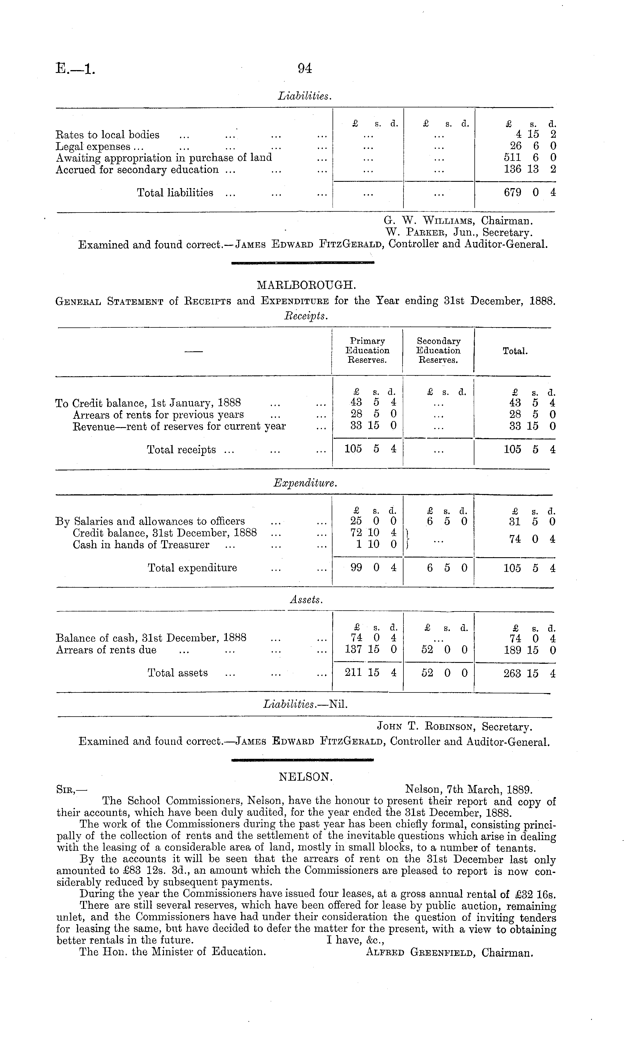 NELSON. Sic,— Nelson, 7th March, 1889. The School Commissioners, Nelson, have the honour to present their report and copy of their accounts, which have been duly audited, for the year ended the 31st December, 1888. The work of the Commissioners during the past year has been chiefly formal, consisting principally of the collection of rents and the settlement of the inevitable questions which arise in dealing with the leasing of a considerable area of land, mostly in small blocks, to a number of tenants. By the accounts it will be seen that the arrears of rent on the 31st December last only amounted to £83 12s. 3d., an amount which the Commissioners are pleased to report is now considerably reduced by subsequent payments. During the year the Commissioners have issued four leases, at a gross annual rental of £32 16s. There are still several reserves, which have been offered for lease by public auction, remaining unlet, and the Commissioners have had under their consideration the question of inviting tenders for leasing the same, but have decided to defer the matter for the present, with a view to obtaining better rentals in the future. I have, &c, The Hon. the Minister of Education. Alfeed Geeenpield, Chairman.