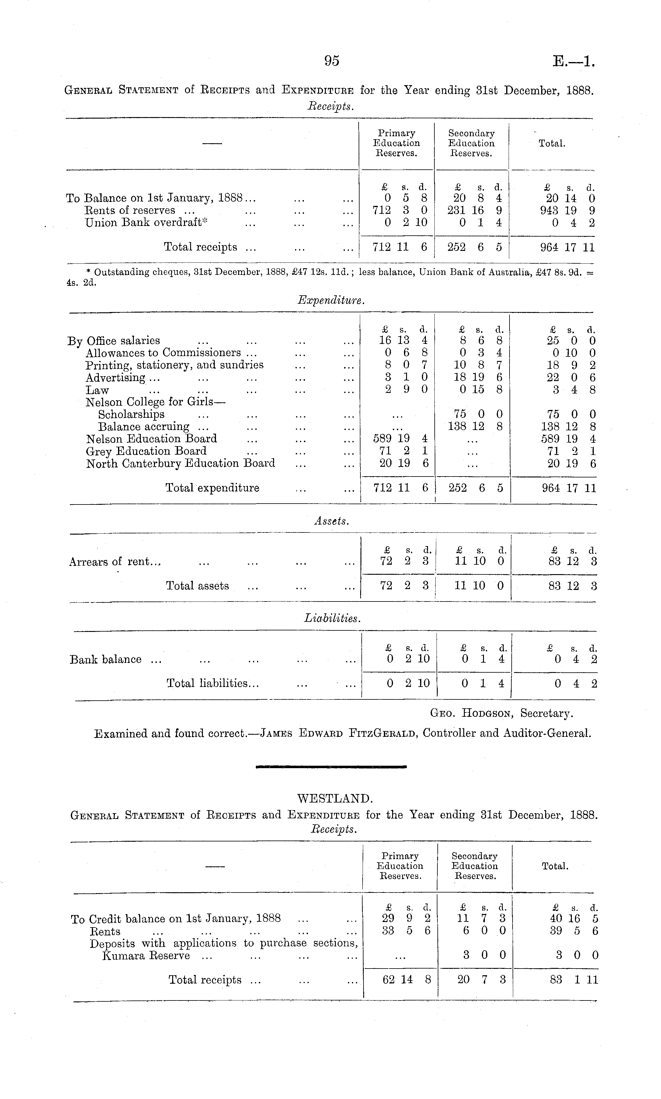 Receipts. Primary Education Eeserves. Secondary Education Eeserves. Total. 'o Balance on 1st January, 1888 ... Eents of reserves ... Union Bank overdraft" £ 0 712 0 s. a. 5 8 3 0 2 10 £ s. a. 20 8 4 231 16 9 0 14 £ s. 20 14 943 19 0 4 a. 0 9 2 Total receipts ... 712 11 6 252 6 5 964 17 11 * Outstanaing cheques, 31st December, 1888, £47 12s. 1M.; 4s. 2d. .ess balance, Uii ion Bank of Australia, £47 8s. 9d. = Expendituri By Office salaries Allowances to Commissioners ... Printing, stationery, and sundries Advertising ... Law Nelson College for Girls— Scholarships Balance accruing ... Nelson Education Board Grey Education Board North Canterbury Education Board £ s. 16 13 0 6 8 0 3 1 2 9 a. 4 8 7 0 0 £ s. 8 6 0 3 10 8 18 19 0 15 a. 8 4 7 6 8 £ s. 25 0 0 10 18 9 22 0 3 4 a. 0 0 2 6 8 75 0 138 12 0 8 75 0 138 12 589 19 71 2 20 19 0 8 4 1 6 589 19 71 2 20 19 4 1 6 Total expenditure 712 11 6 252 6 5 964 17 11 Assets. Arrears of rent... Total assets £ 72 72 s. a. 2 3 2 3 j £ s. 11 10 11 10 a. 0 0 £ s. 83 12 a. 3 83 12 8 Liabilities. Bank balance ... Total liabilities... £ 0 0 s. a. 2 10 2 10 £ 0 s. 1 a. 4 0 s. 4 a. 2 0 2 10 0 1 4 0 4 2