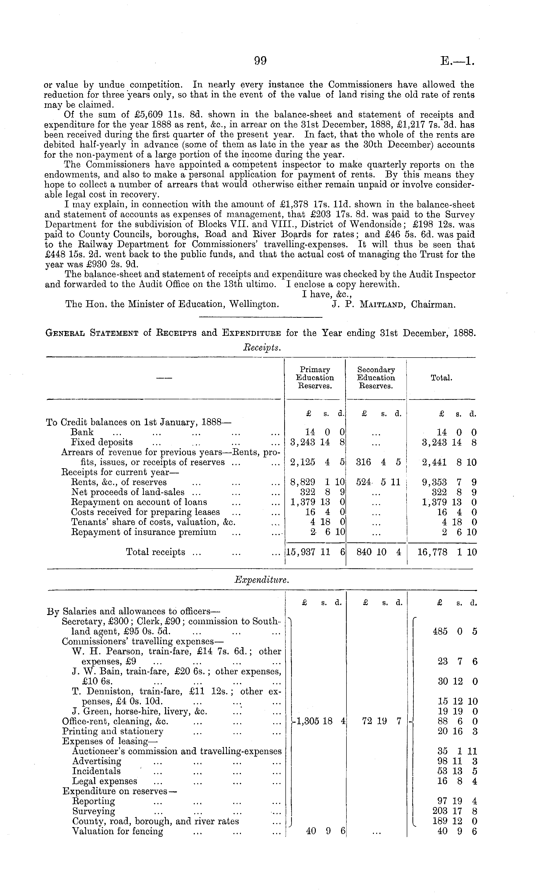 or value by undue competition. In nearly every instance the Commissioners have allowed the reduction for three years only, so that in the event of the value of land rising the old rate of rents may be claimed. Of the sum of £5,609 lis. Bd. shown in the balance-sheet and statement of receipts and expenditure for the year 1888 as rent, &c, in arrear on the 31st December, 1888, £1,217 7s. 3d. has been received during the first quarter of the present year. In fact, that the whole of the rents are debited half-yearly in advance (some of them as late in the year as the 30th December) accounts for the non-payment of a large portion of the income during the year. The Commissioners have appointed a competent inspector to make quarterly reports on the endowments, and also to make a personal application for payment of rents. By this means they hope to collect a number of arrears that would otherwise either remain unpaid or involve considerable legal cost in recovery. I may explain, in connection with the amount of £1,378 17s. lid. shown in the balance-sheet and statement of accounts as expenses of management, that £203 17s. Bd. was paid to the Survey Department for the subdivision of Blocks VII. and VIII., District of Wendonside; £198 12s. was paid to County Councils, boroughs, Boad and Biver Boards for rates; and £46 ss. 6d. was paid to the Eailway Department for Commissioners' travelling-expenses. It will thus be seen that £448 15s. 2d. went back to the public funds, and that the actual cost of managing the Trust for the year was £930 2s. 9d. The balance-sheet and statement of receipts and expenditure was checked by the Audit Inspector and forwarded to the Audit Office on the 13th ultimo. I enclose a copy herewith. I have, &c, The Hon. the Minister of Education, Wellington. J. B. Maitland, Chairman.