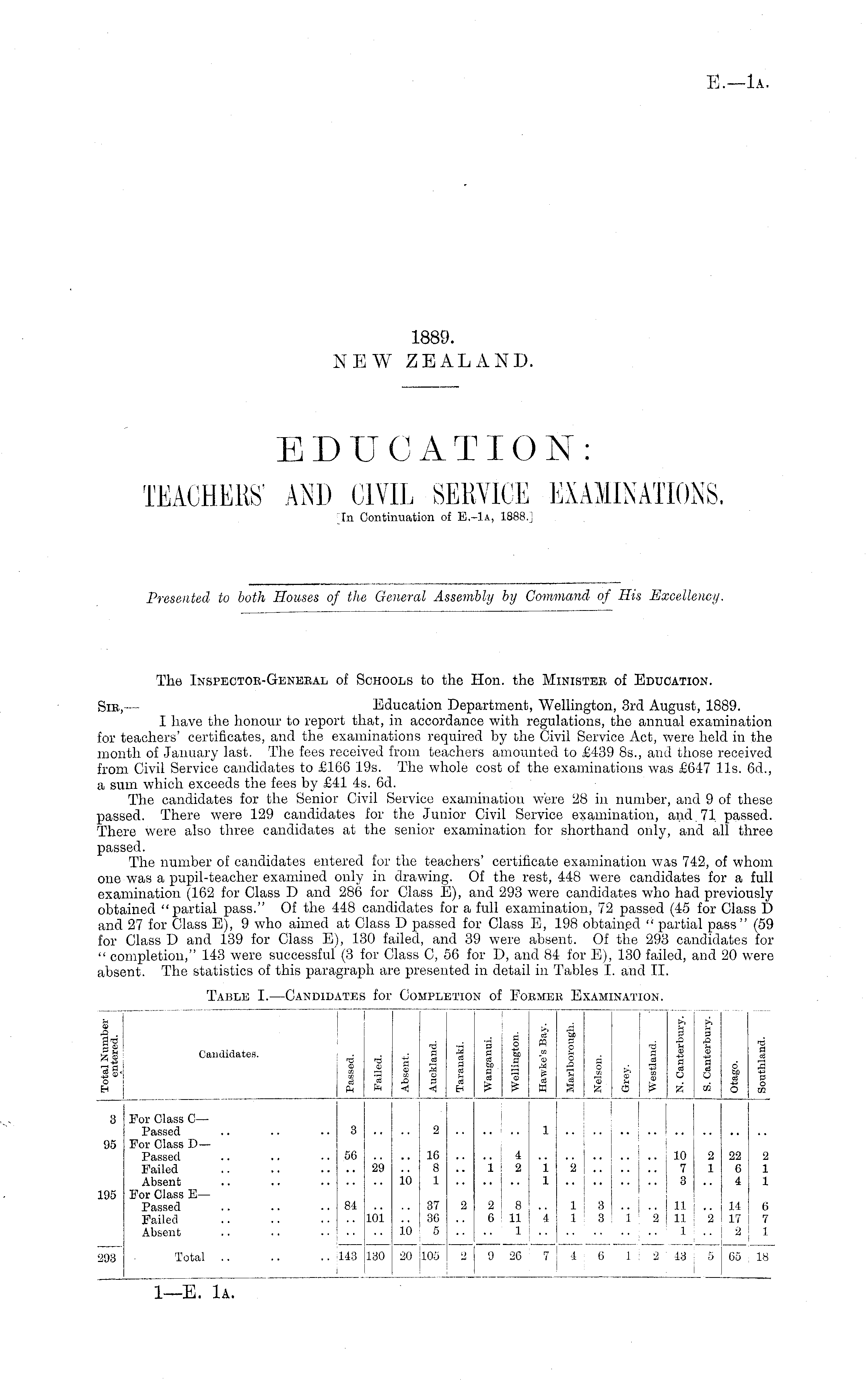 The Inspector-General of Schools to the Hon. the Minister of Education. Sib, — Education Department, Wellington, 3rd August, 1889. I have the honour to report that, in accordance with regulations, the annual examination for teachers' certificates, and the examinations required by the Civil Service Act, were held in the month of January last. The fees received from teachers amounted to £439 Bs., and those received from Civil Service candidates to £166 19s. The whole cost of the examinations was £647 11s. 6d., a sum which exceeds the fees by £41 4s. 6d. The candidates for the Senior Civil Service examination were 28 in number, and 9 of these passed. There were 129 candidates for the Junior Civil Service examination, and. 71 passed. There were also three candidates at the senior examination for shorthand only, and all three passed. The number of candidates entered for the teachers' certificate examination was 742, of whom one was a pupil-teacher examined only in drawing. Of the rest, 448 were candidates for a full examination (162 for Class D and 286 for Class E), and 293 were candidates who had previously obtained "partial pass." Of the 448 candidates for a full examination, 72 passed (45 for Class D and 27 for Class E), 9 who aimed at Class D passed for Class E, 198 obtained " partial pass" (59 for Class D and 139 for Class E), 130 failed, and 39 were absent. Of the 293 candidates for " completion," 143 were successful (3 for Class C, 56 for D, and 84 for E), 130 failed, and 20 were absent. The statistics of this paragraph are presented in detail in Tables I. and 11.