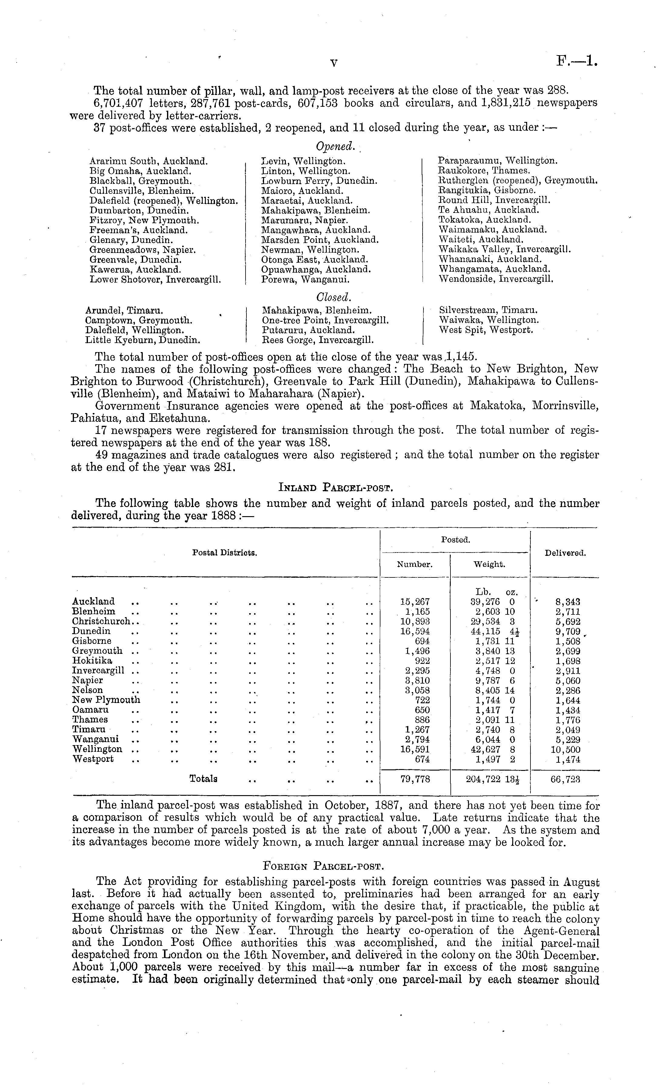 The total number of pillar, wall, and lamp-post receivers at the close of the year was 288. 6,701,407 letters, 287,761 post-cards, 607,153 books and circulars, and 1,831,215 newspapers were delivered by letter-carriers. 37 post-offices were established, 2 reopened, and 11 closed during the year, as under : — Opened. Ararimu South, Auckland. Levin, Wellington. Paraparaumu, Wellington. Big Omaha, Auckland. Linton, Wellington. Raukokore, Thames. Blackball, Greymouth. Lowburn Ferry, Dunedin. Ruthcrglen (reopened), Greymouth. Cullensville, Blenheim. Maioro, Auckland. Rangitukia, Gisborne. Dalefield (reopened), Wellington. Maraetai, Auckland. Round Hill, Invercargill. Dumbarton, Dunedin. Mahakipawa, Blenheim. Te Ahualra, Auckland. Fitzroy, New Plymouth. Marumaru, Napier. Tokatoka, Auckland. Freeman's, Auckland. . Mangawhara, Auckland. Waimamaku, Auckland. Glenary, Dunedin. Marsden Point, Auckland. Waiteti, Auckland. Greenmeadows, Napier. Newman, Wellington. Waikaka Valley, Invercargill. Greenvale, Dunedin. Otonga East, Auckland. Whananaki, Auckland. Kawerua, Auckland. Opuawhanga, Auckland. Whangamata, Auckland. Lower Shotover, Invercargill. Porewa, Wanganui. Wendonside, Invercargill. Closed. Arundel, Timaru. Mahakipawa, Blenheim. Silverstream, Timaru. Camptown, Greymouth. One-tree Point, Invercargill. Waiwaka, Wellington. Dalefield, Wellington. Putaruru, Auckland. West Spit, Westport. Little Kyeburn, Dunedin. Rees Gorge, Invercargill. The total number of post-offices open at the close of the year was ,1,145. The names of the following post-offices were changed : The Beach to New Brighton, New Brighton to Burwood (Christchurch), Greenvale to Park Hill (Dunedin), Mahakipawa to Cullensville (Blenheim), and Mataiwi to Maharahara (Napier). Government Insurance agencies were opened at the post-offices at Makatoka, Morrinsville, Pahiatua, and Eketahuna. 17 newspapers were registered for transmission through the post. The total number of registered newspapers at the end of the year was 188. 49 magazines and trade catalogues were also registered ; and the total number on the register at the end of the year was 281. Inland Paecel-post. The following table shows the number and weight of inland parcels posted, and the number delivered, during the year 1888 :—