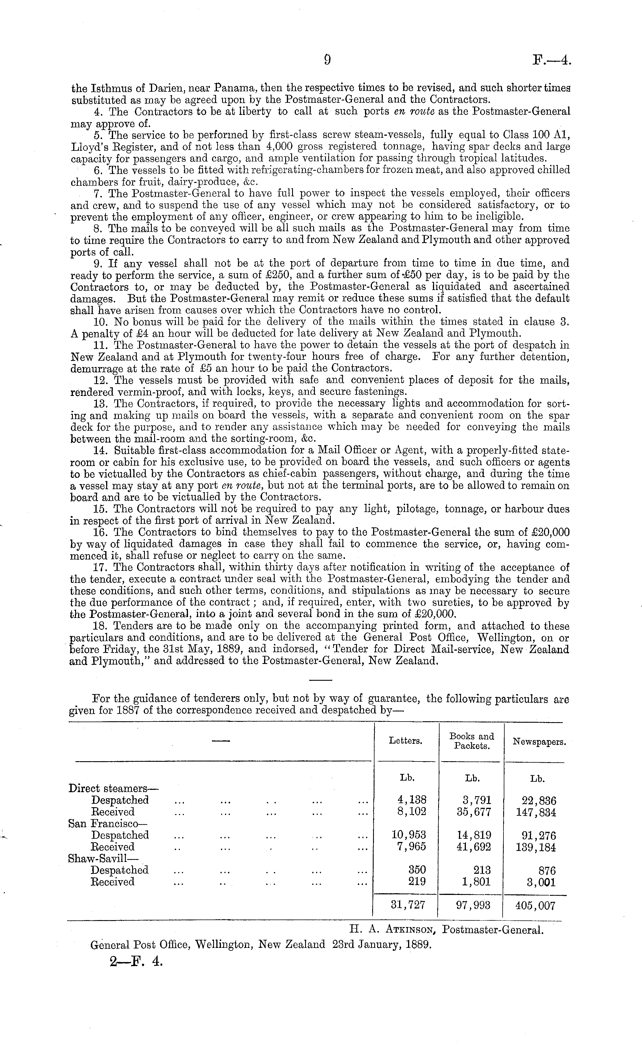 the Isthmus of Darien, near Panama, then the respective times to be revised, and such shorter times substituted as may be agreed upon by the Postmaster-General and the Contractors. 4. The Contractors to be at liberty to call at such ports en route as the Postmaster-General may approve of. 5. The service to be performed by first-class screw steam-vessels, fully equal to Class 100 Al, Lloyd's Eegister, and of not less than 4,000 gross registered tonnage, having spar decks and large capacity for passengers and cargo, and ample ventilation for passing through tropical latitudes. 6. The vessels to be fitted with refrigerating-chambers for frozen meat, and also approved chilled chambers for fruit, dairy-produce, &c. 7. The Postmaster-General to have full power to inspect the vessels employed, their officers and crew, and to suspend the use of any vessel which may not be considered satisfactory, or to prevent the employment of any officer, engineer, or crew appearing to him to be ineligible. 8. The mails to be conveyed will be all such mails as the Postmaster-General may from time to time require the Contractors to carry to and from New Zealand and Plymouth and other approved ports of call. 9. If any vessel shall not be at the port of departure from time to time in due time, and ready to perform the service, a sum of £250, and a further sum of -£50 per day, is to be paid by the Contractors to, or may be deducted by, the Postmaster-General as liquidated and ascertained damages. But the Postmaster-General may remit or reduce these sums if satisfied that the default shall have arisen from causes over which the Contractors have no control. 10. No bonus will be paid for the delivery of the mails within the times stated in clause 3. A penalty of £4 an hour will be deducted for late delivery at New Zealand and Plymouth. 11. The Postmaster-General to have the power to detain the vessels at the port of despatch in New Zealand and at Plymouth for twenty-four hours free of charge. For any further detention, demurrage at the rate of £5 an hour to be paid the Contractors. 12. The vessels must be provided with safe and convenient places of deposit for the mails, rendered vermin-proof, and with locks, keys, and secure fastenings. 13. The Contractors, if required, to provide the necessary lights and accommodation for sorting and making up mails on board the vessels, with a separate and convenient room on the spar deck for the purpose, and to render any assistance which may be needed for conveying the mails between the mail-room and the sorting-room, &c. 14. Suitable first-class accommodation for a Mail Officer or Agent, with a properly-fitted stateroom or cabin for his exclusive use, to be provided on board the vessels, and such officers or agents to be victualled by the Contractors as chief-cabin passengers, without charge, and during the time a vessel may stay at any port en route, but not at the terminal ports, are to be allowed to remain on board and are to be victualled by the Contractors. 15. The Contractors will not be required to pay any light, pilotage, tonnage, or harbour dues in respect of the first port of arrival in New Zealand. 16. The Contractors to bind themselves to pay to the Postmaster-General the sum of £20,000 by way of liquidated damages in case they shall fail to commence the service, or, having commenced it, shall refuse or neglect to carry on the same. 17. The Contractors shall, within thirty days after notification in writing of the acceptance of the tender, execute a contract under seal with the Postmaster-General, embodying the tender and these conditions, and such other terms, conditions, and stipulations as may be necessary to secure the due performance of the contract; and, if required, enter, with two sureties, to be approved by the Postmaster-General, into a joint and several bond in the sum of £20,000. 18. Tenders are to be made only on the accompanying printed form, and attached to these particulars and conditions, and are to be delivered at the General Post Office, Wellington, on or before Friday, the 31st May, 1889, and indorsed, "Tender for Direct Mail-service, New Zealand and Plymouth," and addressed to the Postmaster-General, New Zealand. For the guidance of tenderers only, but not by way of guarantee, the following particulars are given for 1887 of the correspondence received and despatched by—