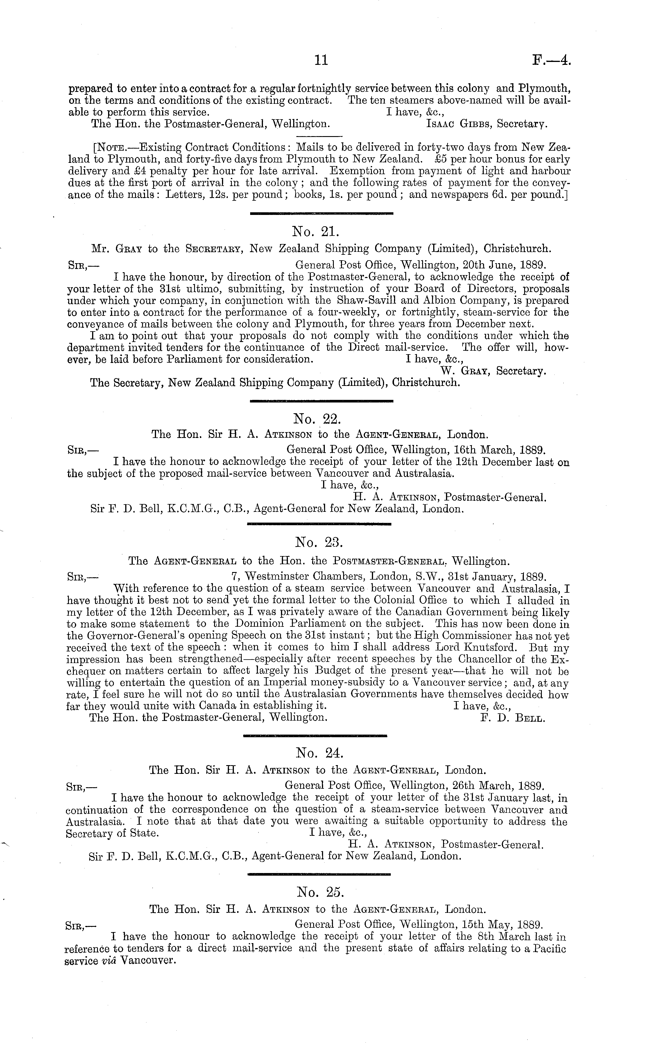 No. 22. The Hon. Sir H. A. Atkinson to the Agent-General, London. Sir,— General Post Office, Wellington, 16th March, 1889. I have the honour to acknowledge the receipt of your letter of the 12th December last on the subject of the proposed mail-service between Vancouver and Australasia. I have, &c, H. A. Atkinson, Postmaster-General. Sir F. D. Bell, K.C.M.G., C.8., Agent-General for New Zealand, London.