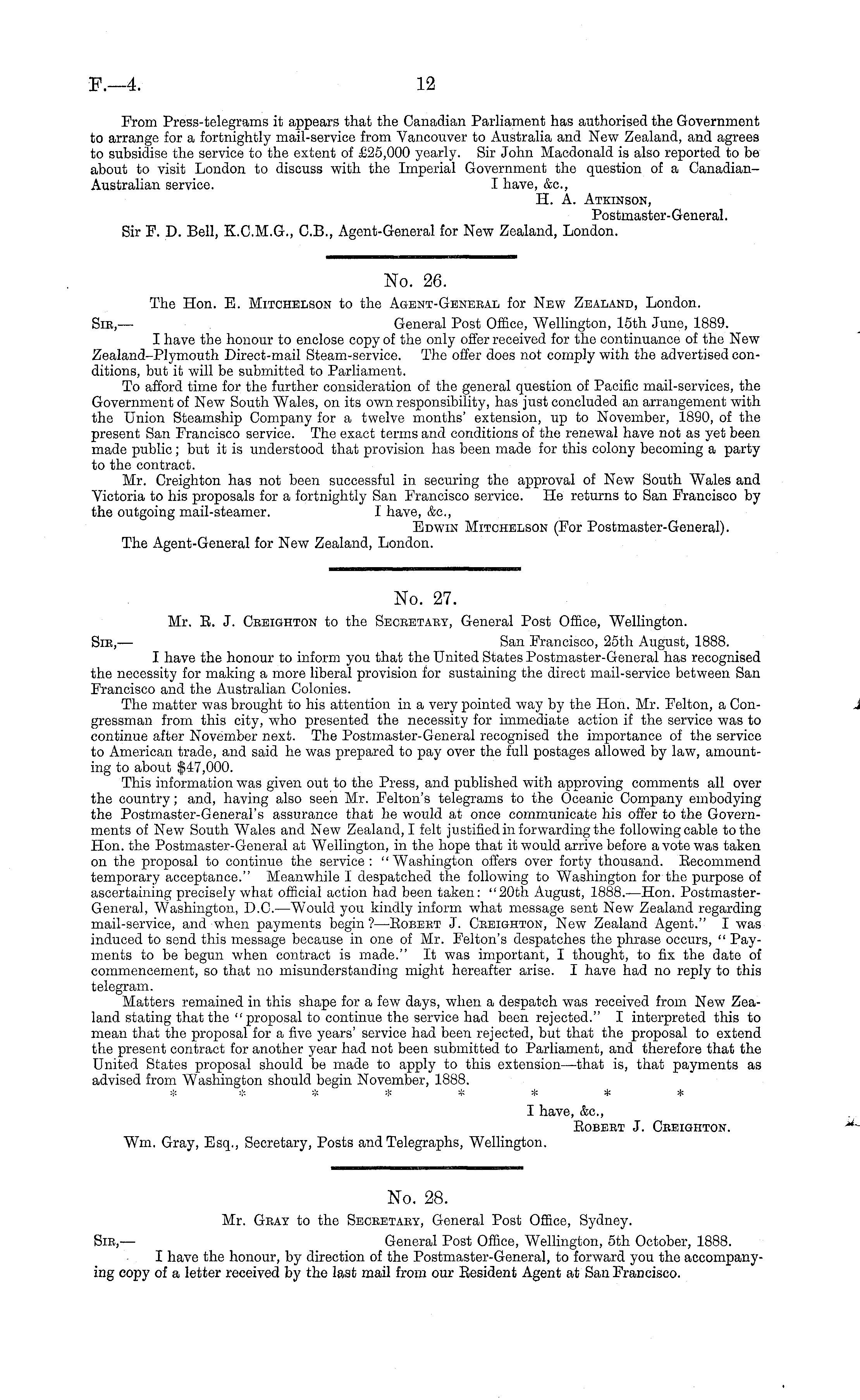 No. 26. The Hon. E. Mitchelson to the Agent-General for New Zealand, London. Sir,' — General Post Office, Wellington, 15th June, 1889. I have the honour to enclose copy of the only offer received for the continuance of the New Zealand-Plymouth Direct-mail Steam-service. The offer does not comply with the advertised conditions, but it will be submitted to Parliament. To afford time for the further consideration of the general question of Pacific mail-services, the Government of New South Wales, on its own responsibility, has just concluded an arrangement with the Union Steamship Company for a twelve months' extension, up to November, 1890, of the present San Francisco service. The exact terms and conditions of the renewal have not as yet been made public; but it is understood that provision has been made for this colony becoming a party to the contract. Mr. Creighton has not been successful in securing the approval of New South Wales and Victoria to his proposals for a fortnightly San Francisco service. He returns to San Francisco by the outgoing mail-steamer. I have, &c, Edwin Mitchelson (For Postmaster-General). The Agent-General for New Zealand, London.