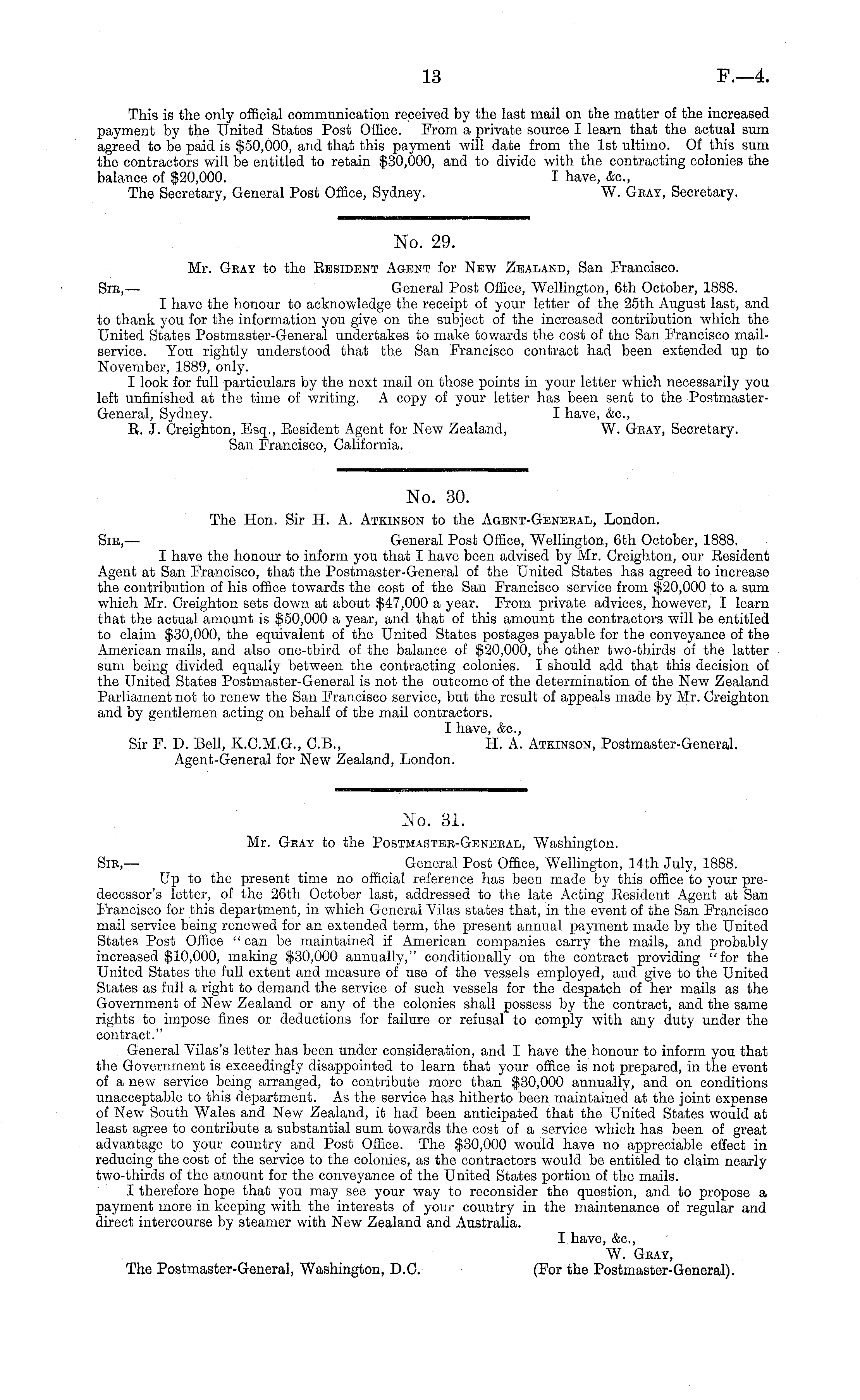 No. 31. Mr. Gray to the Postmaster-General, Washington. Sir,— General Post Office, Wellington, 14th July, 1888. Up to the present time no official reference has been made by this office to your predecessor's letter, of the 26th October last, addressed to the late Acting Eesident Agent at San Francisco for this department, in which General Vilas states that, in the event of the San Francisco mail service being renewed for an extended term, the present annual payment made by the United States Post Office "can be maintained if American companies carry the mails, and probably increased $10,000, making $30,000 annually," conditionally on the contract providing "for the United States the full extent and measure of use of the vessels employed, and give to the United States as full a right to demand the service of such vessels for the despatch of her mails as the Government of New Zealand or any of the colonies shall possess by the contract, and the same rights to impose fines or deductions for failure or refusal to comply with any duty under the contract." General Vilas's letter has been under consideration, and I have the honour to inform you that the Government is exceedingly disappointed to learn that your office is not prepared, in the event of a new service being arranged, to contribute more than $30,000 annually, and on conditions unacceptable to this department. As the service has hitherto been maintained at the joint expense of New South Wales and New Zealand, it had been anticipated that the United States would at least agree to contribute a substantial sum towards the cost of a service which has been of great advantage to your country and Post Office. The $30,000 would have no appreciable effect in reducing the cost of the service to the colonies, as the contractors would be entitled to claim nearly two-thirds of the amount for the conveyance of the United States portion of the mails. I therefore hope that you may see your way to reconsider the question, and to propose a payment more in keeping with the interests of your country in the maintenance of regular and direct intercourse by steamer with New Zealand and Australia. I have, &c, W. Gray, The Postmaster-General, Washington, D.C. (For the Postmaster-General).