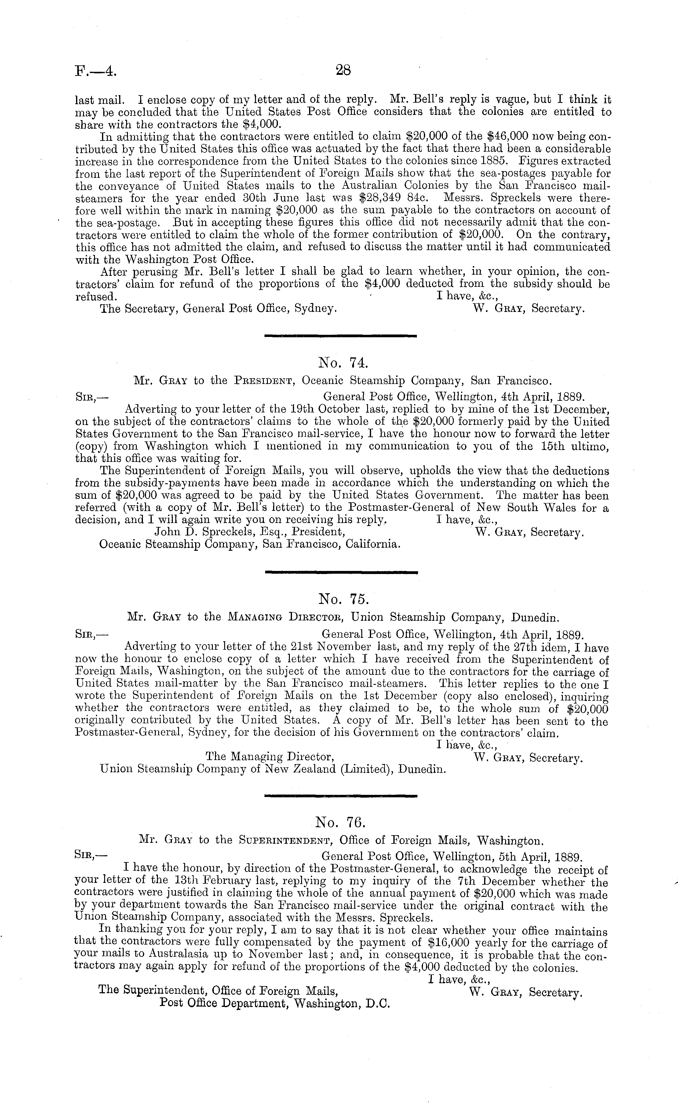No. 74. Mr. Gray to the President, Oceanic Steamship Company, San Francisco. Sir, — General Post Office, Wellington, 4th April, 1889. Adverting to your letter of the 19th October last, replied to by mine of the Ist December, on the subject of the contractors' claims to the whole of the $20,000 formerly paid by the United States Government to the San Francisco mail-service, I have the honour now to forward the letter (copy) from Washington which I mentioned in my communication to you of the 15th ultimo, that this office was waiting for. The Superintendent of Foreign Mails, you will observe, upholds the view that the deductions from the subsidy-payments have been made in accordance which the understanding on which the sum of $20,000 was agreed to be paid by the United States Government. The matter has been referred (with a copy of Mr. Bell's letter) to the Postmaster-General of New South Wales for a decision, and I will again write you on receiving his reply. I have, &c, John D. Spreckels, Esq., President, W. Gray, Secretary. Oceanic Steamship Company, San Francisco, California.