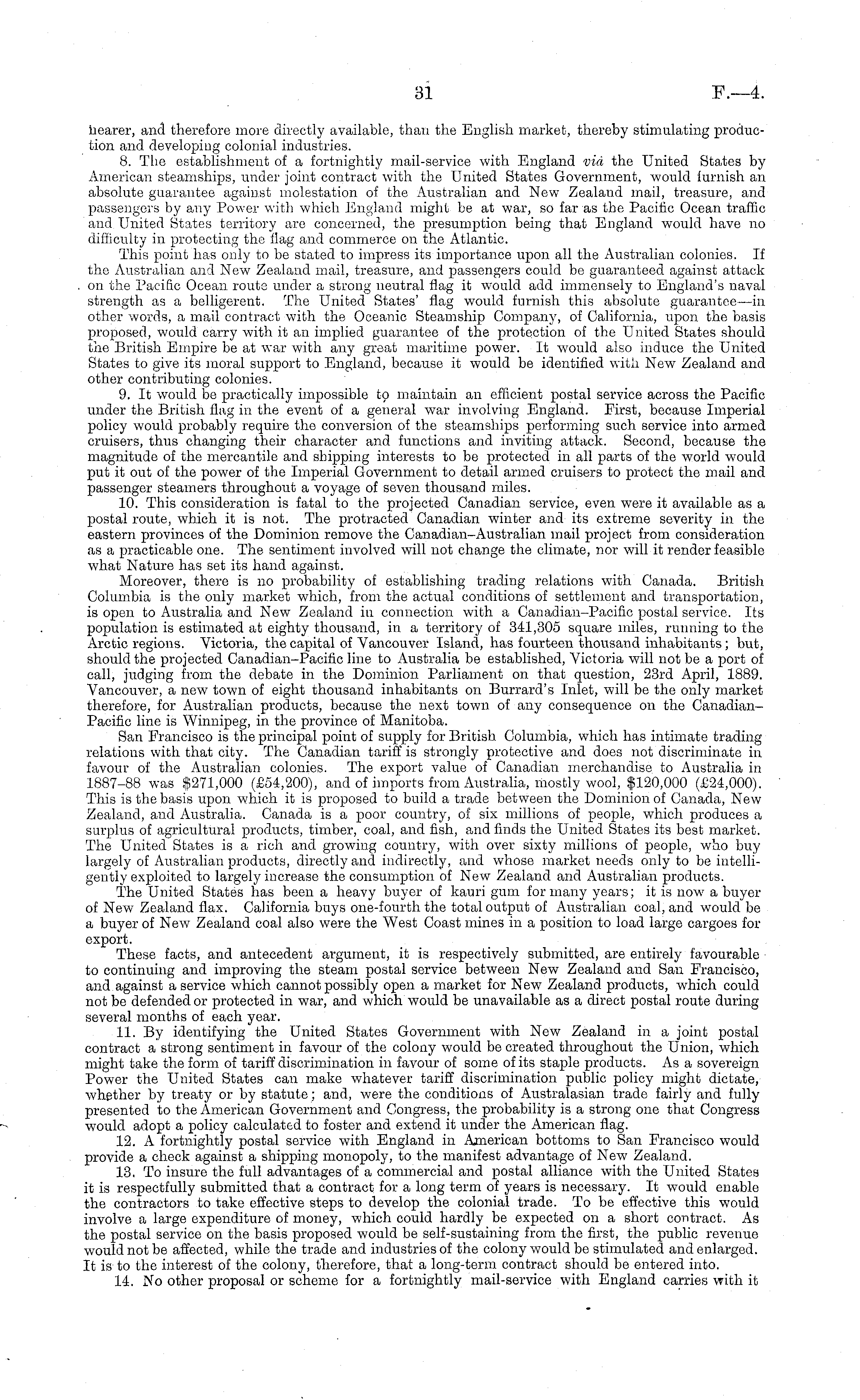 hearer, and therefore more directly available, than the English market, thereby stimulating production and developing colonial industries. 8. The establishment of a fortnightly mail-service with England via the United States by American steamships, under joint contract with the United States Government, would furnish an absolute guarantee against molestation of the Australian and New Zealand mail, treasure, and passengers by any Power with which England might be at war, so far as the Pacific Ocean traffic and United States territory are concerned, the presumption being that England would have no difficulty in protecting the flag and commerce on the Atlantic. This point has only to be stated to impress its importance upon all the Australian colonies. If the Australian and New Zealand mail, treasure, and passengers could be guaranteed against attack on the Pacific Ocean route under a strong neutral flag it would add immensely to England's naval strength as a belligerent. The United States' flag would furnish this absolute guarantee—in other words, a mail contract with the Oceanic Steamship Company, of California, upon the basis proposed, would carry with it an implied guarantee of the protection of the United States should the British Empire be at war with any great maritime power. It would also induce the United States to give its moral support to England, because it would be identified with New Zealand and other contributing colonies. 9. It would be practically impossible to maintain an efficient postal service across the Pacific under the British flag in the event of a general war involving England. First, because Imperial policy would probably require the conversion of the steamships performing such service into armed cruisers, thus changing their character and functions and inviting attack. Second, because the magnitude of the mercantile and shipping interests to be protected in all parts of the world would put it out of the power of the Imperial Government to detail armed cruisers to protect the mail and passenger steamers throughout a voyage of seven thousand miles. 10. This consideration is fatal to the projected Canadian service, even were it available as a postal route, which it is not. The protracted Canadian winter and its extreme severity in the eastern provinces of the Dominion remove the Canadian-Australian mail project from consideration as a practicable one. The sentiment involved will not change the climate, nor will it render feasible what Nature has set its hand against. Moreover, there is no probability of establishing trading relations with Canada. British Columbia is the only market which, from the actual conditions of settlement and transportation, is open to Australia and New Zealand in connection with a Canadian-Pacific postal service. Its population is estimated at eighty thousand, in a territory of 341,305 square miles, running to the xlrctic regions. Victoria, the capital of Vancouver Island, has fourteen thousand inhabitants; but, should the projected Canadian-Pacific line to Australia be established, Victoria will not be a port of call, judging from the debate in the Dominion Parliament on that question, 23rd April, 1889. Vancouver, a new town of eight thousand inhabitants on Burrard's Inlet, will be the only market therefore, for Australian products, because the next town of any consequence on the CanadianPacific line is Winnipeg, in the province of Manitoba. San Francisco is the principal point of supply for British Columbia, which has intimate trading relations with that city. The Canadian tariff is strongly protective and does not discriminate in favour of the Australian colonies. The export value of Canadian merchandise to Australia in 1887-88 was $271,000 (£54,200), and of imports from Australia, mostly wool, $120,000 (£24,000). This is the basis upon which it is proposed to build a trade between the Dominion of Canada, New Zealand, and Australia. Canada is a poor country, of six millions of people, which produces a surplus of agricultural products, timber, coal, and fish, and finds the United States its best market. The United States is a rich and growing country, with over sixty millions of people, who buy largely of Australian products, directly and indirectly, and whose market needs only to be intelligently exploited to largely increase the consumption of New Zealand and Australian products. The United States has been a heavy buyer of kauri gum for many years; it is now a buyer of New Zealand flax. California buys one-fourth the total output of Australian coal, and would be a buyer of New Zealand coal also were the West Coast mines in a position to load large cargoes for export. These facts, and antecedent argument, it is respectively submitted, are entirely favourable to continuing and improving the steam postal service between New Zealand and San Francisco, and against a service which cannot possibly open a market for New Zealand products, which could not be defended or protected in war, and which would be unavailable as a direct postal route during several months of each year. 11. By identifying the United States Government with New Zealand in a joint postal contract a strong sentiment in favour of the colony would be created throughout the Union, which might take the form of tariff discrimination in favour of some of its staple products. As a sovereign Power the United States can make whatever tariff discrimination public policy might dictate, whether by treaty or by statute; and, were the conditions of Australasian trade fairly and fully presented to the American Government and Congress, the probability is a strong one that Congress would adopt a policy calculated to foster and extend it under the American flag. 12. A fortnightly postal service with England in American bottoms to San Francisco would provide a check against a shipping monopoly, to the manifest advantage of New Zealand. 13. To insure the full advantages of a commercial and po