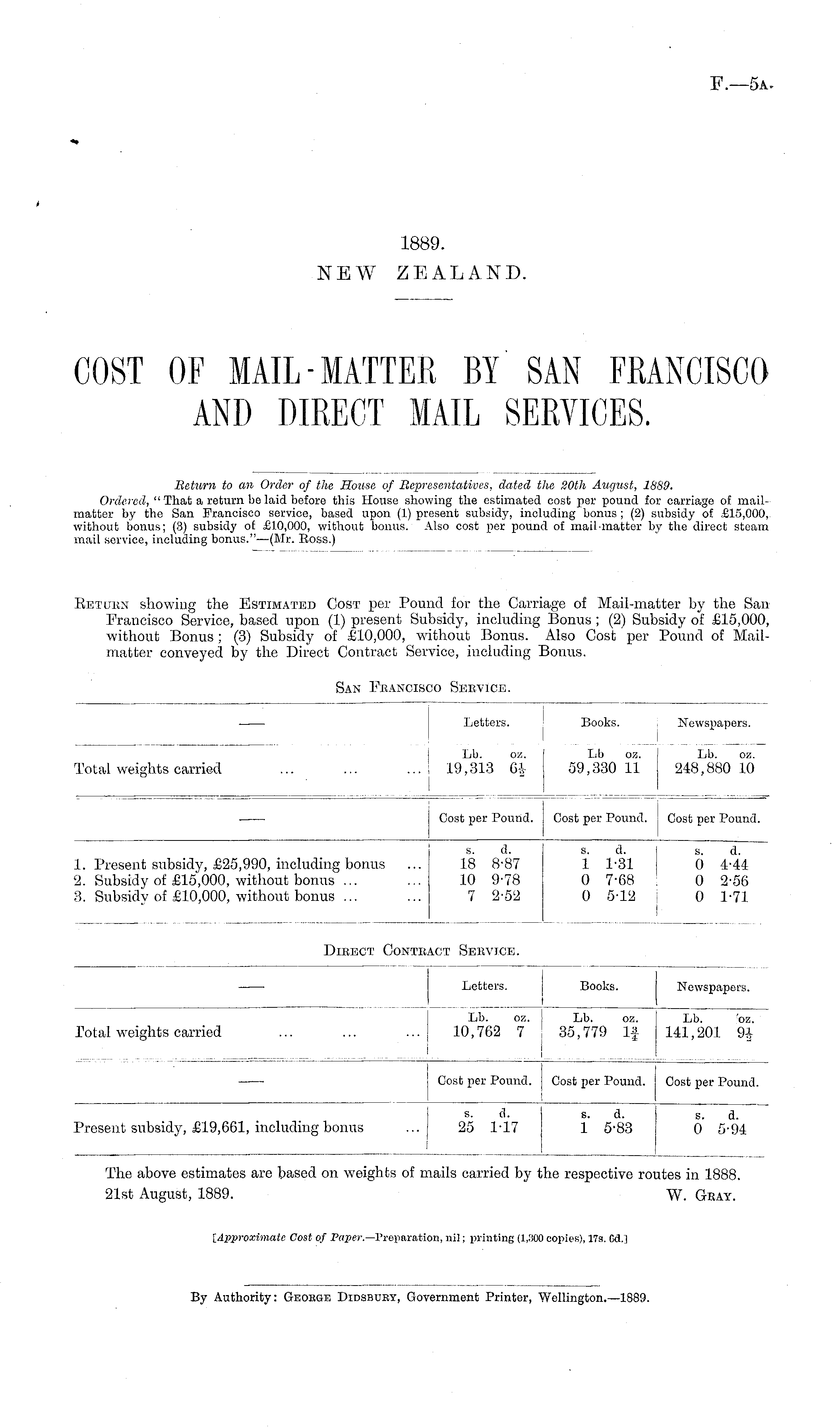 Return to an Order of the Souse of Representatives, dated the 20th August, 18S9. Ordered, " That a return be laid before this House showing the estimated cost per pound for carriage of mailmatter by the San Francisco service, based upon (1) present subsidy, including bonus; (2) subsidy of ,£15,000, without bonus; (3) subsidy of .£lO,OOO, without bonus. Also cost per pound of mail-matter by the direct steam mail service, including bonus." —(Mr. Ross.)
