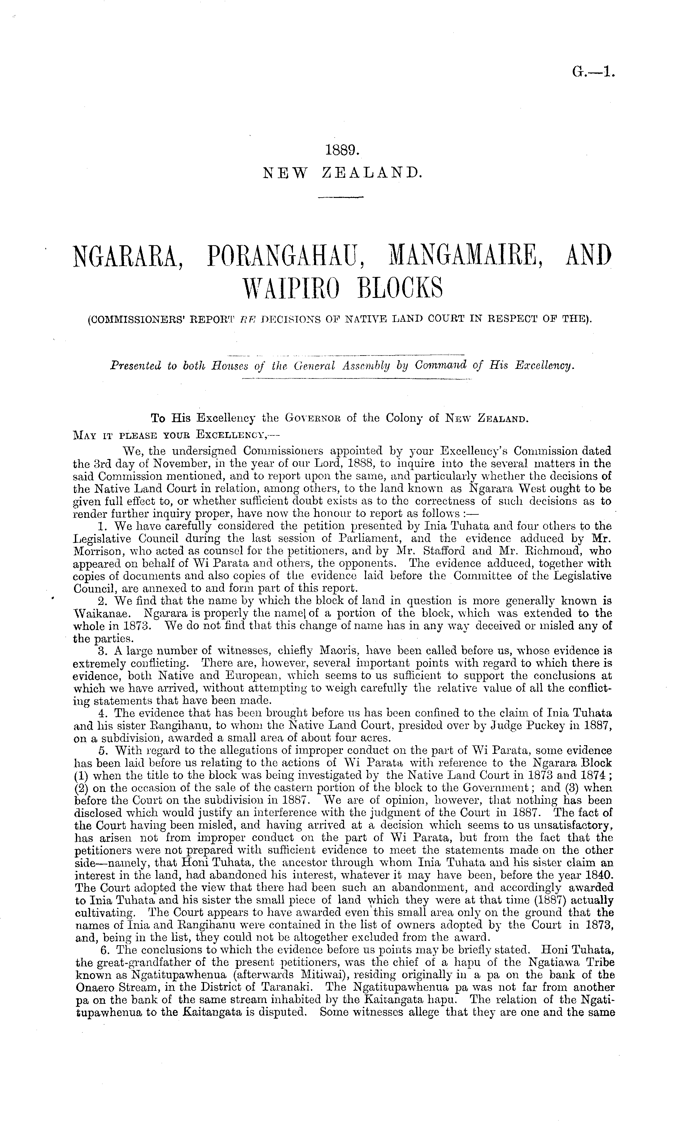 To His Excellency the Goveenoe of the Colony of New Zealand. May it please youk Excellency,— We, the undersigned Commissioners appointed by your Excellency's Commission dated the 3rd day of November, in the year of our Lord, 1888, to inquire into the several matters in the said Commission mentioned, and to report upon the same, and particularly whether the decisions of the Native Land Court in relation, among others, to the land known as Ngarara West ought to be given full effect to, or whether sufficient doubt exists as to the correctness of such decisions as to render further inquiry proper, have now the honour to report as follows : — 1. We have carefully considered the petition presented by Inia Tuhata and four others to the Legislative Council during the last session of Parliament, and the evidence adduced by Mr. Morrison, who acted as counsel for the petitioners, and by Mr. Stafford and Mr. Bichmond, who appeared on behalf of Wi Parata and others, the opponents. The evidence adduced, together with copies of documents and also copies of the evidence laid before the Committee of the Legislative Council, are annexed to and form part of this report. 2. We find that the name by which the block of land in question is more generally known is Waikanae. Ngarara is properly the name] of a portion of the block, which was extended to the whole in 1873. We do not find that this change of name has in any way deceived or misled any of the parties. 3. A largo number of witnesses, chiefly Maoris, have been called before us, whose evidence is extremely conflicting. There are, however, several important points with regard to which there is evidence, both Native and European, which seems to us sufficient to support the conclusions at which we have arrived, without attempting to weigh carefully the relative value of all the conflicting statements that have been made. 4. The evidence that has been brought before us has been confined to the claim of Inia Tuhata and his sister Bangihanu, to whom the Native Land Court, presided over by Judge Puckey in 1887, on a subdivision, awarded a small area of about four acres. 5. With regard to the allegations of improper conduct on the part of Wi Parata, some evidence has been laid before us relating to the actions of Wi Parata with reference to the Ngarara Block (1) when the title to the block was being investigated by the Native Land Court in 1873 and 1874 ; (2) on the occasion of the sale of the eastern portion of the block to the Government; and (3) when before the Court on the subdivision in 1887. We are of opinion, however, that nothing has been disclosed which would justify an interference with the judgment of the Court in 1887. The fact of the Court having been misled, and having arrived at a decision which seems to us unsatisfactory, has arisen not from improper conduct on the part of Wi Parata, but from the fact that the petitioners were not prepared with sufficient evidence to meet the statements made on the other side—namely, that Honi Tuhata, the ancestor through whom Inia Tuhata and his sister claim an interest in the land, had abandoned his interest, whatever it may have been, before the year 1840. The Court adopted the view that there had been such an abandonment, and accordingly awarded to Inia Tuhata and his sister the small piece of land which they were at that time (1887) actually cultivating. The Court appears to have awarded even this small area only on the ground that the names of Inia and Bangihanu were contained in the list of owners adopted by the Court in 1873, and, being in the list, they could not be altogether excluded from the award. 6. The conclusions to which the evidence before us points may be briefly stated. Honi Tuhata, the great-grandfather of the present petitioners, was the chief of a hapu of the Ngatiawa Tribe known as Ngatitupawhenua (afterwards Mitiwai), residing originally in a pa on the bank of the Onaero Stream, in the District of Taranaki. The Ngatitupawhenua pa was not far from another pa on the bank of the same stream inhabited by the Kaitangata hapu. The relation of the Ngatitupawhenua to the Kaitangata is disputed. Some witnesses allege that they are one and the same