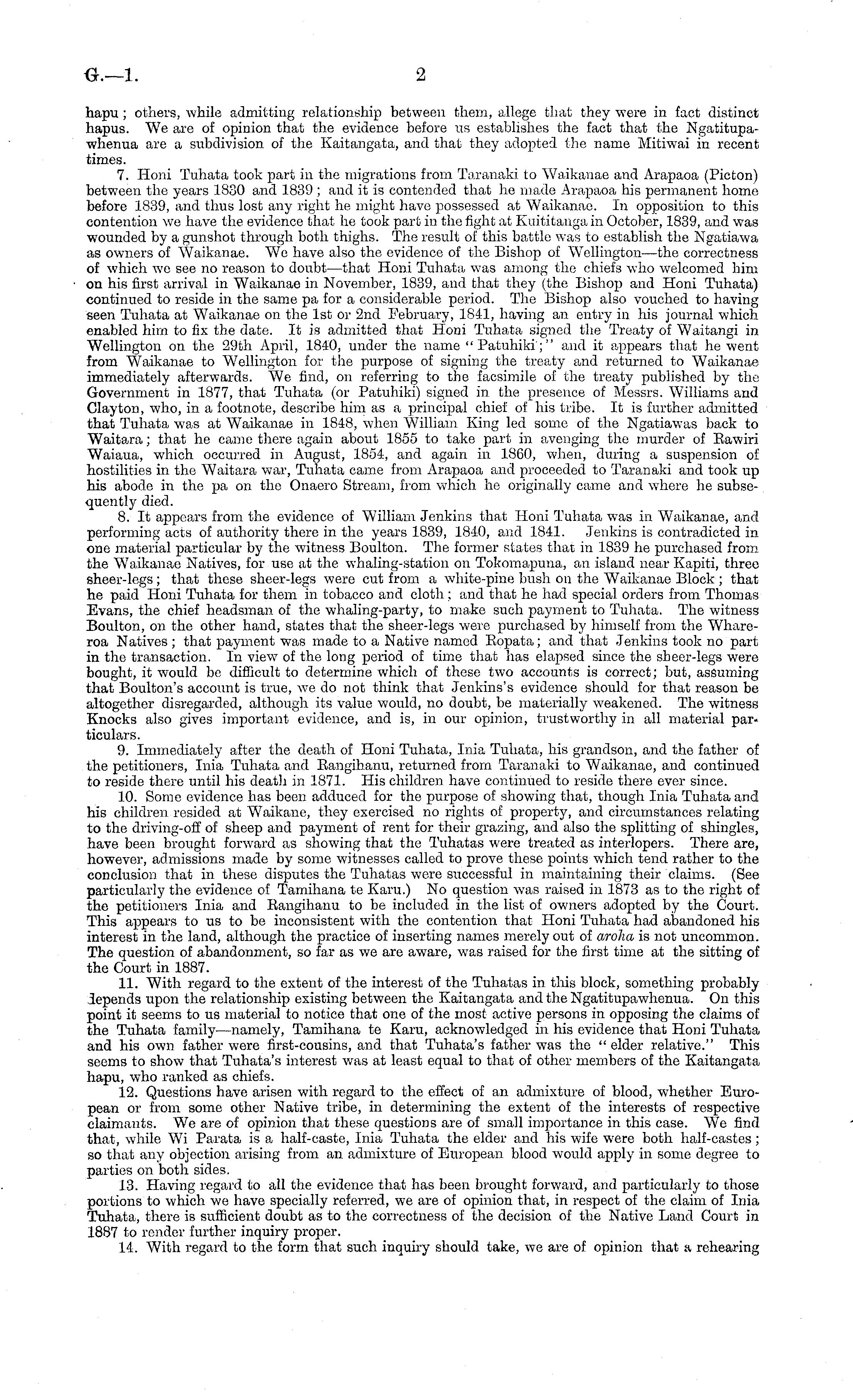 hapu; others, while admitting relationship between them, allege that they were in fact distinct hapus. We are of opinion that the evidence before us establishes the fact that the Ngatitupawhenua are a subdivision of the Kaitangata, and that they adopted the name Mitiwai in recent times. 7. Honi Tuhata took part in the migrations from Taranaki to Waikanae and Arapaoa (Picton) between the years 1880 and 1839 ; and it is contended that he made Arapaoa his permanent home before 1839, and thus lost any right he might have possessed at Waikanae. In opposition to this contention we have the evidence that he took part in the fight at Kuititanga in October, 1839, and was wounded by a gunshot through both thighs. The result of this battle was to establish the Ngatiawa as owners of Waikanae. We have also the evidence of the Bishop of Wellington—the correctness of which we see no reason to doubt—that Honi Tuhata was among the chiefs who welcomed him on his first arrival in Waikanae in November, 1839, and that they (the Bishop and Honi Tuhata) continued to reside in the same pa for a considerable period. The Bishop also vouched to having seen Tuhata at Waikanae on the Ist or 2nd February, 1841, having an entry in his journal which enabled him to fix the date. It is admitted that Honi Tuhata signed the Treaty of Waitangi in Wellington on the 29th April, 1840, under the name " Patuhiki;" and it appears that he went from Waikanae to Wellington for the purpose of signing the treaty and returned to Waikanae immediately afterwards. We find, on referring to the facsimile of the treaty published by the Government in 1877, that Tuhata (or Patuhiki) signed in the presence of Messrs. Williams and Clayton, who, in a footnote, describe him as a principal chief of his tribe. It is further admitted that Tuhata was at Waikanae in 1848, when William King led some of the Ngatiawas back to Waitara; that he came there again about 1855 to take part in avenging the murder of Eawiri Waiaua, which occurred in August, 1854, and again in 1860, when, during a suspension of hostilities in the Waitara war, Tuhata came from Arapaoa and proceeded to Taranaki and took up his abode in the pa on the Onaero Stream, from which he originally came and where he subsequently died. 8. It appears from the evidence of William Jenkins that Honi Tuhata was in Waikanae, and performing acts of authority there in the years 1839, 1840, and 1841. Jenkins is contradicted in one material particular by the witness Boulton. The former states that in 1839 he purchased from the Waikanae Natives, for use at the whaling-station on Tokomapuna, an island near Kapiti, three sheer-legs ; that these sheer-legs were cut from a white-pine bush on the Waikanae Block ; that he paid Honi Tuhata for them in tobacco and cloth; and that he had special orders from Thomas Evans, the chief headsman of the whaling-party, to make such payment to Tuhata. The witness Boulton, on the other hand, states that the sheer-legs were purchased by himself from the Whareroa Natives ; that payment was made to a Native named Eopata; and that Jenkins took no part in the transaction. In view T of the long period of time that has elapsed since the sheer-legs were bought, it would be. difficult to determine which of these two accounts is correct; but, assuming that Boulton's account is true, we do not think that Jenkins's evidence should for that reason be altogether disregarded, although its value would, no doubt, be materially weakened. The witness Knocks also gives important evidence, and is, in our opinion, trustworthy in all material particulars. 9. Immediately after the death of Honi Tuhata, Inia Tuhata, his grandson, and the father of the petitioners, Inia Tuhata and Eangihanu, returned from Taranaki to Waikanae, and continued to reside there until his death in 1871. His children have continued to reside there ever since. 10. Some evidence has been adduced for the purpose of showing that, though Inia Tuhata and his children resided at Waikane, they exercised no rights of property, and circumstances relating to the driving-off of sheep and payment of rent for their grazing, and also the splitting of shingles, have been brought forward as showing that the Tuhatas w r ere treated as interlopers. There are, however, admissions made by some witnesses called to prove these points which tend rather to the conclusion that in these disputes the Tuhatas were successful in maintaining their claims. (See particularly the evidence of Tamihana te Karu.) No question was raised in 1873 as to the right of the petitioners Inia and Eangihanu to be included in the list of owners adopted by the Court. This appears to us to be inconsistent with the contention that Honi Tuhata had abandoned his interest in the land, although the practice of inserting names merely out of aroha is not uncommon. The question of abandonment, so far as we are aware, was raised for the first time at the sitting of the Court in 1887. 11. With regard to the extent of the interest of the Tuhatas in this block, something probably depends upon the relationship existing between the Kaitangata and the Ngatitupawhenua. On this point it seems to us material to notice that one of the most active persons in opposing the claims of the Tuhata family—namely, Tamihana te Karu, acknowledged in his evidence that Honi Tuhata and his own father were first-cousins, and that Tuhata's father was the " elder relative." This seems to show that Tuhata's interest was at least equal to that of other members of the Kaitangata hapu, who ranked as chiefs. 12. Questions have arisen with regard to the effect of an admixture of blood, whether European or from some other Native tribe, in determining the extent of the interests of respective claimants. We are of opinion that these questions are of small importance in this case. We find that, while Wi Parata is a half-caste, Inia Tuhata the elder and his wife were both half-castes ; so that any objection arisi