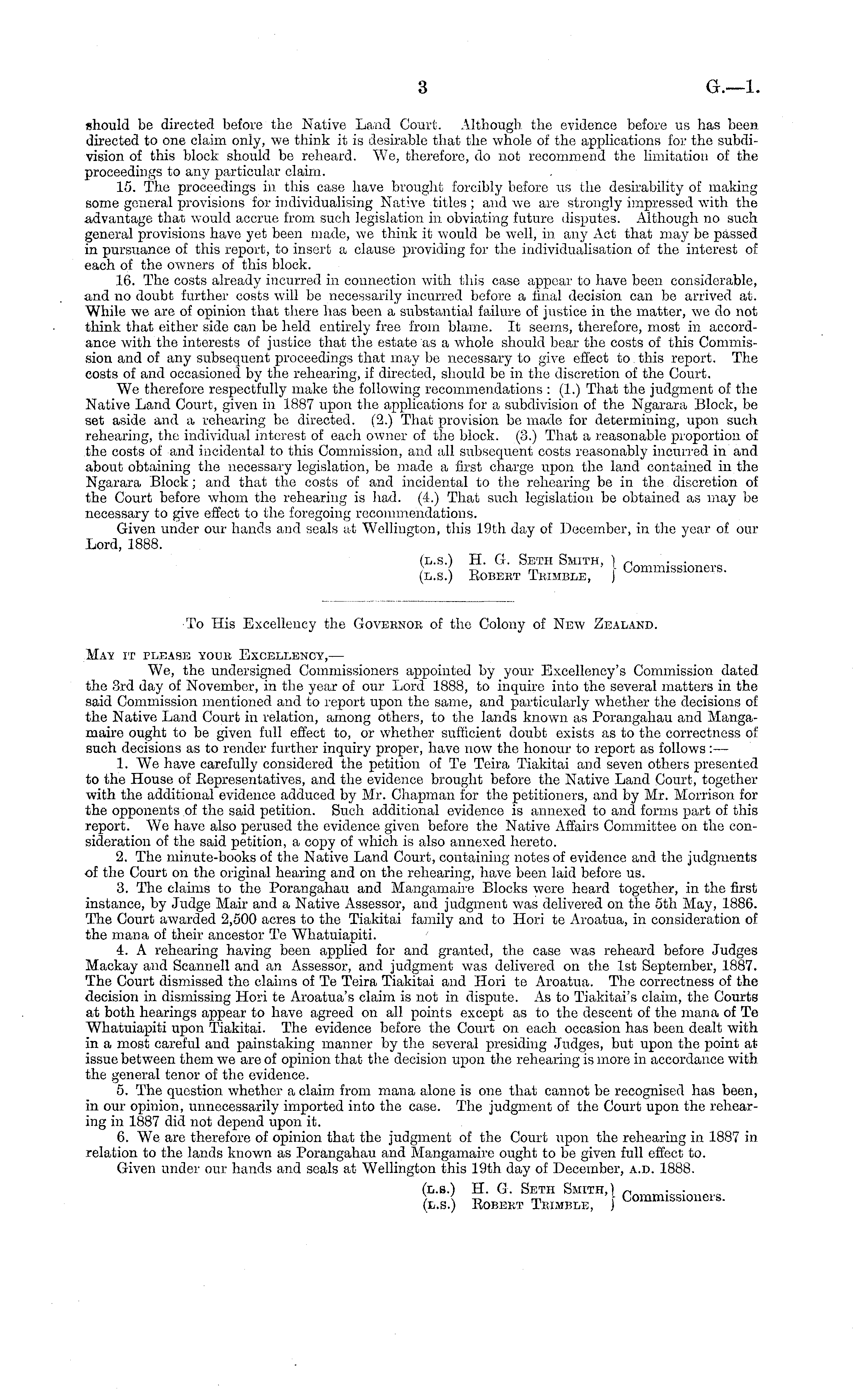 To His Excellency the Governor of the Colony of New Zealand. May it please youb Excellency,— We, the undersigned Commissioners appointed by your Excellency's Commission dated the 3rd day of November, in the year of our Lord 1888, to inquire into the several matters in the said Commission mentioned and to report upon the same, and particularly whether the decisions of the Native Land Court in relation, among others, to the lands known as Porangahau and Mangamaire ought to be given full effect to, or whether sufficient doubt exists as to the correctness of such decisions as to render further inquiry proper, have now the honour to report as follows:— 1. We have carefully considered the petition of Te Teira Tiakitai and seven others presented to the House of Representatives, and the evidence brought before the Native Land Court, together with the additional evidence adduced by Mr. Chapman for the petitioners, and by Mr. Morrison for the opponents of the said petition. Such additional evidence is annexed to and forms part of this report. We have also perused the evidence given before the Native Affairs Committee on the consideration of the said petition, a copy of which is also annexed hereto. 2. The minute-books of the Native Land Court, containing notes of evidence and the judgments of the Court on the original hearing and on the rehearing, have been laid before us. 3. The claims to the Porangahau and Mangamaire Blocks were heard together, in the first instance, by Judge Mair and a Native Assessor, and judgment was delivered on the oth May, 1886. The Court awarded 2,500 acres to the Tiakitai family and to Hori te Aroatua, in consideration of the man a of their ancestor Te Whatuiapiti. 4. A rehearing having been applied for and granted, the case was reheard before Judges Mackay and Scannell and an Assessor, and judgment was delivered on the Ist September, 1887. The Court dismissed the claims of Te Teira Tiakitai and Hori te Aroatua. The correctness of the decision in dismissing Hori te Aroatua's claim is not in dispute. As to Tiakitai's claim, the Courts at both hearings appear to have agreed on all points except as to the descent of the mana of Te Whatuiapiti upon Tiakitai. The evidence before the Court on each occasion has been dealt with in a most careful and painstaking manner by the several presiding Judges, but upon the point at issue between them we are of opinion that the decision upon the rehearing is more in accordance with the general tenor of the evidence. 5. The question whether a claim from mana alone is one that cannot be recognised has been, in our opinion, unnecessarily imported into the case. The judgment of the Court upon the rehearing in 1887 did not depend upon it. 6. We are therefore of opinion that the judgment of the Court upon the rehearing in 1887 in relation to the lands known as Porangahau and Mangamaire ought to be given full effect to. Given under our hands and seals at Wellington this 19th day of December, a.d. 1888. £"4 SJLXS*} °—»■*••