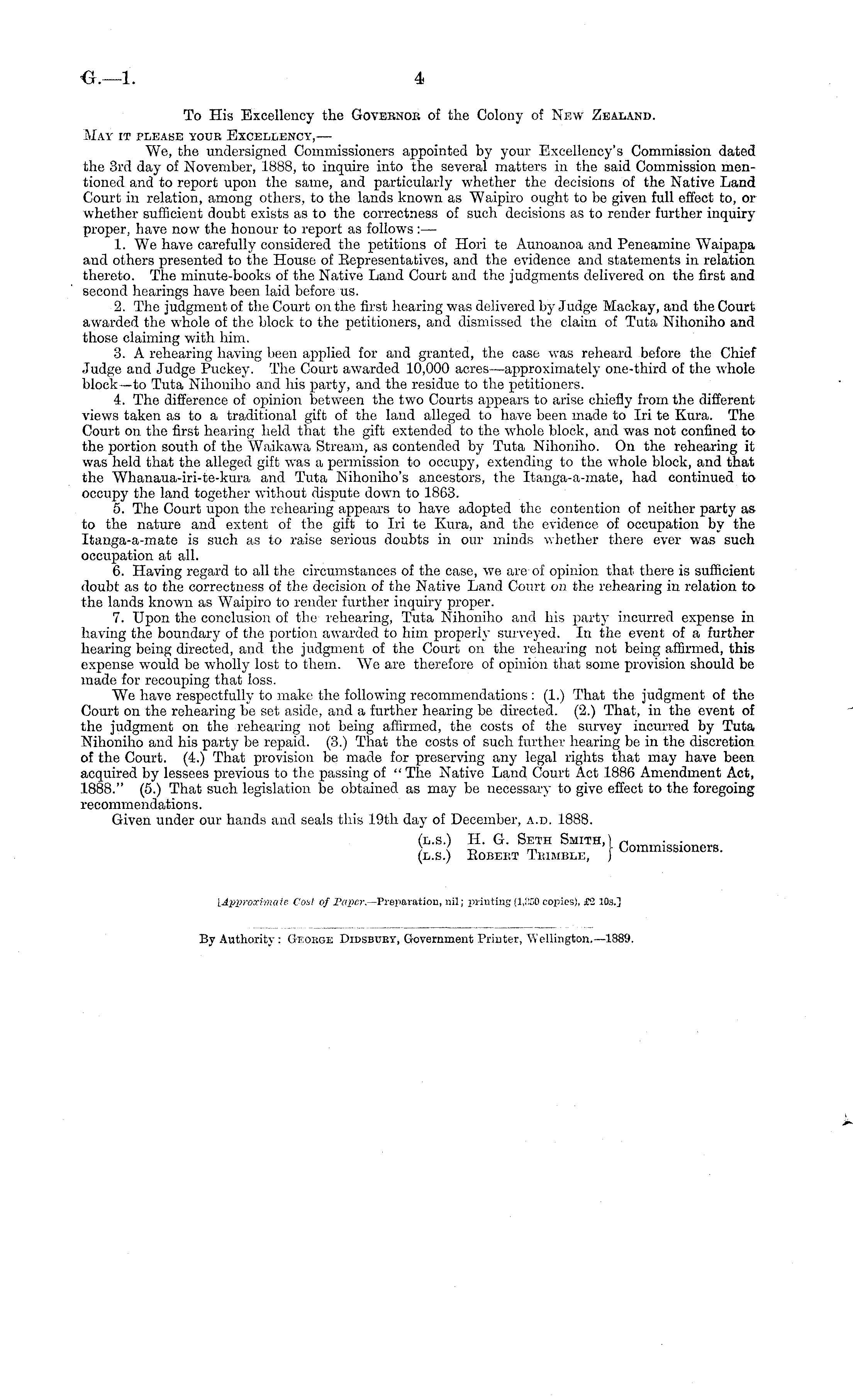 To His Excellency the Govebnok of the Colony of New Zealand. May it please youb Excellency,— We, the. undersigned Commissioners appointed by your Excellency's Commission dated the 3rd day of November, 1888, to inquire into the several matters in the said Commission mentioned and to report upon the same, and particularly whether the decisions of the Native Land Court in relation, among others, to the lands known as Waipiro ought to be given full effect to, or whether sufficient doubt exists as to the correctness of such decisions as to render further inquiry proper, have now the honour to report as follows: — 1. We have carefully considered the petitions of Hori te Aunoanoa and Peneamine Waipapa and others presented to the House of Eepresentatives, and the evidence and statements in relation thereto. The minute-books of the Native Land Court and the judgments delivered on the first and second hearings have been laid before us. 2. The judgment of the Court on the first hearing was delivered by Judge Mackay, and the Court awarded the whole of the block to the petitioners, and dismissed the claim of Tuta Nihoniho and those claiming with him. 3. A rehearing having been applied for and granted, the case was reheard before the Chief Judge and Judge Puckey. The Court awarded 10,000 acres—approximately one-third of the whole block—to Tuta Nihoniho and his party, and the residue to the petitioners. 4. The difference of opinion between the two Courts appears to arise chiefly from the different views taken as to a traditional gift of the land alleged to have been made to Iri te Kura. The Court on the first hearing held that the gift extended to the whole block, and was not confined to the portion south of the Waikawa Stream, as contended by Tuta Nihoniho. On the rehearing it was held that the alleged gift was a permission to occupy, extending to the whole block, and that the Whanaua-iri-te-kura and Tuta Nihoniho's ancestors, the Itanga-a-mate, had continued to occupy the land together without dispute down to 1863. 5. The Court upon the rehearing appears to have adopted the contention of neither party as to the nature and extent of the gift to Iri te Kura, and the evidence of occupation by the Itanga-a-mate is such as to raise serious doubts in our minds whether there ever was such occupation at all. 6. Having regard to all the circumstances of the case, we are'of opinion that there is sufficient doubt as to the correctness of the decision of the Native Land Court on the rehearing in relation to the lands known as Waipiro to render further inquiry proper. 7. Upon the conclusion of the rehearing, Tuta Nihoniho and his party incurred expense in having the boundary of the portion awarded to him properly surveyed. In the event of a further hearing being directed, and the judgment of the Court on the rehearing not being affirmed, this expense would be wholly lost to them. We are therefore of opinion that some provision should be made for recouping that loss. We have respectfully to make the following recommendations : (1.) That the judgment of the Court on the rehearing be set aside, and a further hearing be directed. (2.) That, in the event of the judgment on the rehearing not being affirmed, the costs of the survey incurred by Tuta Nihoniho and his party be repaid. (3.) That the costs of such further hearing be in the discretion of the Court. (4.) That provision be made for preserving any legal rights that may have been acquired by lessees previous to the passing of " The Native Land Court Act 1886 Amendment Act, 1888." (5.) That such legislation be obtained as may be necessary to give effect to the foregoing recommendations. Given under our hands and seals this 19th day of December, a.d. 1888. (1.5.) H. G. Seth Smith, ,-, ■ ■ (1.5.) Eobebt Trimble, " Commissioners. [Approximate Cost of Paper. —Preparation, nil; printing (1,360 copies), £2 10s.]