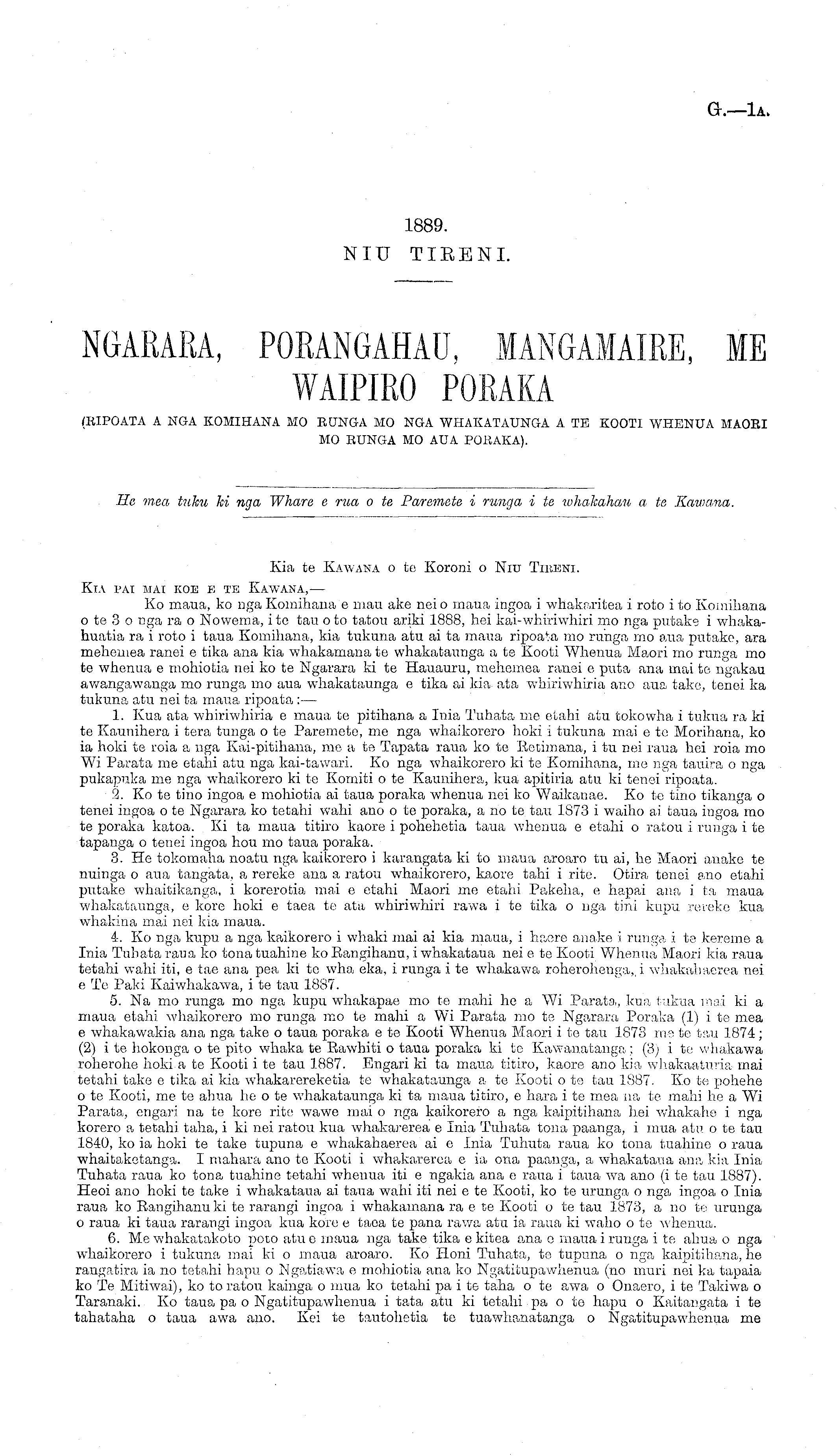 Kia te Kawana o te Koroni o Niu Tibeni. KIA PAI MAI KOE E TE KAWANA, — Ko maua, ko nga Komihana c mau ake neio maua ingoa i wftakaritea i roto i to Komihana o te 3 o nga ra o Nowema, ito tau oto tatou ariki 1888, hei kai-whiriwhiri mo nga putake i whakahuatia ra i roto i taua Komihana, kia tukuna atu ai ta maua ripoata mo runga mo ana putake, ara mehemea ranei c tika ana kia whakamana te whakataunga a to Kooti Whenua Maori mo runga mo te wfaenua c mohiotia nei ko te Ngarara kite Hauauru, mehemea ranei c puta ana mai te ngakau awangawanga mo runga mo aua whakataunga c tika ai kia ata whiriwhiria ano aua take, tenei ka tukuna atu nei ta maua ripoata : — 1. Kua ata whiriwhiria c maua te pitihana a Inia Tuhata me etahi atu tokowha i tukna ra ki te Kaunihera i tera tunga o te Paremete, me nga whaikorero hoki i tukuna mai c te Morihana, ko ia hoki te roia a nga Kai-pitihana, me a te Tapata raua ko te Betimana, i tv nei raua hei roia mo Wi Parata me etahi atu nga kai-tawari. Ko nga whaikorero kite Komihana, me nga tauira o nga pukapuka me nga whaikorero kite Komiti o te Kaunihera, kua apitiria atu ki tenei ripoata. 2. Ko te tino ingoa c mohiotia ai taua poraka whenua nei ko Waikanae. Ko te tino tikanga o tenei ingoa o te Ngarara ko tetahi wahi ano o te poraka, a no te tau 1873 i waiho ai taua ingoa mo te poraka katoa. Xi ta maua titiro kaore i pohehetia taua whenua c etahi o ratou i runga ite tapanga o tenei ingoa hou mo taua poraka. 3. He tokomaha noatu nga kaikorero i karangata ki to maua aroaro tv ai, he Maori anake te nuinga o aua tangata, a rereke ana a ratou whaikorero, kaore tahi i rite. Otira tenei ano etahi putake whaitikanga, i korerotia mai c etahi Maori me etahi Pakeha, c hapai ana i ta maua whakataunga, c kore hoki c taea te ata whiriwhiri rawa i te tika o nga tini kupu rereko kua whakina mai nei kia maua. 4. Ko nga kupu a nga kaikorero i whaki mai ai kia maua, i haere anake i runga i te kereme a Inia Tuhata raua ko tona tuahine ko Eangihanu, i whakataua nei c te Kooti Whenua Maori kia raua tetahi wahi iti, c tae ana pea kite wha eka, i runga i te whakawa roherohenga,, i whakabaerea nei c Te Paki Kaiwhakawa, i te tau 1887. 5. Na mo runga mo nga kupu whakapae mo te mahi he a Wi Parata, kua tukua mai ki a maua etahi whaikorero mo runga mo te mahi a Wi Parata mo te Ngarara Poraka (1) i te mea c whakawakia ana nga take o taua poraka c te Kooti Whenua Maori i te tau 1873 me te tau 1874; (2) ite hokonga ote pito whaka te Eawhiti o taua poraka kite Kawanatanga ; (3) i te whakawa roherohe hoki ate Kooti ite tau 1887. Engari ki ta maua titiro, kaore ano kia whakaaturia mai tetahi take c tika ai kia whakarereketia te whakataunga a te Kooti oto tau 1887. Ko te pohehe o te Kooti, me te ahua he o te whakataunga ki ta maua titiro, c hara i te mea na te mahi he a Wi Parata, engari na te kore rite wawe mai o nga kaikorero a nga kaipitihana hei whakahe i nga korero a tetahi taha, i ki nei ratou kua whakarerea c Inia Tuhata toua paanga, i mua atu o te tau 1840, ko ia hoki te take tupuna c whakahaerea ai c Inia Tuhuta raua ko tona tuahine o raua whaitaketanga. I mahara ano te Kooti i whakarerea c ia ona paanga, a whakataua ana kia Inia Tuhata raua ko tona tuahine tetahi whenua iti c ngakia ana c raua i taua wa ano (i te tau 1887). Heoi ano hoki te take i whakataua ai taua wahi iti nei c te Kooti, ko te urunga o nga ingoa o Inia raua ko Eangihanu kite rarangi ingoa i whakamana ra c te Kooti o te tau 1873, a no te urunga o raua ki taua rarangi ingoa kua kore c taoa te pana rawa atu ia raua ki waho o te whenua. 6. Me whakatakoto poto atu c maua nga take tika c kitea ana o maua i runga i te ahua o nga whaikorero i tukuna mai ki o maua aroaro. Ko Honi Tuhata, to tupuna o nga kaipitihana, he rangatira ia no tetahi hapu o Ngatiawa c mohiotia ana ko Ngatitupawhenua (no muri nei ka tapaia ko Te Mitiwai), ko to ratou kainga o mua ko tetahi pa i te taha o te awa o Onaero, i te Takiwa o Taranaki. Ko taua pa o Ngatitupawhenua i tata atu ki tetahi pa o te hapu o Kaitangata ite tahataha o taua awa ano. Kei te tautohetia te tuawhanatanga o Ngatitupawhenua me