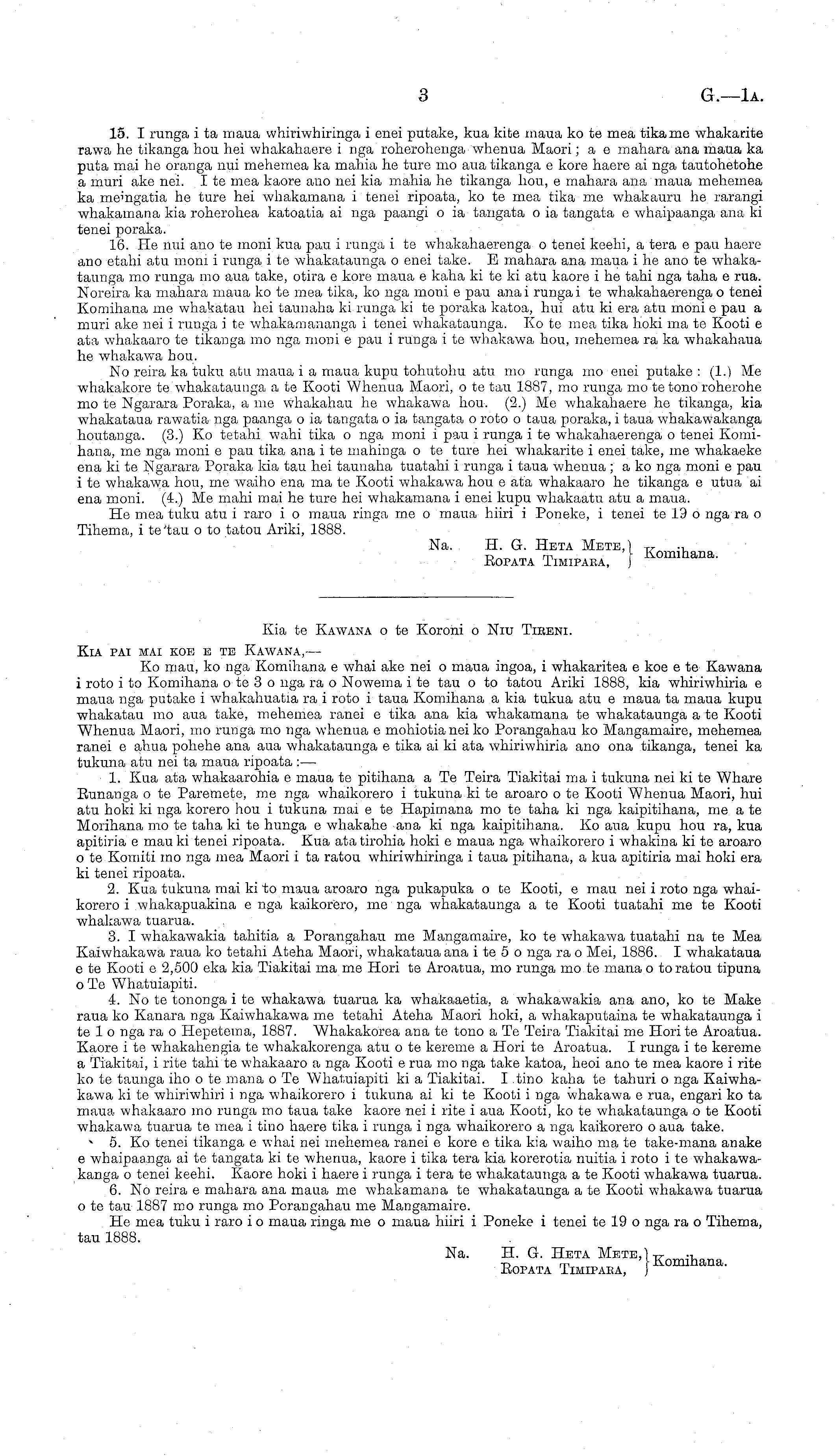 Kia te Kawana o te Koroni o Niu Tieeni. Kia pai mai koe c te Kawana, — Ko man, ko nga Komihana c whai ake nei o maua ingoa, i whakaritea c koe c te Kawana i roto i to Komihana o te 3 o nga ra o Nowema i te tau o to tatou Ariki 1888, kia whiriwhiria c maua nga putake i whakahuatia ra i roto i taua Komihana a kia tukua atu c maua ta maua kupu whakatau mo aua take, mehemea ranei c tika ana kia whakamana te whakataunga a te Kooti Whenua Maori, mo runga rao nga whenua c mohiotianei ko Porangahau ko Mangamaire, mehemea ranei c ahua pohehe ana aua whakataunga c tika ai ki ata whiriwhiria ano ona tikanga, tenei ka tukuna atu nei ta maua ripoata : — 1. Kua ata whakaarohia c maua te pitihana a Te Teira Tiakitai ma i tukuna nei kite Whare Kunanga o te Paremete, me nga whaikorero i tukuna kite aroaro o te Kooti Whenua Maori, hui atu hoki ki nga korero hou i tukuna mai o te Hapirnana mo te taha ki nga kaipitihana, me a te Morihana mo te taha kite hunga c whakahe ana ki nga kaipitihana. Ko aua kupu hou ra, kua apitiria c mauki tenei ripoata. Kua atatirohia hoki c maua nga whaikorero i whakina kite aroaro o te Komiti mo nga mea Maori i ta ratou whiriwhiringa i taua pitihana, a kua apitiria mai hoki era ki tenei ripoata. 2. Kua tukuna mai ki to maua aroaro nga pukapuka o te Kooti, c mau nei i roto nga whaikorero i whakapuakina c nga kaikorero, me nga whakataunga a te Kooti tuatahi me te Kooti whakawa tuarua. 3. I whakawakia tahitia a Porangahau me Mangamaire, ko to whakawa tuatahi na te Mea Kaiwhakawa raua ko tetahi Ateha Maori, whakataua ana ite 5 o nga ra o Mci, 1886. I whakataua c te Kooti c 2,500 eka kia Tiakitai ma me Hori te Aroatua, mo runga mo te mana o to ratou tipuna o Te Whatuiapiti. 4. No te tononga i te whakawa tuarua ka whakaaetia, a whakawakia ana ano, ko te Make raua ko Kanara nga Kaiwhakawa me tetahi Ateha Maori hoki, a whakaputaina te whakataunga i te 1 o nga ra o Hepetema, 1887. Whakakorea ana te tono aTe Teira Tiakitai me Horite Aroatua. Kaoro ite whakahengia te whakakorenga atu ote kereme a Hori te Aroatua. I runga ite kereme a Tiakitai, i rite tahi te whakaaro a nga Kooti c rua mo nga take katoa, heoi ano te mea kaore i rite ko te taunga iho ote mana oTe Whatuiapiti ki a Tiakitai. I tino kaha te tahuri o nga Kaiwhakawa kite whiriwhiri i nga whaikorero i tukuna ai kite Kooti i nga whakawa c rua, engari ko ta maua whakaaro mo runga mo taua take kaore nei i rite i aua Kooti, ko te whakataunga ote Kooti whakawa tuarua te mea i tino haere tika i runga i nga whaikorero a nga kaikorero o aua take. 5. Ko tenei tikanga c whai nei mehemea ranei c kore c tika kia waiho ma te take-mana anake c whaipaanga ai te tangata kite whenua, kaore i tika tera kia korerotia nuitia i roto i te whakawakanga o tenei keehi. Kaore hoki i haere i runga i tera te whakataunga ate Kooti whakawa tuarua. 6. No reira c mahara ana maua me whakamana te whakataunga a te Kooti whakawa tuarua o te tau 1887 mo runga mo Porangahau me Mangamaire. He mea tuku i raro i o maua ringa me o maua hiiri i Poneke i tenei te 19 o nga ra o Tihema, tau 1888. Na. H. G. Heta ~ Bopata Timipaea, ') K °mihana.