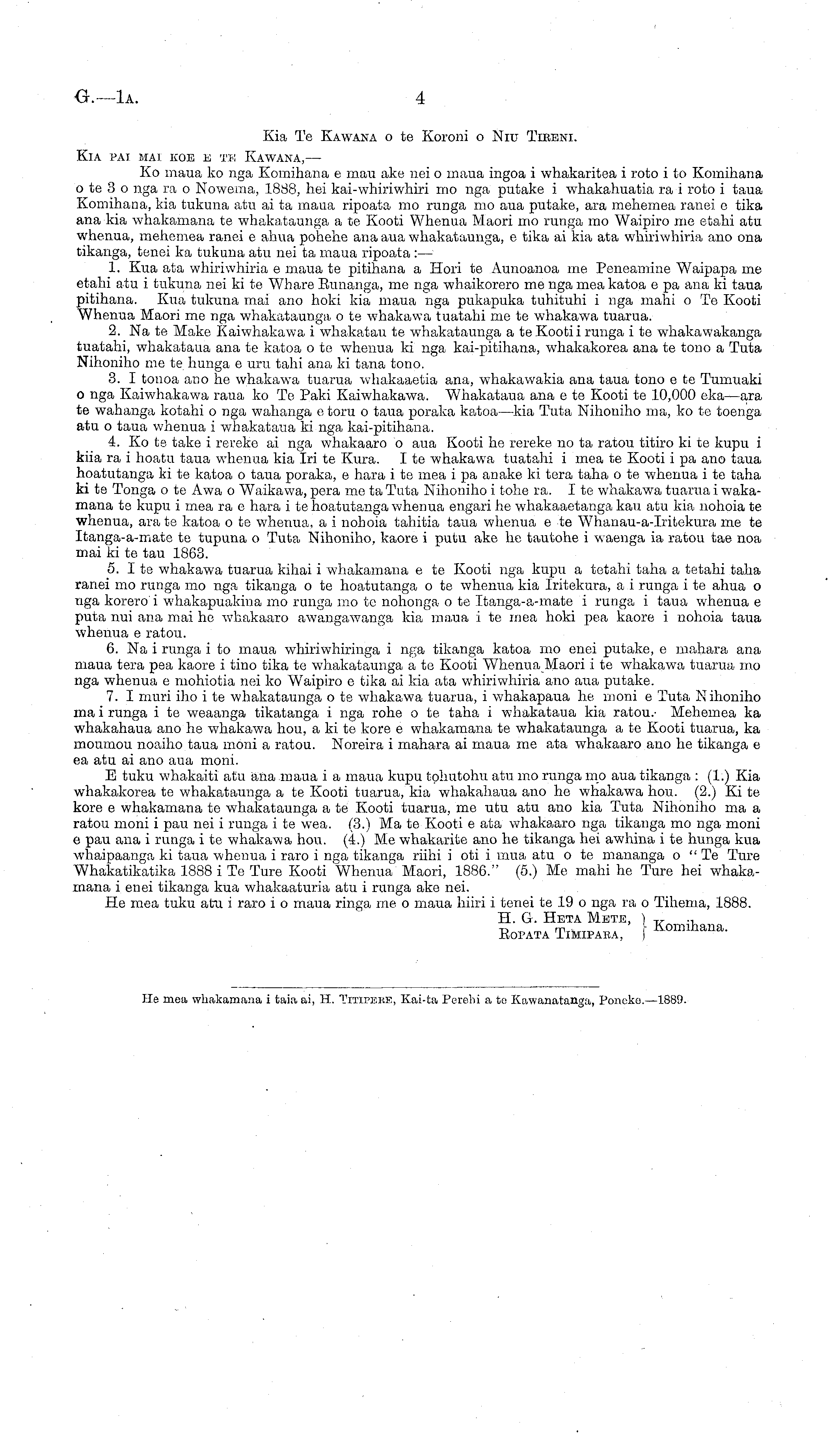 He mea whakamana i taiaai, H. Titieebe, Eai-ta Pcrehi a to Kawanatanga, Poneko. —1889.