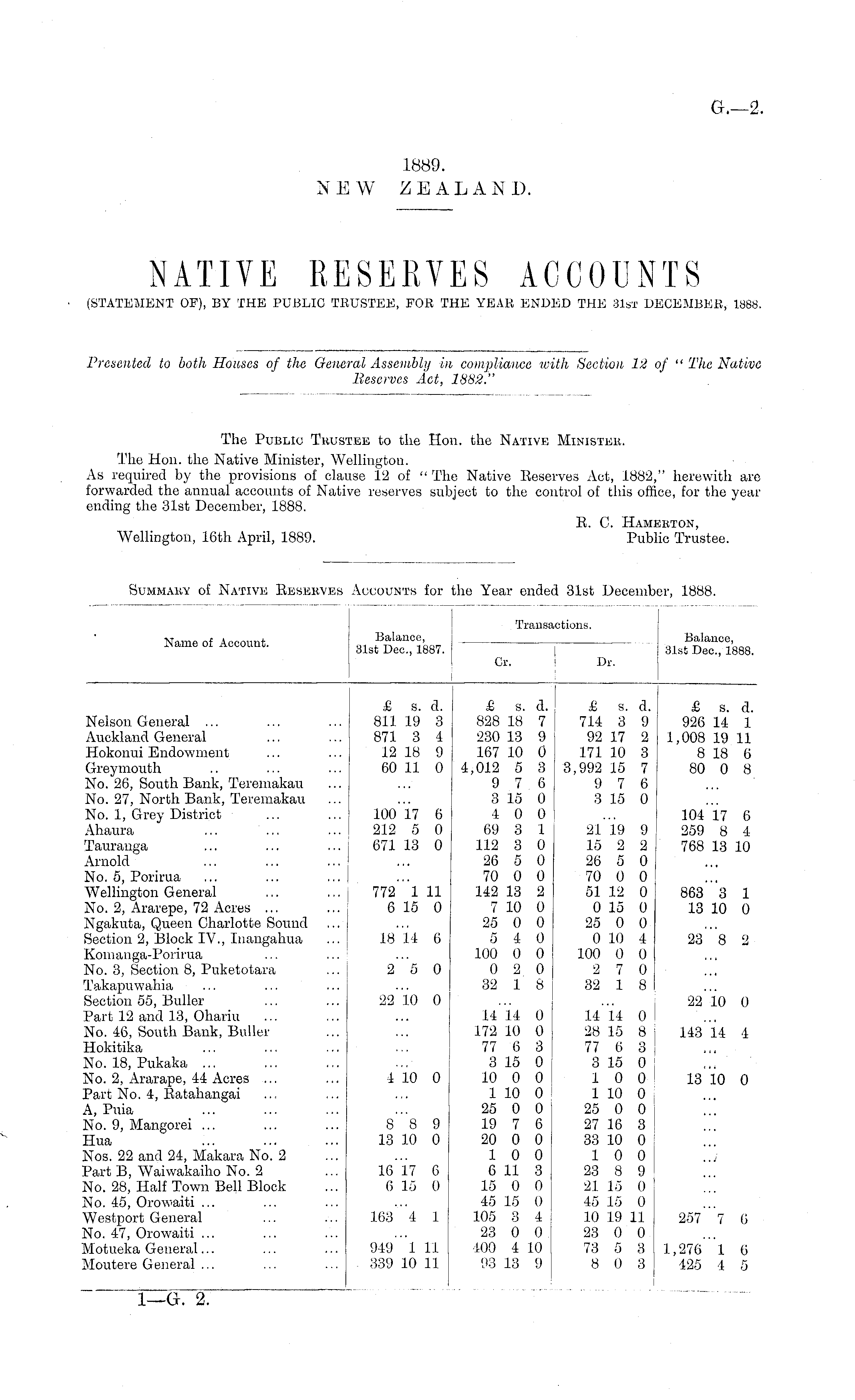 The Public Trustee to the Hon. the Native Minister. The Hon. the Native Minister, Wellington. As required by the provisions of clause 12 of " The Native Eeserves Act, 1882," herewith arc forwarded the annual accounts of Native reserves subject to the control of this office, for the year ending the 31st December, 1888. E. C. Hambrton, Wellington, 16th April, 1889. Public Trustee.