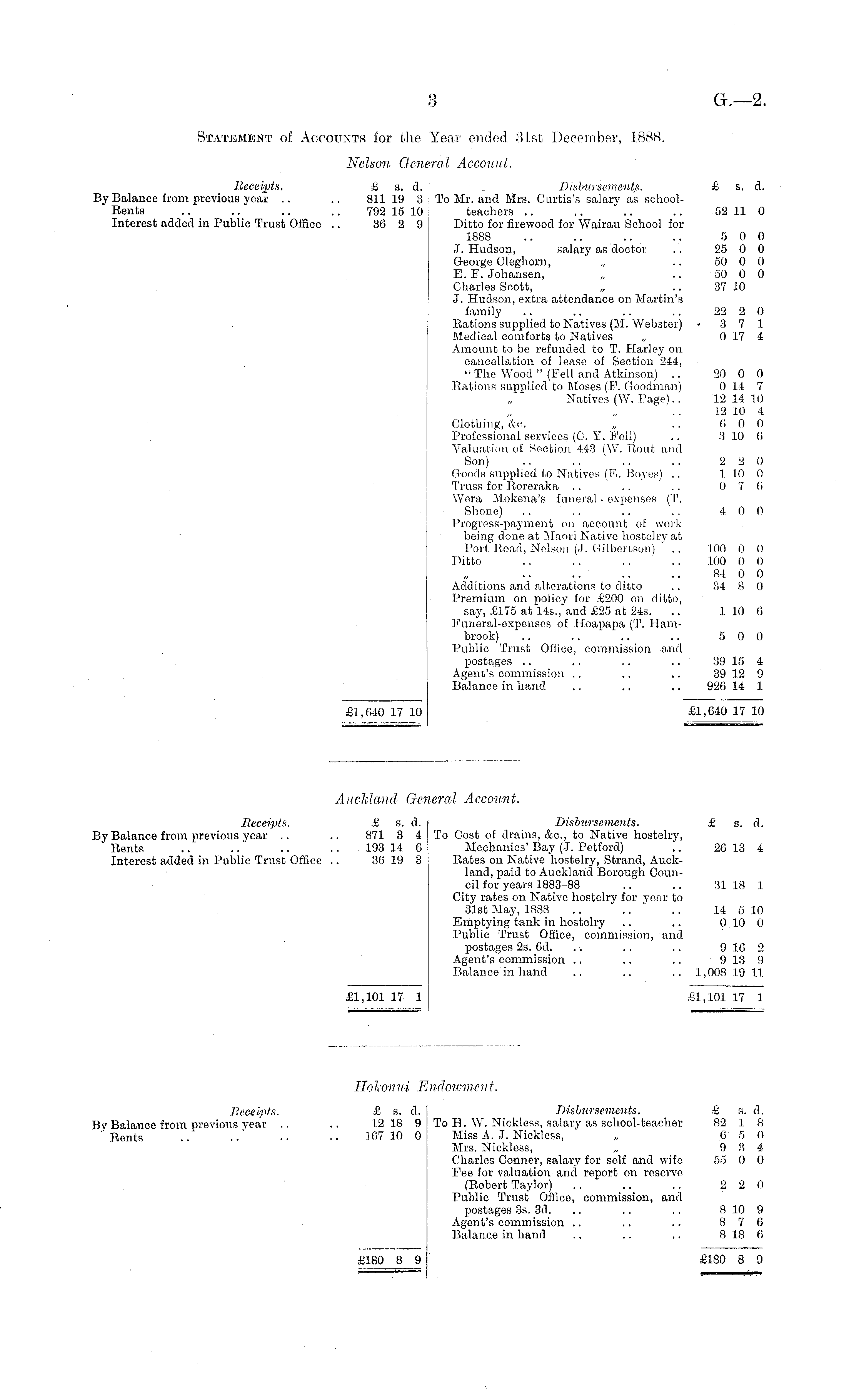 Statement of Accounts for the Year ended 31st December, 1888. Nelson General Account. Receipts. £ s. d. _ Disbursements. £ s. d. By Balance from previous year .. .. 811 19 3 To Mr. and Mrs. Curtis's salary as schoolRents .. .. .. .. 792 15 10 teachers .. .. .. .. 52 11 0 Interest added in Public Trust Office .. 36 2 9 Ditto for firewood for Wairau School for 1888 .. .. .. .. 5 0 0 J.Hudson, salary as doctor .. 25 0 0 George Cleghorn, „ .. 50 0 0 E. F. Johansen, „ .. 50 0 0 Charles Scott, „ 37 10 J. Hudson, extra attendance on Martin's family .. .. .. .. 22 2 0 llations supplied to Natives (M. Webster) • 3 7 1 Medical comforts to Natives „ 0 17 4 Amount to be refunded to T. Harley on cancellation of lease of Section 244, " The Wood " (Pell and Atkinson) .. 20 0 0 Rations supplied to Moses (P. Goodman) 0 14 7 Natives (W. Page).. 12 14 10 „ 12 10 4 Clothing, An. „ .. (i 0 0 Professional services (0. Y. Pell) .. 310 fi Valuation of Section 443 (W. "Rout and Son) .. .. .. .. 2 2 0 Goods supplied to Natives (E. Boyes) .. 1 10 0 Truss for Kororaka .. .. .. 0 7 6 Wora Mokena's funeral - expenses (T. Shono) .. .. .. .. 4 0 0 Progress-payment mi account of work being done at Maori Native hostelry at Port. Roan, Nelson {J. Gilbertson) .. 100 0 0 Ditto .. .. .. .. 100 0 0 84 0 0 Additions and alterations to ditto .. 34 8 0 Premium on policy for £200 on ditto, say, £175 at 145., and £25 at 245. .. 110 0 Funeral-expenses of Hoapapa (T. Hambrook) .. .. .. .. 5 0 0 Public Trust Office, commission and postages .. .. .. .. 39 15 4 Agent's commission .. .. .. 39 12 9 Balance in hand .. .. .. 926 14 1 £1,640 17 10 £1,640 17 10