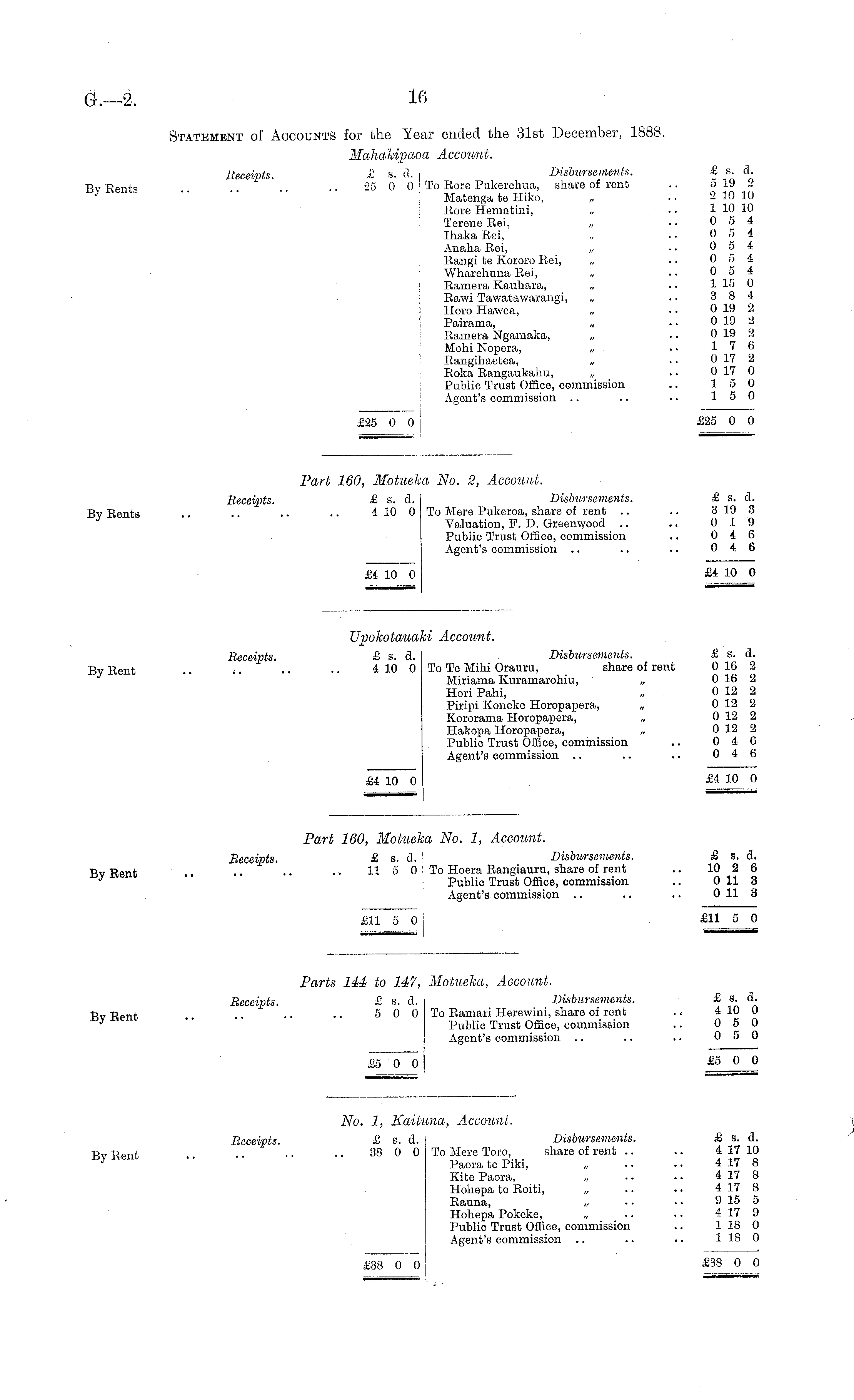 Statement of Accounts for the Year ended the 31st December, 1888. Mahakipaoa Account. Receipts. & a. d. | Disbursements. £ b. d. Rv Rpnt-s 25 0 0i To Bore Pukerehua, share of rent .. 519 2 yiventS i Matenga te Hiko, „ .. 210 10 Bore Hematini, „ .. 1 10 10 Terene Bei, „ • • 0 5 4 j Ihakaßei, „ .. 0 5 4 Anaha Bei, „ ..054 Eangi te Kororo Bei, „ .. 0 5 4 I Wharehuna Bei, „ .. 0 5 4 I Bamera Kauhara, „ .. 1 15 0 j Bawi Tawat awarangi, „ • ■ 3 8 4 Horo Hawea, „ • • 0 19 2 j Pairama, „ ■ ■ 0 19 2 Bamera Ngamaka, „ • • 0 19 2 Mohi Nopera, „ . • 17 6 Bangihaetea, „ .. 0 17 2 Boka Bangaukahu, „ ■ • 0 17 0 Public Trust Office, commission .. 15 0 Agent's commission .. .. .. 15 0 £25 0 0 j £25 0 0