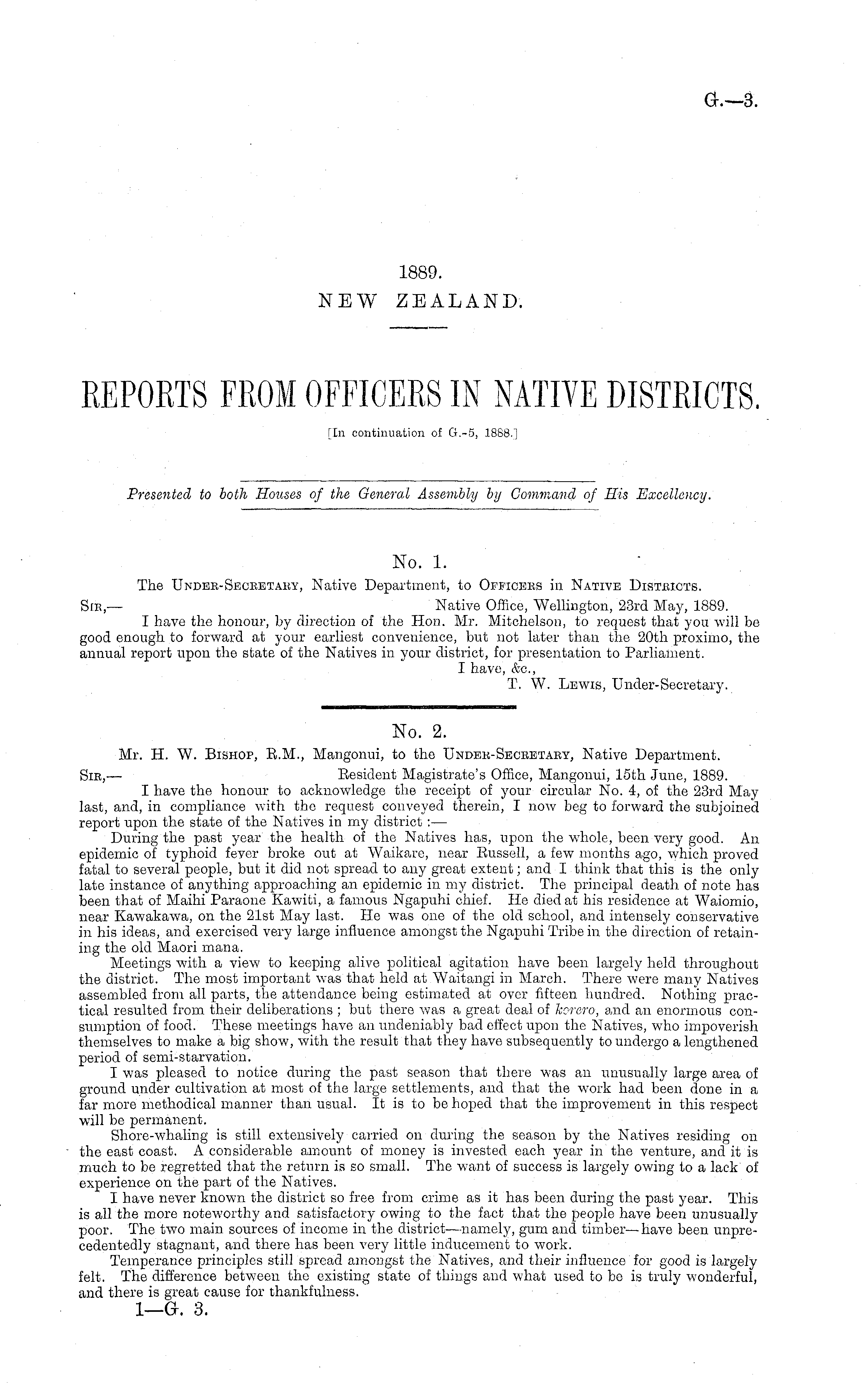 No. 1. The Under-Secretary, Native Department, to Officers in Native Districts. Sir,— Native Office, Wellington, 23rd May, 1889. I have the honour, by direction of the Hon. Mr. Mitchelson, to request that you will be good enough to forward at your earliest convenience, but not later than the 20th proximo, the annual report upon the state of the Natives in your district, for presentation to Parliament. I have, &c, T. W. Lewis, Under-Secretary. No. 2. Mr. H. W. Bishop, R.M., Mangonui, to the Under-Secretary, Native Department. Sir, —■ Resident Magistrate's Office, Mangonui, 15th June, 1889. I have the honour to acknowledge the receipt of your circular No. 4, of the 23rd May last, and, in compliance with the request conveyed therein, I now beg to forward the subjoined report upon the state of the Natives in my district : — During the past year the health of the Natives has, upon the whole, been very good. An epidemic of typhoid fever broke out at Waikare, near Russell, a few months ago, which proved fatal to several people, but it did not spread to any great extent; and I think that this is the only late instance of anything approaching an epidemic in my district. The principal death of note has been that of Maihi Paraone Kawiti, a famous Ngapuhi chief. He died at his residence at Waiomio, near Kawakawa, on the 21st May last. He was one of the old school, and intensely conservative in his ideas, and exercised very large influence amongst the Ngapuhi Tribe in the direction of retaining the old Maori mana. Meetings with a view to keeping alive political agitation have been largely held throughout the district. The most important was that held at Waitangi in March. There were many Natives assembled from all parts, the attendance being estimated at over fifteen hundred. Nothing practical resulted from their deliberations ; but there was a great deal of horero, and an enormous consumption of food. These meetings have an undeniably bad effect upon the Natives, who impoverish themselves to make a big show, with the result that they have subsequently to undergo a lengthened period of semi-starvation. I was pleased to notice during the past season that there was an unusually large area of ground under cultivation at most of the large settlements, and that the work had been done in a far more methodical manner than usual. It is to be hoped that the improvement in this respect will be permanent. Shore-whaling is still extensively carried on during the season by the Natives residing on the east coast. A considerable amount of money is invested each year in the venture, and it is much to be regretted that the return is so small. The want of success is largely owing to a lack of experience on the part of the Natives. I have never known the district so free from crime as it has been during the past year. This is all the more noteworthy and satisfactory owing to the fact that the people have been unusually poor. The two main sources of income in the district —namely, gum and timber—have been unprecedentedly stagnant, and there has been very little inducement to work. Temperance principles still spread amongst the Natives, and their influence for good is largely felt. The difference between the existing state of things and what used to be is truly wonderful, and there is great cause for thankfulness. I—Gr. 3.