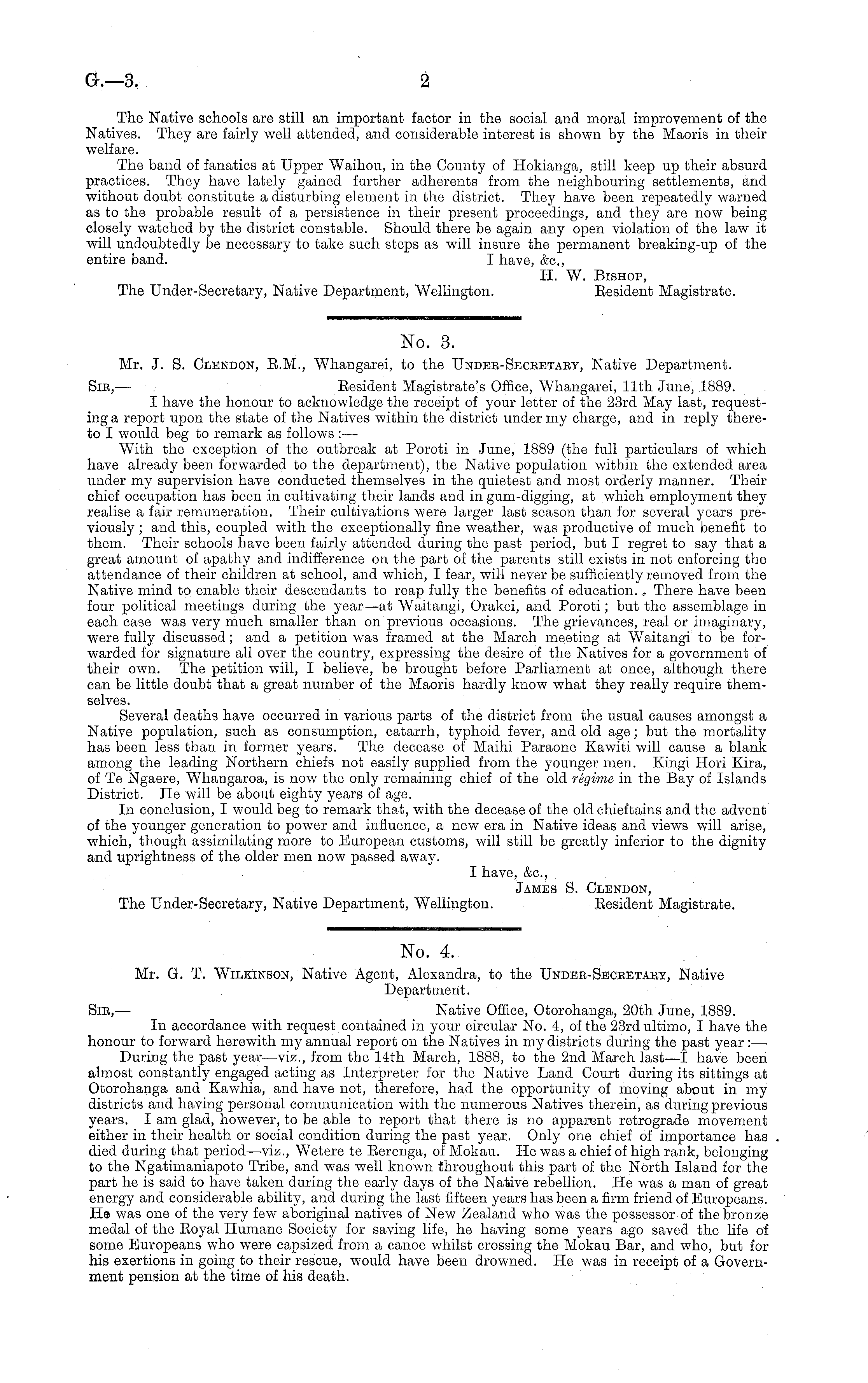 The Native schools are still an important factor in the social and moral improvement of the Natives. They are fairly well attended, and considerable interest is shown by the Maoris in their welfare. The band of fanatics at Upper Waihou, in the County of Hokianga, still keep up their absurd practices. They have lately gained further adherents from the neighbouring settlements, and without doubt constitute a disturbing element in the district. They have been repeatedly warned as to the probable result of a persistence in their present proceedings, and they are now being closely watched by the district constable. Should there be again any open violation of the law it will undoubtedly be necessary to take such steps as will insure the permanent breaking-up of the entire band. I have, &c, H. W. Bishop, The Under-Secretary, Native Department, Wellington. Resident Magistrate. No. 3. Mr. J. S. Clendon, R.M., Whangarei, to the Under-Secretary, Native Department. Sir, — Resident Magistrate's Office, Whangarei, 11th June, 1889. I have the honour to acknowledge the receipt of your letter of the 23rd May last, requesting a report upon the state of the Natives within the district under my charge, and in reply thereto I would beg to remark as follows : — With the exception of the outbreak at Poroti in June, 1889 (the full particulars of which have already been forwarded to the department), the Native population within the extended area under my supervision have conducted themselves in the quietest and most orderly manner. Their chief occupation has been in cultivating their lands and in gum-digging, at which employment they realise a fair remuneration. Their cultivations were larger last season than for several years previously ; and this, coupled with the exceptionally fine weather, was productive of much benefit to them. Their schools have been fairly attended during the past period, but I regret to say that a great amount of apathy and indifference on the part of the parents still exists in not enforcing the attendance of their children at school, and which, I fear, will never be sufficiently removed from the Native mind to enable their descendants to reap fully the benefits of education. , There have been four political meetings during the year—at Waitangi, Orakei, and Poroti; but the assemblage in each case was very much smaller than on previous occasions. The grievances, real or imaginary, were fully discussed; and a petition was framed at the March meeting at Waitangi to be forwarded for signature all over the country, expressing the desire of the Natives for a government of their own. The petition will, I believe, be brought before Parliament at once, although there can be little doubt that a great number of the Maoris hardly know what they really require themselves. Several deaths have occurred in various parts of the district from the usual causes amongst a Native population, such as consumption, catarrh, typhoid fever, and old age; but the mortality has been less than in former years. The decease of Maihi Paraone Kawiti will cause a blank among the leading Northern chiefs not easily supplied from the younger men. Kingi Hori Kira, of Te Ngaere, Whangaroa, is now the only remaining chief of the old regime in the Bay of Islands District. He will be about eighty years of age. In conclusion, I would beg to remark that, with the decease of the old chieftains and the advent of the younger generation to power and influence, a new era in Native ideas and views will arise, which, though assimilating more to European customs, will still be greatly inferior to the dignity and uprightness of the older men now passed away. I have, &c, James S. Clendon, The Under-Secretary, Native Department, Wellington. Resident Magistrate. No. 4. Mr. G. T. Wilkinson, Native Agent, Alexandra, to the Under-Secretary, Native Department. Sir, — Native Office, Otorohanga, 20th June, 1889. In accordance with request contained in your circular No. 4, of the 23rd ultimo, I have the honour to forward herewith my annual report on the Natives in my districts during the past year : — During the past year— viz., from the 14th March, 1888, to the 2nd March last—l have been almost constantly engaged acting as Interpreter for the Native Land Court during its sittings at Otorohanga and Kawhia, and have not, therefore, had the opportunity of moving about in my districts and having personal communication with the numerous Natives therein, as during previous years. lam glad, however, to be able to report that there is no apparent retrograde movement either in their health or social condition during the past year. Only one chief of importance has died during that period—viz., Wetere te Rerenga, of Mokau. He was a chief of high rank, belonging to the Ngatimaniapoto Tribe, and was well known throughout this part of the North Island for the part he is said to have taken during the early days of the Native rebellion. He was a man of great energy and considerable ability, and during the last fifteen years has been a firm friend of Europeans. He was one of the very few aboriginal natives of New Zealand who was the possessor of the bronze medal of the Royal Humane Society for saving life, he having some years ago saved the life of some Europeans who were capsized from a canoe whilst crossing the Mokau Bar, and who, but for his exertions in going to their rescue, would have been drowned. He was in receipt of a Government pension at the time of his death.