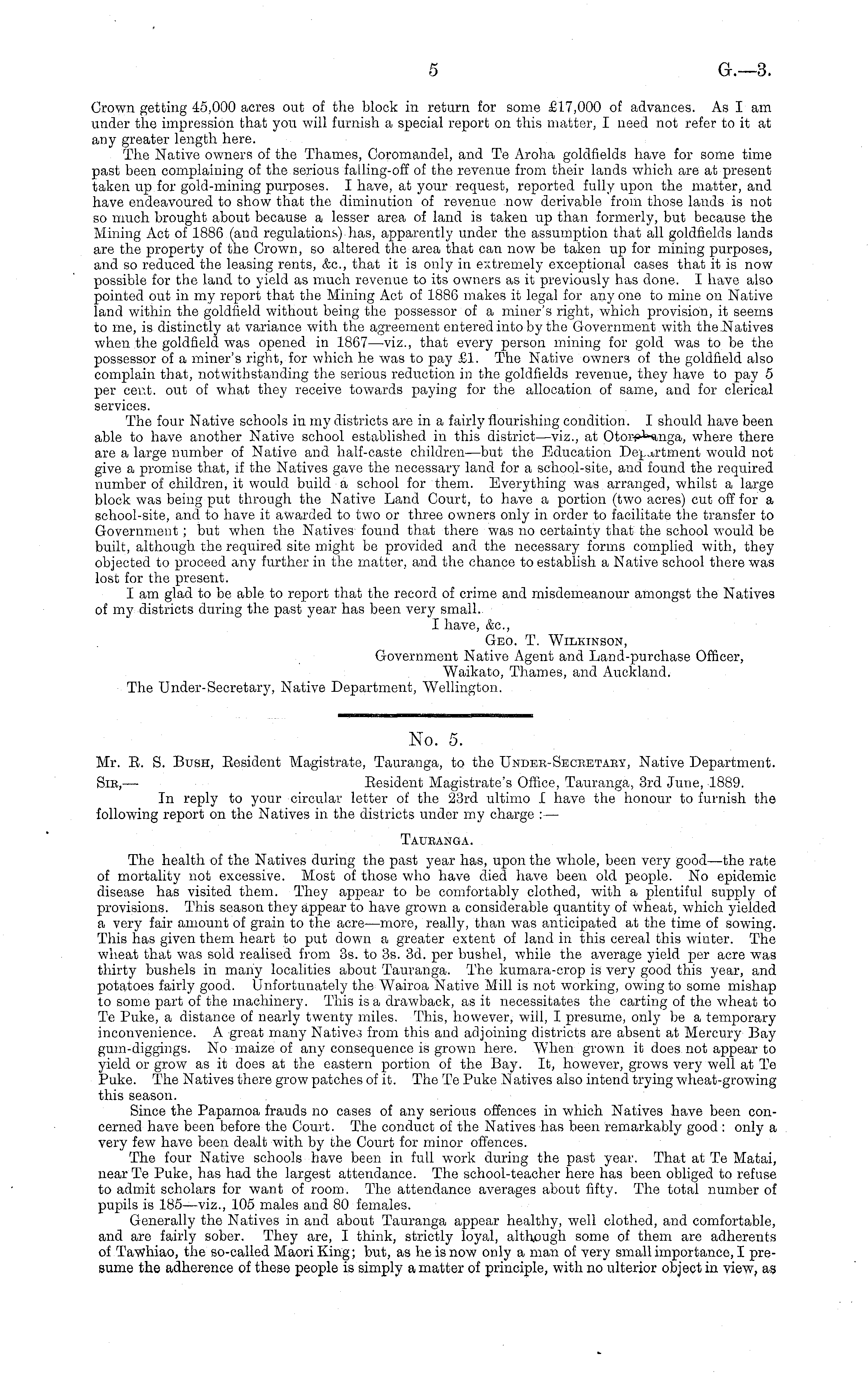 Crown getting 45,000 acres out of the block in return for some £17,000 of advances. As I am under the impression that you will furnish a special report on this matter, I need not refer to it at any greater length here. The Native owners of the Thames, Coromandel, and Te Aroha goldfields have for some time past been complaining of the serious falling-off of the revenue from their lands which are at present taken up for gold-mining purposes. I have, at your request, reported fully upon the matter, and have endeavoured to show that the diminution of revenue now derivable from those lands is not so much brought about because a lesser area of land is taken up than formerly, but because the Mining Act of 1886 (and regulations) has, apparently under the assumption that all goldfields lands are the property of the Crown, so altered the area that can now be taken up for mining purposes, and so reduced the leasing rents, &c, that it is only in extremely exceptional cases that it is now possible for the land to yield as much revenue to its owners as it previously has done. I have also pointed out in my report that the Mining Act of 1886 makes it legal for any one to mine on Native land within the goldfield without being the possessor of a miner's right, which provision, it seems to me, is distinctly at variance with the agreement entered into by the Government with the .Natives when the goldfield was opened in 1867 —viz., that every person mining for gold was to be the possessor of a miner's right, for which he was to pay £1. The Native owners of the goldfield also complain that, notwithstanding the serious reduction in the goldfields revenue, they have to pay 5 per cent, out of what they receive towards paying for the allocation of same, and for clerical services. The four Native schools in my districts are in a fairly flourishing condition. I should have been able to have another Native school established in this district—viz., at where there are a large number of Native and half-caste children—but the Education would not give a promise that, if the Natives gave the necessary land for a school-site, and found the required number of children, it would build a school for them. Everything was arranged, whilst a large block was being put through the Native Land Court, to have a portion (two acres) cut off for a school-site, and to have it awarded to two or three owners only in order to facilitate the transfer to Government ; but when the Natives found that there was no certainty that the school would be built, although the required site might be provided and the necessary forms complied with, they objected to proceed any further in the matter, and the chance to establish a Native school there was lost for the present. I am glad to be able to report that the record of crime and misdemeanour amongst the Natives of my districts during the past year has been very small. I have, Sea., Geo. T. Wilkinson, Government Native Agent and Land-purchase Officer, Waikato, Thames, and Auckland. The Under-Secretary, Native Department, Wellington. No. 5. Mr. R. S. Bush, Resident Magistrate, Tauranga, to the Under-Secretary, Native Department. Sir, — Resident Magistrate's Office, Tauranga, 3rd June, 1889. In reply to your circular letter of the 23rd ultimo I have the honour to furnish the following report on the Natives in the districts under my charge : — Tauranga. The health of the Natives during the past year has, upon the whole, been very good—the rate of mortality not excessive. Most of those who have died have been old people. No epidemic disease has visited them. They appear to be comfortably clothed, with a plentiful supply of provisions. This season they appear to have grown a considerable quantity of wheat, which yielded a very fair amount of grain to the acre —more, really, than was anticipated at the time of sowing. This has given them heart to put down a greater extent of land in this cereal this winter. The wheat that was sold realised from 3s. to 3s. 3d. per bushel, while the average yield per acre was thirty bushels in many localities about Tauranga. The kumara-crop is very good this year, and potatoes fairly good. Unfortunately the Wairoa Native Mill is not working, owing to some mishap to some part of the machinery. This is a drawback, as it necessitates the carting of the wheat to Te Puke, a distance of nearly twenty miles. This, however, will, I presume, only be a temporary inconvenience. A great many Natives from this and adjoining districts are absent at Mercury Bay gum-diggings. No maize of any consequence is grown here. When grown it does not appear to yield or grow as it does at the eastern portion of the Bay. It, however, grows very well at Te Puke. The Natives there grow patches of it. The Te Puke Natives also intend trying wheat-growing this season. Since the Papamoa frauds no cases of any serious offences in which Natives have been concerned have been before the Court. The conduct of the Natives has been remarkably good : only a very few have been dealt with by the Court for minor offences. The four Native schools have been in full work during the past year. That at Te Matai, near Te Puke, has had the largest attendance. The school-teacher here has been obliged to refuse to admit scholars for want of room. The attendance averages about fifty. The total number of pupils is 185 —viz., 105 males and 80 females. Generally the Natives in and about Tauranga appear healthy, well clothed, and comfortable, and are fairly sober. They are, I think, strictly loyal, although some of them are adherents of Tawhiao, the so-called Maori King; but, as he is now only a man of very small importance, I presume the adherence of these people is simply a matter of principle, with no ulterior object in view, as
