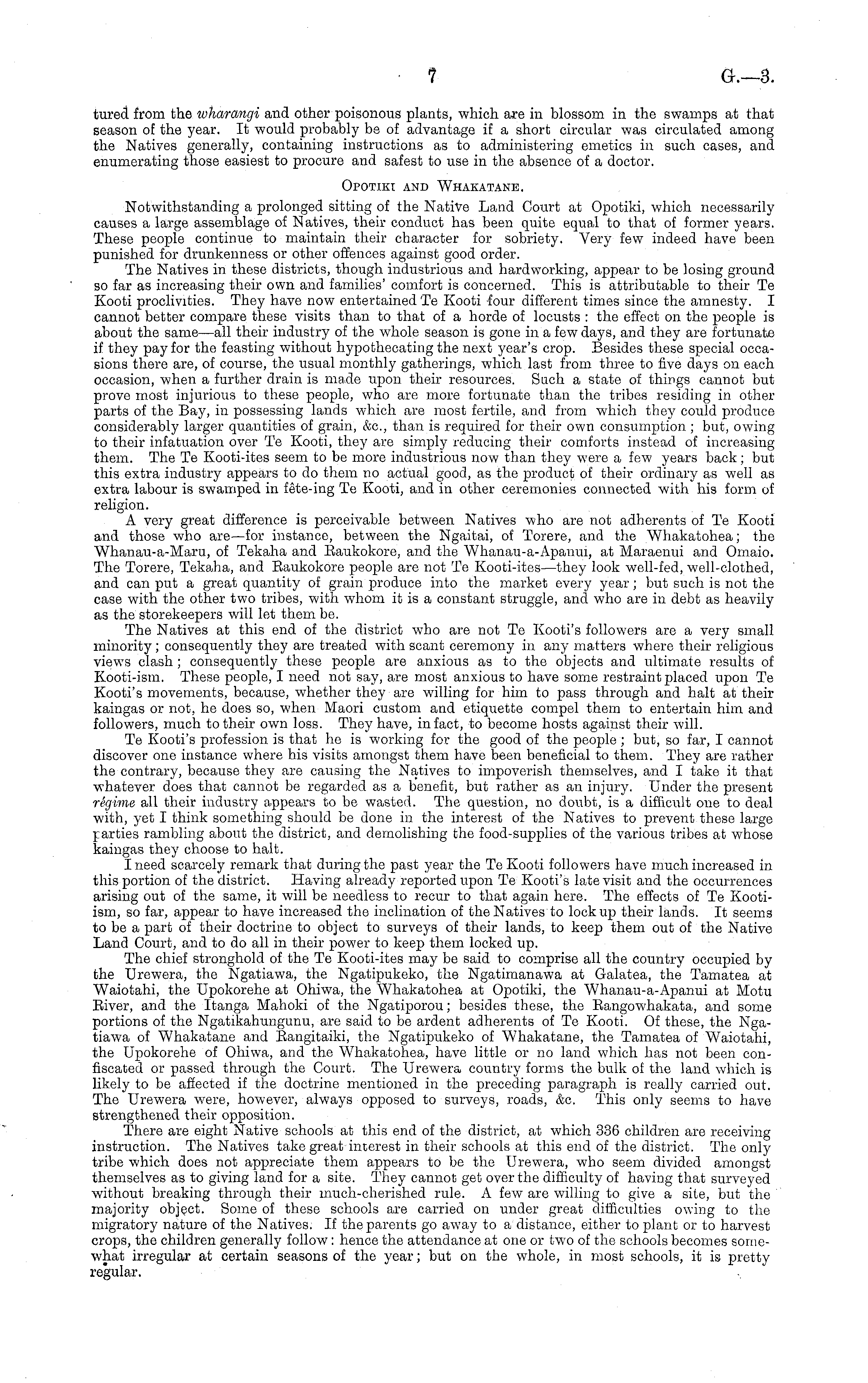 tured from the wharangi and other poisonous plants, which are in blossom in the swamps at that season of the year. It would probably be of advantage if a short circular was circulated among the Natives generally, containing instructions as to administering emetics in such cases, and enumerating those easiest to procure and safest to use in the absence of a doctor. Opotiki and Whakatane. Notwithstanding a prolonged sitting of the Native Land Court at Opotiki, which necessarily causes a large assemblage of Natives, their conduct has been quite equal to that of former years. These people continue to maintain their character for sobriety. Very few indeed have been punished for drunkenness or other offences against good order. The Natives in these districts, though industrious and hardworking, appear to be losing ground so far as increasing their own and families' comfort is concerned. This is attributable to their Te Kooti proclivities. They have now entertained Te Kooti four different times since the amnesty. I cannot better compare these visits than to that of a horde of locusts : the effect on the people is about the same—all their industry of the whole season is gone in a few days, and they are fortunate if they pay for the feasting without hypothecating the next year's crop. Besides these special occasions there are, of course, the usual monthly gatherings, which last from three to five days on each occasion, when a further drain is made upon their resources. Such a state of things cannot but prove most injurious to these people, who are more fortunate than the tribes residing in other parts of the Bay, in possessing lands which are most fertile, and from which they could produce considerably larger quantities of grain, &c, than is required for their own consumption ; but, owing to their infatuation over Te Kooti, they are simply reducing their comforts instead of increasing them. The Te Kooti-ites seem to be more industrious now than they were a few years back; but this extra industry appears to do them no actual good, as the product of their ordinary as well as extra labour is swamped in fete-ing Te Kooti, and in other ceremonies connected with his form of religion. A very great difference is perceivable between Natives who are not adherents of Te Kooti and those who are —for instance, between the Ngaitai, of Torere, and the Whakatohea; the Whanau-a-Maru, of Tekaha and Raukokore, and the Whanau-a-Apanui, at Maraenui and Omaio. The Torere, Tekaha, and Raukokore people are not Te Kooti-ites—they look well-fed, well-clothed, and can put a great quantity of grain produce into the market every year; but such is not the case with the other two tribes, with whom it is a constant struggle, and who are in debt as heavily as the storekeepers will let them be. The Natives at this end of the district who are not Te Kooti's followers are a very small minority; consequently they are treated with scant ceremony in any matters where their religious views clash; consequently these people are anxious as to the objects and ultimate results of Kooti-ism. These people, I need not say, are most anxious to have some restraint placed upon Te Kooti's movements, because, whether they are willing for him to pass through and halt at their kaingas or not, he does so, when Maori custom and etiquette compel them to entertain him and followers, much to their own loss. They have, in fact, to become hosts against their will. Te Kooti's profession is that he is working for the good of the people ; but, so far, I cannot discover one instance where his visits amongst them have been beneficial to them. They are rather the contrary, because they are causing the Natives to impoverish themselves, and I take it that whatever does that cannot be regarded as a benefit, but rather as an injury. Under the present regime all their industry appears to be wasted. The question, no doubt, is a difficult one to deal with, yet I think something should be done in the interest of the Natives to prevent these large parties rambling about the district, and demolishing the food-supplies of the various tribes at whose kaingas they choose to halt. I need scarcely remark that during the past year the Te Kooti followers have much increased in this portion of the district. Having already reported upon Te Kooti's late visit and the occurrences arising out of the same, it will be needless to recur to that again here. The effects of Te Kootiism, so far, appear to have increased the inclination of the Natives to lockup their lands. It seems to be a part of their doctrine to object to surveys of their lands, to keep them out of the Native Land Court, and to do all in their power to keep them locked up. The chief stronghold of the Te Kooti-ites may be said to comprise all the country occupied by the Urewera, the Ngatiawa, the Ngatipukeko, the Ngatimanawa at Galatea, the Tamatea at Waiotahi, the Upokorehe at Ohiwa, the Whakatohea at Opotiki, the Whanau-a-Apanui at Motu River, and the Itanga Mahoki of the Ngatiporou; besides these, the Rangowhakata, and some portions of the Ngatikahungunu, are said to be ardent adherents of Te Kooti. Of these, the Ngatiawa of Whakatane and Rangitaiki, the Ngatipukeko of Whakatane, the Tamatea of Waiotahi, the Upokorehe of Ohiwa, and the Whakatohea, have little or no land which has not been confiscated, or passed through the Court. The Urewera country forms the bulk of the land which is likely to be affected if the doctrine mentioned in the preceding paragraph is really carried out. The Urewera were, however, always opposed to surveys, roads, &c. This only seems to have strengthened their opposition. There are eight Native schools at this end of the district, at which 336 children are receiving instruction. The Natives take great interest in their schools at this end of the district. The only tribe which does not appreciate them appears to be the Urewera, who seem divided amongst themselves as to giving land for a s