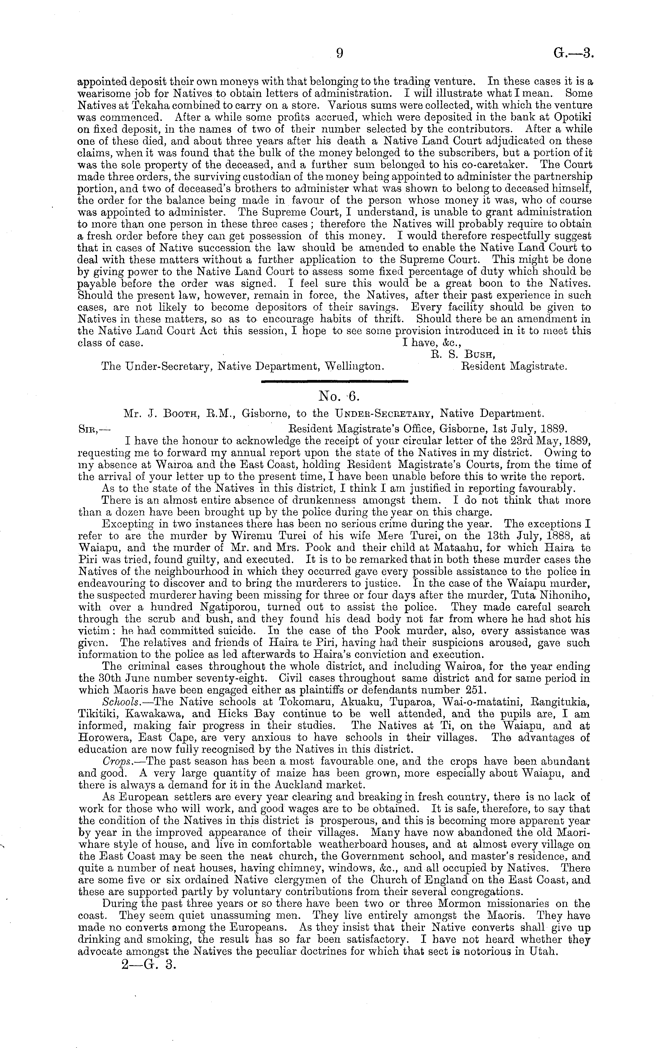 appointed deposit their own moneys with that belonging to the trading venture. In these cases it is a wearisome job for Natives to obtain letters of administration. I will illustrate what I mean. Some Natives at Tekaha combined to carry on a store. Various sums were collected, with which the venture was commenced. After a while some profits accrued, which were deposited in the bank at Opotiki on fixed deposit, in the names of two of their number selected by the contributors. After a while one of these died, and about three years after his death a Native Land Court adjudicated on these claims, when it was found that the bulk of the money belonged to the subscribers, but a portion of it was the sole property of the deceased, and a further sum belonged to his co-caretaker. The Court made three orders, the surviving custodian of the money being appointed to administer the partnership portion, and two of deceased's brothers to administer what was shown to belong to deceased himself, the order for the balance being made in favour of the person whose money it was, who of course was appointed to administer. The Supreme Court, I understand, is unable to grant administration to more than one person in these three cases ; therefore the Natives will probably require to obtain a fresh order before they can get possession of this money. I would therefore respectfully suggest that in cases of Native succession the law should be amended to enable the Native Land Court to deal with these matters without a further application to the Supreme Court. This might be done by giving power to the Native Land Court to assess some fixed percentage of duty which should be payable before the order was signed. I feel sure this would be a great boon to the Natives. Should the present law, however, remain in force, the Natives, after their past experience in such cases, are not likely to become depositors of their savings. Every facility should be given to Natives in these matters, so as to encourage habits of thrift. Should there be an amendment in the Native Land Court Act this session, I hope to see some provision introduced in it to meet this class of case. I have, &c, R. S. Bush, The Under-Secretary, Native Department, Wellington. Resident Magistrate. No. 6. Mr. J. Booth, R.M., Gisborne, to the Under-Secretary, Native Department. Sir, — Resident Magistrate's Office, Gisborne, Ist July, 1889. I have the honour to acknowledge the receipt of your circular letter of the 23rd May, 1889, requesting me to forward my annual report upon the state of the Natives in my district. Owing to my absence at Wairoa and the East Coast, holding Resident Magistrate's Courts, from the time of the arrival of your letter up to the present time, I have been unable before this to write the report. As to the state of the Natives in this district, I think I am justified in reporting favourably. There is an almost entire absence of drunkenness amongst them. I do not think that more than a dozen have been brought up by the police during the year on this charge. Excepting in two instances there has been no serious crime during the year. The exceptions I refer to are the murder by Wiremu Turei of his wife Mere Turei, on the 13th July, 1888, at Waiapu, and the murder of Mr. and Mrs. Pook and their child at Mataahu, for which Haira te Piri was tried, found guilty, and executed. It is to be remarked that in both these murder cases the Natives of the neighbourhood in which they occurred gave every possible assistance to the police in endeavouring to discover and to bring the murderers to justice. In the case of the Waiapu murder, the suspected murderer having been missing for three or four days after the murder, Tuta Nihoniho, with over a hundred Ngatiporou, turned out to assist the police. They made careful search through the scrub and bush, and they found his dead body not far from where he had shot his victim :he had committed suicide. In the case of the Pook murder, also, every assistance was given. The relatives and friends of Haira te Piri, having had their suspicions aroused, gave such information to the police as led afterwards to Haira's conviction and execution. The criminal cases throughout the whole district, and including W'airoa, for the year ending the 30th June number seventy-eight. Civil cases throughout same district and for same period in which Maoris have been engaged either as plaintiffs or defendants number 251. Schools. —The Native schools at Tokomaru, Akuaku, Tuparoa, Wai-o-matatini, Rangitukia, Tikitiki, Kawakawa, and Hicks Bay continue to be well attended, and the pupils are, I am informed, making fair progress in their studies. The Natives at Ti, on the Waiapu, and at Horowera, East Cape, are very anxious to have schools in their villages. The advantages of education are now fully recognised by the Natives in this district. Crop?;. —The past season has been a most favourable.one, and the crops have been abundant and good. A very large quantity of maize has been grown, more especially about Waiapu, and there is always a demand for it in the Auckland market. As European settlers are every year clearing and breaking in fresh country, there is no lack of work for those who will work, and good wages are to be obtained. It is safe, therefore, to say that the condition of the Natives in this district is prosperous, and this is becoming more apparent year by year in the improved appearance of their villages. Many have now abandoned the old Maoriwhare style of house, and live in comfortable weatherboard houses, and at almost every village on the East Coast may be seen the neat church, the Government school, and master's residence, and quite a number of neat houses, having chimney, windows, &c, and all. occupied by Natives. There are some five or six ordained Native clergymen of the Church of England on the East Coast, and these are supported partly by voluntary contributions from their several congregations. During the past th