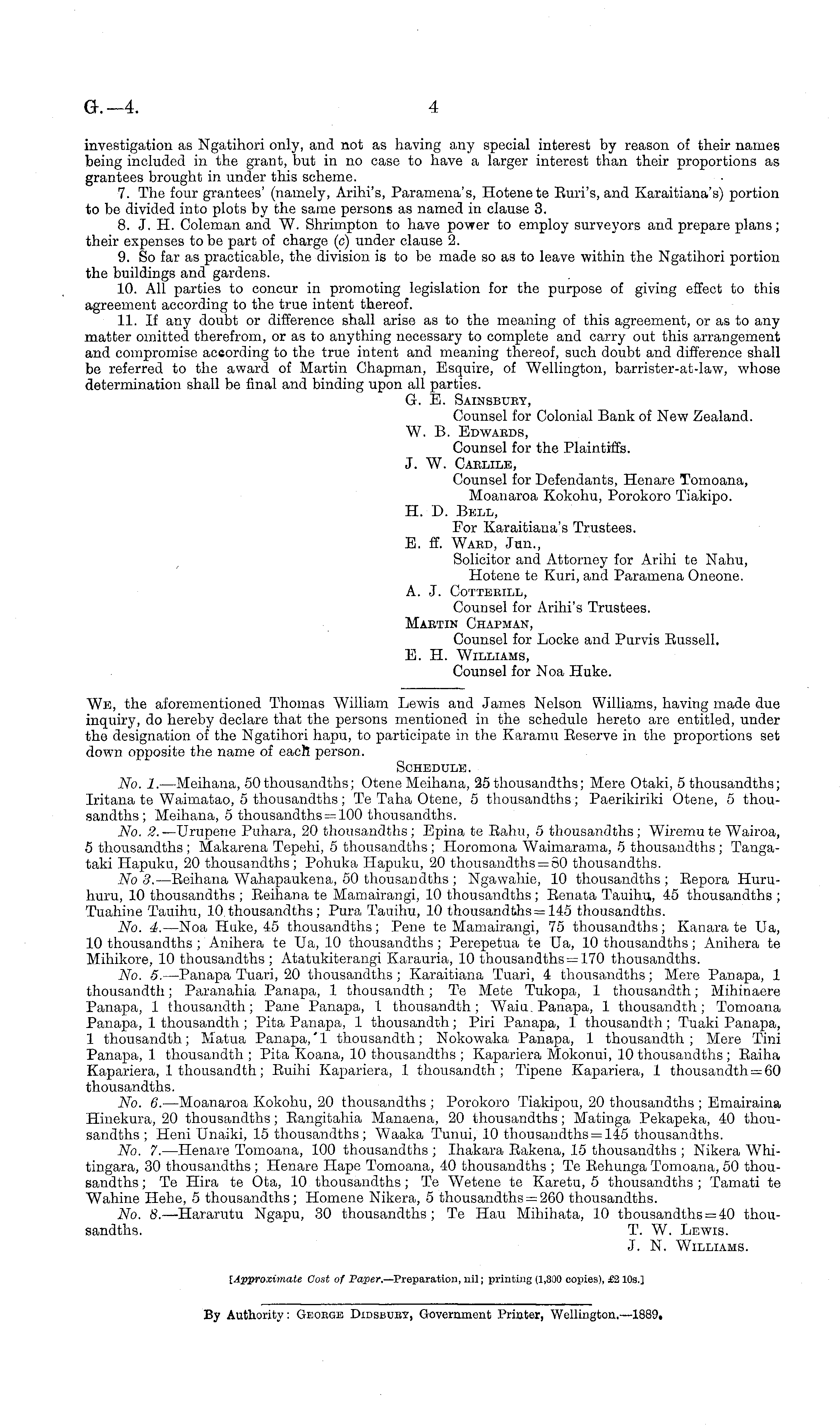 investigation as Ngatihori only, and not as having any special interest by reason of their names being included in the grant, but in no case to have a larger interest than their proportions as grantees brought in under this scheme. 7. The four grantees' (namely, Arihi's, Paramena's, Hotenete Euri's, and Karaitiana's) portion to be divided into plots by the same persons as named in clause 3. 8. J. H. Coleman and W. Shrimpton to have power to employ surveyors and prepare plans; their expenses to be part of charge (c) under clause 2. 9. So far as practicable, the division is to be made so as to leave within the Ngatihori portion the buildings and gardens. 10. All parties to concur in promoting legislation for the purpose of giving effect to this agreement according to the true intent thereof. 11. If any doubt or difference shall arise as to the meaning of this agreement, or as to any matter omitted therefrom, or as to anything necessary to complete and carry out this arrangement and compromise according to the true intent and meaning thereof, such doubt and difference shall be referred to the award of Martin Chapman, Esquire, of Wellington, barrister-at-law, whose determination shall be final and binding upon all parties. G. E. Sainsbuey, Counsel for Colonial Bank of New Zealand. W. B. Edwabds, Counsel for the Plaintiffs. J. W. Caelilb, Counsel for Defendants, Henare Tomoana, Moanaroa Kokohu, Porokoro Tiakipo. H. D. Bell, For Karaitiana's Trustees. E. ff. Wabd, Jim., Solicitor and Attorney for Arihi te Nahu, Hotene te Kuri, and Paramena Oneone. A. J. Cottebill, Counsel for Arihi's Trustees. Maetin Chapman, Counsel for Locke and Purvis Russell. E. H. Williams, Counsel for Noa Huke. We, the aforementioned Thomas William Lewis and James Nelson Williams, having made due inquiry, do hereby declare that the persons mentioned in the schedule hereto are entitled, under the designation of the Ngatihori hapu, to participate in the Karamu Eeserve in the proportions set down opposite the name of eacft person. Schedule. No. I. —Meihana, 50 thousandths; Otene Meihana, 25 thousandths; Mere Otaki, 5 thousandths; Iritana te Waimatao, 5 thousandths; Te Taha Otene, 5 thousandths; Paerikiriki Otene, 5 thousandths; Meihana, 5 thousandths = 100 thousandths. No. 2. — Urupene Puhara, 20 thousandths; Epina te Eahu, 5 thousandths; Wiremute Wairoa, 5 thousandths ; Makarena Tepehi, 5 thousandths ; Horomona Waimarama, 5 thousandths ; Tangataki Hapuku, 20 thousandths ; Pohuka Hapuku, 20 thousandths =80 thousandths. No 3. —Eeihana Wahapaukena, 50 thousandths ; Ngawahie, 10 thousandths ; Eepora Huruhuru, 10 thousandths ; Eeihana te Mamairangi, 10 thousandths; Benata Tauihu, 45 thousandths ; Tuahine Tauihu, 10 thousandths; Pura Tauihu, 10 thousandths = 145 thousandths. No. 4. —Noa Huke, 45 thousandths; Pene te Mamairangi, 75 thousandths; Kanara te Ua, 10 thousandths ; Anihera te Ua, 10 thousandths ; Perepetua te Da, 10 thousandths; Anihera te Mihikore, 10 thousandths ; Atatukiterangi Karauria, 10 thousandths = 170 thousandths. No. 5. —Panapa Tuari, 20 thousandths; Karaitiana Tuari, 4 thousandths; Mere Panapa, 1 thousandth; Paranahia Panapa, 1 thousandth; Te Mete Tukopa, 1 thousandth; Mihinaere Panapa, 1 thousandth; Pane Panapa, 1 thousandth; Wain Panapa, 1 thousandth; Tomoana Panapa, 1 thousandth ; Pita Panapa, 1 thousandth; Piri Panapa, 1 thousandth; Tuaki Panapa, 1 thousandth; Matua Panapa,'l thousandth; Nokowaka Panapa, 1 thousandth; Mere Tini Panapa, 1 thousandth ; Pita Koana, 10 thousandths ; Kapariera Mokonui, 10 thousandths ; Eaiha Kapariera, 1 thousandth; Euihi Kapariera, 1 thousandth; Tipene Kapariera, 1 thousandth =60 thousandths. No. 6. —Moanaroa Kokohu, 20 thousandths ; Porokoro Tiakipou, 20 thousandths ; Emairaina Hinekura, 20 thousandths; Eangitahia Manaena, 20 thousandths; Matinga Pekapeka, 40 thousandths ; Heni Unaiki, 15 thousandths; Waaka Tunui, 10 thousandths = 145 thousandths. No. 7. —Henare Tomoana, 100 thousandths ; Ihakara Eakena, 15 thousandths ; Nikera Whitingara, 30 thousandths ; Henare Hape Tomoana, 40 thousandths ; Te Eehunga Tomoana, 50 thousandths ; Te Hira te Ota, 10 thousandths ; Te Wetene te Karetu, 5 thousandths ; Tamati te Wahine Hehe, 5 thousandths; Homene Nikera, 5 thousandths = 260 thousandths. No. 8. —Hararutu Ngapu, 30 thousandths; Te Hau Mihihata, 10 thousandths =40 thousandths. T. W. Lewis. J. N. Williams. {Approximate Cost of Paper.—Preparation, nil; printing (1,300 copies), £2 10s.]