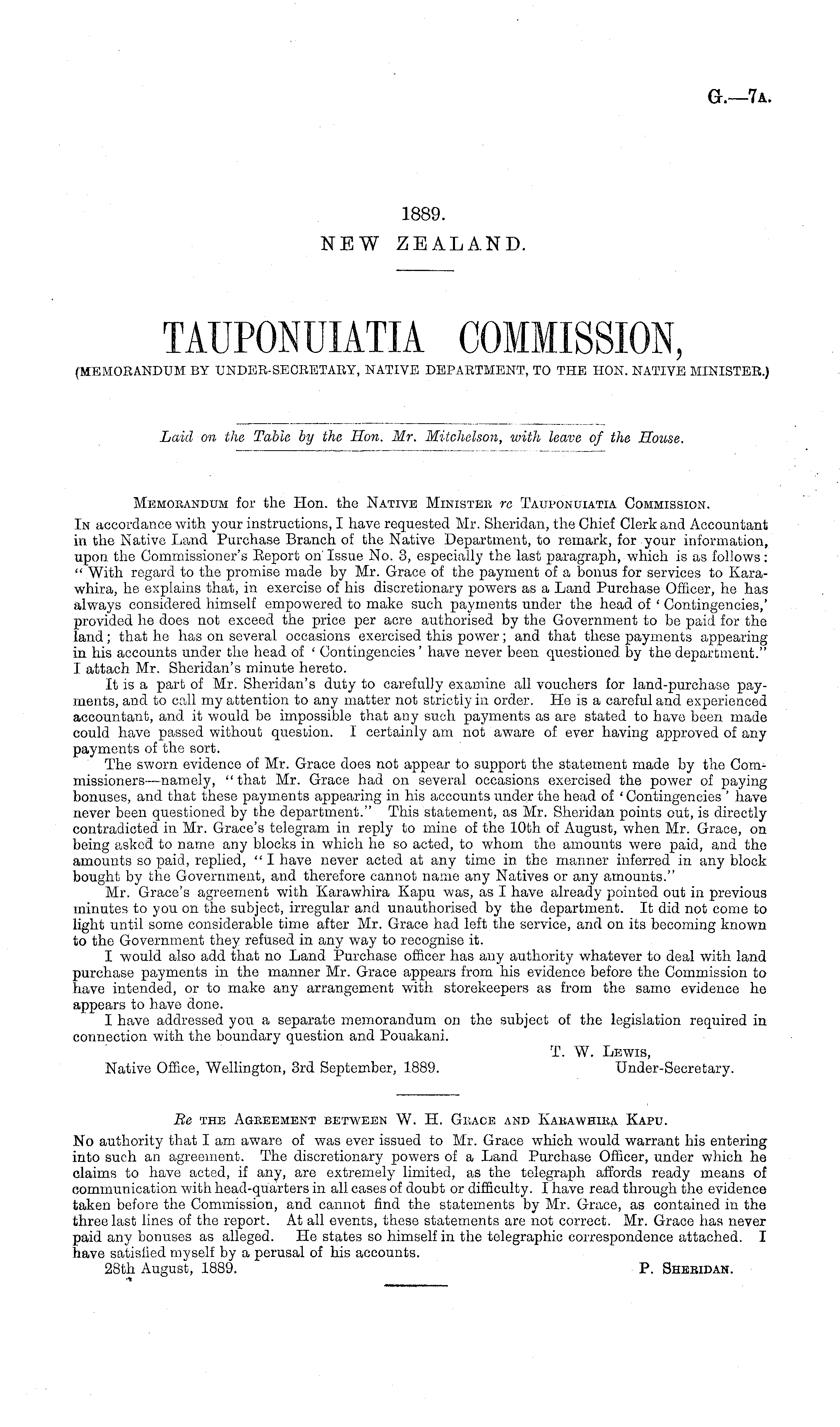 Laid on the Table by the Hon. Mr. Mitchelson, with leave of the House. Memorandum for the Hon. the Native Minister re Taubonuiatia Commission. In accordance with your instructions, I have requested Mr. Sheridan, the Chief Clerk and Accountant in the Native Land Purchase Branch of the Native Department, to remark, for your information, upon the Commissioner's Report on' Issue No. 3, especially the last paragraph, which is as follows: " With regard to the promise made by Mr. Grace of the payment of a bonus for services to Karawhira, he explains that, in exercise of his discretionary powers as a Land Purchase Officer, he has always considered himself empowered to make such payments under the head of ' Contingencies,' provided he does not exceed the price per acre authorised by the Government to be paid for the land; that he has on several occasions exercised this power; and that these payments appearing in his accounts under the head of ' Contingencies' have never been questioned by the department." I attach Mr. Sheridan's minute hereto. It is a part of Mr. Sheridan's duty to carefully examine all vouchers for land-purchase payments, and to call my attention to any matter not strictly in order. He is a careful and experienced accountant, and it would be impossible that any such payments as are stated to have been made could have passed without question. I certainly am not aware of ever having approved of any payments of the sort. The sworn evidence of Mr. Grace does not appear to support the statement made by the Commissioners—namely, " that Mr. Grace had on several occasions exercised the power of paying bonuses, and that these payments appearing in his accounts under the head of ' Contingencies ' have never been questioned by the department." This statement, as Mr. Sheridan points out, is directly contradicted in Mr. Grace's telegram in reply to mine of the 10th of August, when Mr. Grace, on being asked to name any blocks in which he so acted, to whom the amounts were paid, and the amounts so paid, replied, " I have never acted at any time in the manner inferred in any block bought by the Government, and therefore cannot name any Natives or any amounts." Mr. Grace's agreement with Karawhira Kapu was, as I have already pointed out in previous minutes to you on the subject, irregular and unauthorised by the department. It did not come to light until some considerable time after Mr. Grace had left the service, and on its becoming known to the Government they refused in any way to recognise it. I would also add that no Land Purchase officer has any authority whatever to deal with land purchase payments in the manner Mr. Grace appears from his evidence before the Commission to have intended, or to make any arrangement with storekeepers as from the same evidence he appears to have done. I have addressed you a separate memorandum on the subject of the legislation required in connection with the boundary question and Pouakani. T. W. Lewis, Native Office, Wellington, 3rd September, 1889. Under-Secretary. Be the Agreement between W. H. Grace and Kabawhiea Kapu. No authority that I am aware of was ever issued to Mr. Grace which would warrant his entering into such an agreement. The discretionary powers of a Land Purchase Officer, under which he claims to have acted, if any, are extremely limited, as the telegraph affords ready means of communication with head-quarters in all cases of doubt or difficulty. I have read through the evidence taken before the Commission, and cannot find the statements by Mr. Grace, as contained in the three last lines of the report. At all events, these statements are not correct. Mr. Grace has never paid any bonuses as alleged. He states so himself in the telegraphic correspondence attached. I have satisfied myself by a perusal of his accounts. 28th August, 1889. P. Sheridan.