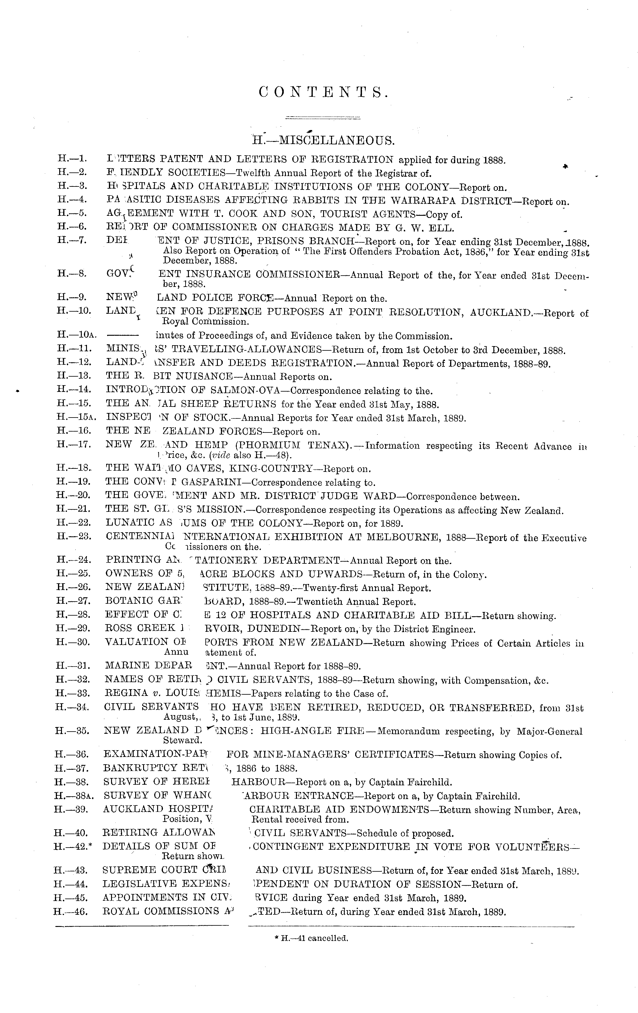 H.—MISCELLANEOUS. H.—l. I ITTERS PATENT AND LETTERS OP REGISTRATION applied for during 1888. H.—2. F. lENDLY SOCIETIES—TweIfth Annual Report of the Registrar of. H.—3. H> 3PITALS AND CHARITABLE INSTITUTIONS OP THE COLONY—Report on. H.—4. PA ASITIG DISEASES APPECTING RABBITS IN THE WAIRARAPA DISTRICT-Report on. H.—s. AGREEMENT WITH T. COOK AND SON, TOURIST AGENTS—Copy of. H.—6. REnRT OP COMMISSIONER ON CHARGES MADE BY G. W. ELL. H,—7. DEI "BINT OP JUSTICE, PRISONS BRANCH—Report on, for Year ending 31st DecemberaBBB. Also Report on Operation of " The First Offenders Probation Act, 1836," for Year ending 31st December, 1888. H.—B. GOvf ENT INSURANCE COMMISSIONER—AnnuaI Report of the, for Year ended 31st December, 1888. H.—9. NEW 0 LAND POLICE FORCE—Annual Report on the. H.—lo. LANE CEN FOR DEFENCE PURPOSES AT POINT RESOLUTION, AUCKLAND.—Report of Royal Commission. H.—loa. ■ mutes of Proceedings of, and Evidence taken by the Commission. H.—ll. MINIS'., IS' TRAVELLING-ALLOWANCES—Return of, from Ist October to 3rd December, 1888. H.—l2. LAND-, INSFER AND DEEDS REGISTRATION.—AnnuaI Report of Departments, 1888-89. H.—l3. THE R. BIT NUISANCE—AnnuaI Reports on. H.—l4. INTROEjOTION OP SALMON-OVA—Correspondence relating to the. H.—ls. THE AN. JAL SHEEP RETURNS for the Year ended 31st May, 1888. H.—lsa. INSPECT -N OF STOCK.—Annual Reports for Year ended 31st March, 1889. H.—l6. THE NE ZEALAND FORCES—Report on. H.—l7. NEW ZE. AND HEMP (PHORMIUM TENAX). —Information respecting its Recent Advance in I "rice, &c. (vide also H.—4B). H.—lB. THE WAII . .10 CAVES, KING-COUNTRY—Report on. 11.—19. THE OONVJ I 1 GASPARlNl—Correspondence relating to. H.—2o. THE GOVE. 'MENT AND MR. DISTRICT JUDGE WARD—Correspondence between. H.—2l. THE ST. GL S'S MlSSlON.—Correspondence respecting its Operations as affecting New Zealand. H.—22. LUNATIC AS ,UMS OP THE COLONY—Report on, for 1889. H.—23. CENTENNIAj NTERNATIONAL EXHIBITION AT MELBOURNE, 1888—Report of the Executive Cc lissioners on the. H.—24. PRINTING A% ' TATIONERY DEPARTMENT-Annual Report on the. H.—25. OWNERS OF 5, iCBB BLOCKS AND UPWARDS—Return, of, in the Colony. H.—26. NEW ZEALANJ STITUTE. 1888-89.—Twenty-first Annual Report. H.—27. BOTANIC GAR: BuARD, 1888-89.—Twentieth Annual Report. H.—2B. EFFECT OF C: E 12 OP HOSPITALS AND CHARITABLE AID BlLL—Return showing. H.—29. ROSS CREEK 1 RVOIR, DUNEDIN—Report on, by the District Engineer. H.—3o. VALUATION OI PORTS FROM NEW ZEALAND—Beturn showing Prices of Certain Articles in Annu atement of. H.—Bl. MARINE DEPAR 3NT.—Annual Report for 1888-89. H.—32. NAMES OF RETD-, .) CIVIL SERVANTS, 1888-89—Return showing, with Compensation, &c. H.—33. REGINA v. LOUIS; HEMlS—Papers relating to the Case of. H.— 34. CIVIL SERVANTS HO HAVE BEEN RETIRED, REDUCED, OR TRANSFERRED, from 31st August,, i, to Ist June, 1889. H.—35. NEW ZEALAND D : HIGH-ANGLE FIRE —Memorandum respecting, by Major-General Steward. H.—36. EXAMINATION-PAPi FOR MINE-MANAGERS' CERTIFICATES—Return showing Copies of. H.—37. BANKRUPTCY RET\ }, 1886 to 1888. H.—3B. SURVEY OF HEREI HARBOUR—Report on a, by Captain Fairchild. H.—3Ba. SURVEY OF WHANC "ARBOUR ENTRANCE—Report on a, by Captain Fairchild. H.—39. AUCKLAND HOSPIT^1 CHARITABLE AID ENDOWMENTS—Return showing Number, Area, Position, V Rental received from. H.—4o. RETIRING ALLOW AM ' CIVIL SERVANTS—ScheduIe of proposed. H.—42.* DETAILS OP SUM 01 , CONTINGENT EXPENDITURE _IN VOTE FOR VOLUNTEERS— Return showi. H.—43. SUPREME COURT d&Q AND CIVIL BUSINESS—Return of, for Year ended 31st March, 1889. H.—44. LEGISLATIVE EXPENSj '-PENDENT ON DURATION OF SESSION—Return of. H.—45. APPOINTMENTS IN CIV. SVICE during Year ended 31st March, 1889. H.—4G. ROYAL COMMISSIONS A 1 .TED—Return of, during Year ended 31st March, 1889.
