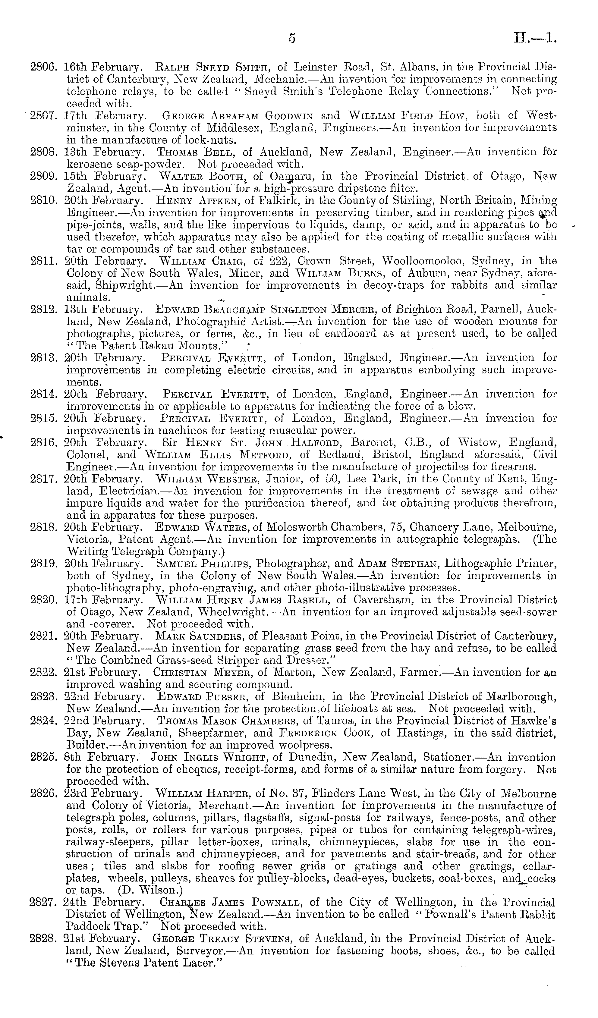 2806. 16th February. Balph Sneyd Smith, of Leinste.r Boad, St. Albans, in the Provincial District of Canterbury, New Zealand, Mechanic.—An invention for improvements in connecting telephone relays, to be called " Sneyd Smith's Telephone Belay Connections." Not proceeded with. 2807. 17th February. George Abraham Goodwin and William Field How, both of Westminster, in the County of Middlesex, England, Engineers.—An invention for improvements in the manufacture of lock-nuts. 2808. 13th February. Thomas Bell, of Auckland, New Zealand, Engineer. —An invention for kerosene soap-powder. Not proceeded with. 2809. 15th February. Walter Booth, of Oamaru, in the Provincial District of Otago, New Zealand, Agent.—An invention' for a high-pressure dripstone filter. 2810. 20fch February. Henry Aitken, of Falkirk, in the County of Stirling, North Britain, Mining Engineer.—An invention for improvements in preserving timber, and in rendering pipes a/id pipe-joints, walls, and the like impervious to liquids, damp, or acid, and in apparatus to be used therefor, which apparatus may also be applied for the coating of metallic surfaces with tar or compounds of tar and other substances. 2811. 20th February. William Craig, of 222, Crown Street, Woolloomooloo, Sydney, in the Colony of New South Wales, Miner, and William Burns, of Auburn, near Sydney, aforesaid, Shipwright.—An invention for improvements in decoy-traps for rabbits and similar animals. 2812. 13th February. Edward Beauchamp Singleton Mercer, of Brighton Boad, Parnell, Auckland, New Zealand, Photographic Artist. —An invention for the use of wooden mounts for photographs, pictures, or ferns, &c, in lieu of cardboard as at present used, to bo called " The Patent Bakau Mounts." 2813. 20th February. Percival Everitt, of London, England, Engineer.—An invention for improvements in completing electric circuits, and in apparatus embodying such improvements. 2814. 20th February. Percival Everitt, of London, England, Engineer. —An invention for improvements in or applicable to apparatus for indicating the force of a blow. 2815. 20th February. Percival Everitt, of London, England, Engineer.—An invention for improvements in machines for testing muscular power. 2816. 20th February. Sir Henry St. John Halford, Baronet, C.8., of Wistow, England, Colonel, and William Ellis Metford, of Eedlaud, Bristol, England aforesaid, Civil Engineer. —An invention for improvements in the manufacture of projectiles for firearms. 2817. 20th February. William Webster, Junior, of 50, Lee Park, in the County of Kent, England, Electrician.—An invention for improvements in the treatment of sewage and other impure liquids and water for the purification thereof, and for obtaining products therefrom, and in apparatus for these purposes. 2818. 20th February. Edward Waters, of Molesworth Chambers, 75, Chancery Lane, Melbourne, Victoria, Patent Agent.—An invention for improvements in autographic telegraphs. (The Writing Telegraph Company.) 2819. 20th February. Samuel Phillips, Photographer, and Adam Stephan, Lithographic Printer, both of Sydney, in the Colony of New South Wales. —An invention for improvements in photo-lithography, photo-engraving, and other photo-illustrative processes. 2820. 17th February. William Henry James Basell, of Caversham, in the Provincial District of Otago, New Zealand, Wheelwright. —An invention for an improved adjustable seed-sower and -coverer. Not proceeded with. 2821. 20th February. Mark Saunders, of Pleasant Point, in the Provincial District of Canterbury, New Zealand.—An invention for separating grass seed from the hay and refuse, to be called " The Combined Grass-seed Stripper and Dresser." 2822. 21st February. Christian Meyer, of Marton, New Zealand, Farmer.—An invention for an improved washing and scouring compound. 2823. 22nd February. Edward Purser, of Blenheim, in the Provincial District of Marlborough, New Zealand.—An invention for the protection of lifeboats at sea. Not proceeded with. 2824. 22nd February. Thomas Mason Chambers, of Tauroa, in the Provincial District of Hawke's Bay, New Zealand, Sheepfarmer, and Frederick Cook, of Hastings, in the said district, Builder.—An invention for an improved woolpress. 2825. Bth February. John Inglis Wright, of Dunedin, New Zealand, Stationer. —An invention for the protection of cheques, receipt-forms, and forms of a similar nature from forgery. Not proceeded with. 2826. 23rd February. William Harper, of No. 37, Flinders Lane West, in the City of Melbourne and Colony of Victoria, Merchant.—An invention for improvements in the manufacture of telegraph poles, columns, pillars, flagstaff's, signal-posts for railways, fence-posts, and other posts, rolls, or rollers for various purposes, pipes or tubes for containing telegraph-wires, railway-sleepers, pillar letter-boxes, urinals, chimneypieces, slabs for use in the construction of urinals and chimneypieces, and for pavements and stair-treads, and for other uses; tiles and slabs for roofing sewer grids or gratings and other gratings, cellarplates, wheels, pulleys, sheaves for pulley-blocks, dead-eyes, buckets, coal-boxes, and^ cocks or taps. (D. Wilson.) 2827. 24th February. Charles James Pownall, of the City of Wellington, in the Provincial District of Wellington, New Zealand. —An invention to be called " Pownall's Patent Babbit Paddock Trap." Not proceeded with. 2828. 21st February. George Treacy Stevens, of Auckland, in the Provincial District of Auckland, New Zealand, Surveyor.—An invention for fastening boots, shoes, &c, to be called "The Stevens Patent Lacer."