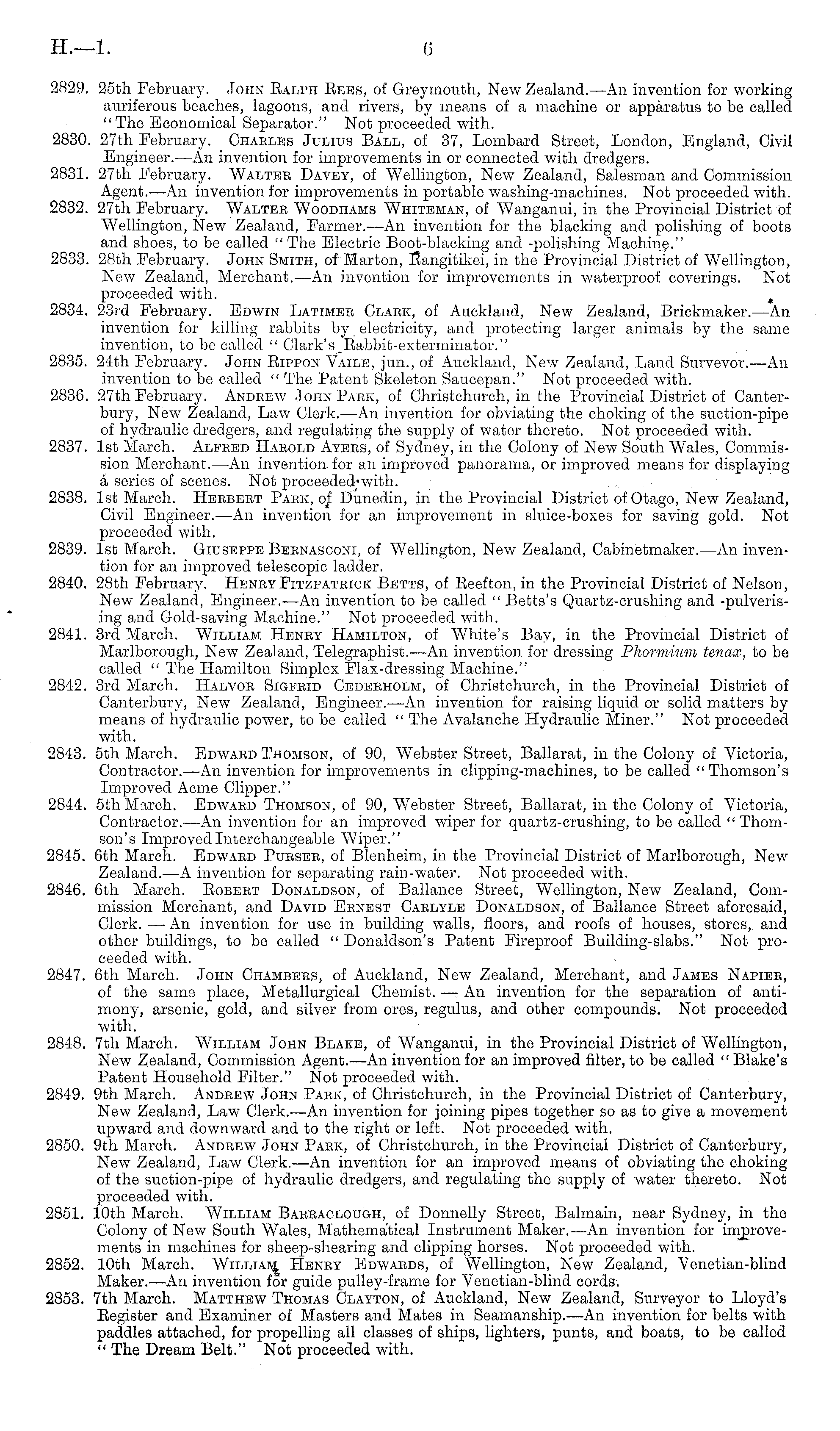 2829. 25th February. John Balph Bees, of Greymouth, New Zealand.—An invention for working auriferous beaches, lagoons, and rivers, by means of a machine or apparatus to be called "The Economical Separator." Not proceeded with. 2830. 27th February. Charles Julius Ball, of 37, Lombard Street, London, England, Civil Engineer.—An invention for improvements in or connected with dredgers. 2831. 27th February. Walter Davey, of Wellington, New Zealand, Salesman and Commission Agent.—An invention for improvements in portable washing-machines. Not proceeded with. 2832. 27th February. Walter Woodhams Whiteman, of Wanganui, in the Provincial District of Wellington, New Zealand, Farmer.—An invention for the blacking and polishing of boots and shoes, to be called "The Electric Boot-blacking and -polishing Machine." 2833. 28th February. John Smith, of Marton, Bangitikei, in the Provincial District of Wellington, New Zealand, Merchant.—An invention for improvements in waterproof coverings. Not proceeded with. 2834. 23rd February. Edwin Latimer Clark, of Auckland, New Zealand, Brickmaker. —An invention for killing rabbits by electricity, and protecting larger animals by the same invention, to be called " Clark's^Babbit-exterminator." 2835. 24th February. John Bippon Vaile, jun., of Auckland, New Zealand, Land Surveyor.—An invention to be called " The Patent Skeleton Saucepan." Not proceeded with. 2836. 27th February. Andrew John Park, of Christchurch, in the Provincial District of Canterbury, New Zealand, Law Clerk.—An invention for obviating the choking of the suction-pipe of hydraulic dredgers, and regulating the supply of water thereto. Not proceeded with. 2837. Ist March. Alfbed Harold Ayers, of Sydney, in the Colony of New South Wales, Commission Merchant.—An invention, for au improved panorama, or improved means for displaying a series of scenes. Not proceeded-with. 2838. Ist March. Herbert Park, of Dunedin, in. the Provincial District of Otago, New Zealand, Civil Engineer.—An invention for an improvement in sluice-boxes for saving gold. Not proceeded with. 2839. Ist March. Giuseppe Bernasconi, of Wellington, New Zealand, Cabinetmaker.—An invention for an improved telescopic ladder. 2840. 28th February. Henry Fitzpatrick Betts, of Beef ton, in the Provincial District of Nelson, New Zealand, Engineer. —An invention to be called " Betts's Quartz-crushing and -pulverising and Gold-saving Machine." Not proceeded with. 2841. 3rd March. William Henry Hamilton, of White's Bay, in the Provincial District of Marlborough, New Zealand, Telegraphist.—An invention for dressing Phormium tenax, to be called " The Hamilton Simplex Flax-dressing Machine." 2842. 3rd March. Halvor Sigfrid Cederholm, of Christchurch, in the Provincial District of Canterbury, New Zealand, Engineer. —An. invention for raising liquid or solid matters by means of hydraulic power, to be called " The Avalanche Hydraulic Miner." Not proceeded with. 2843. sth March. Edward Thomson, of 90, Webster Street, Ballarat, in the Colony of Victoria, Contractor.—An invention for improvements in clipping-machines, to be called " Thomson's Improved Acme Clipper." 2844. sth March. Edward Thomson, of 90, Webster Street, Ballarat, in the Colony of Victoria, Contractor.—An invention for an improved wiper for quartz-crushing, to be called "Thomson's Improved Interchangeable Wiper." 2845. 6th March. Edward Purser, of Blenheim, in the Provincial District of Marlborough, New Zealand.—A invention for separating rain-water. Not proceeded with. 2846. 6th March. Bobert Donaldson, of Ballance Street, Wellington, New Zealand, Commission Merchant, and David Ernest Carlyle Donaldson, of Ballance Street aforesaid, Clerk. —An invention for use in building walls, floors, and roofs of houses, stores, and other buildings, to be called " Donaldson's Patent Fireproof Building-slabs." Not proceeded with. 2847. 6th March. John Chambers, of Auckland, New Zealand, Merchant, and James Napier, of the same place, Metallurgical Chemist. — An invention for the separation of antimony, arsenic, gold, and silver from ores, regulus, and other compounds. Not proceeded with. 2848. 7th March. William John Blake, of Wanganui, in the Provincial District of Wellington, New Zealand, Commission Agent.—An invention for an improved filter, to be called " Blake's Patent Household Filter." Not proceeded with. 2849. 9th March. Andrew John Park, of Christchurch, in the Provincial District of Canterbury, New Zealand, Law Clerk. —An invention for joining pipes together so as to give a movement upward and downward and to the right or left. Not proceeded with. 2850. 9th March. Andrew John Park, of Christchurch, in the Provincial District of Canterbury, New Zealand, Law Clerk.—An invention for an improved means of obviating the choking of the suction-pipe of hydraulic dredgers, and regulating the supply of water thereto. Not proceeded with. 2851. 10th March. William Bareaclough, of Donnelly Street, Balmain, near Sydney, in the Colony of New South Wales, Mathematical Instrument Maker.—An invention for improvements in machines for sheep-shearing and clipping horses. Not proceeded with. 2852. 10th March. William, Henry Edwaeds, of Wellington, New Zealand, Venetian-blind Maker.—An invention for guide pulley-frame for Venetian-blind cords. 2853. 7th March. Matthew Thomas Clayton, of Auckland, New Zealand, Surveyor to Lloyd's Begister and Examiner of Masters and Mates in Seamanship.—An invention for belts with paddles attached, for propelling all classes of ships, lighters, punts, and boats, to be called " The Dream Belt." Not proceeded with.
