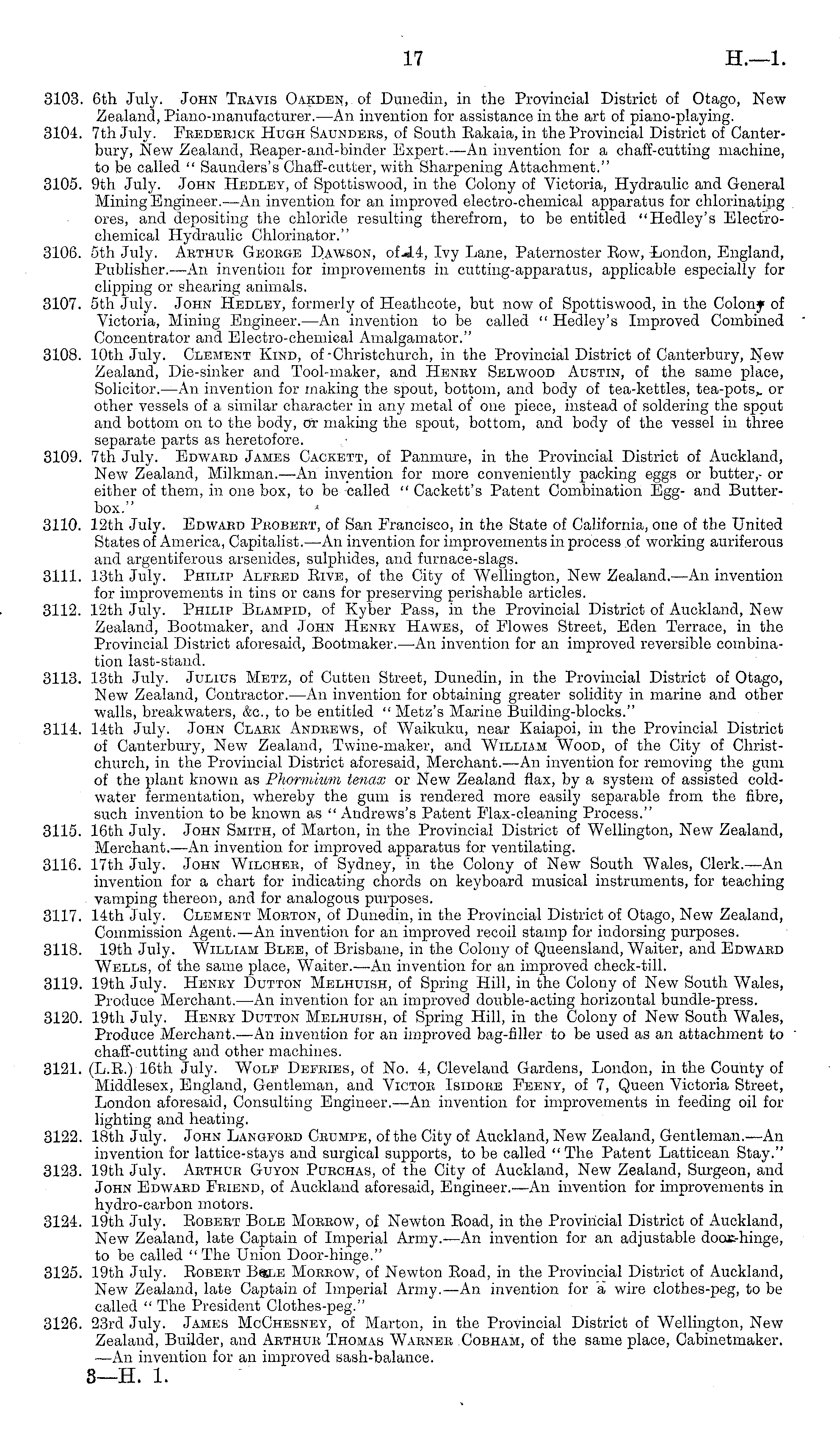 3103. 6th July. John Teavis Oakden, of Dunedin, in the Provincial District of Otago, New Zealand, Piano-manufacturer.—An invention for assistance in the art of piano-playing. 3104. 7th July. Feederick Hugh Saunders, of South Bakaia, in the Provincial District of Canterbury, New Zealand, Beaper-and-binder Expert.—An invention for a chaff-cutting machine, to be called " Saunders's Chaff-cutter, with Sharpening Attachment." 3105. 9th July. John Hedley, of Spottiswood, in the Colony of Victoria, Hydraulic and General Mining Engineer.—An invention for an improved electro-chemical apparatus for chlorinating ores, and depositing the chloride resulting therefrom, to be entitled "Hedley's Electrochemical Hydraulic Chlorinator." 3106. sth July. Arthur Geoege Dawson, ofJ.4, Ivy Lane, Paternoster Bow, London, England, Publisher.—An invention for improvements in cutting-apparatus, applicable especially for clipping or shearing animals. 3107. sth July. John Hedley, formerly of Heathcote, but now of Spottiswood, in the Colony of Victoria, Mining Engineer. —An invention to be called " Hedley's Improved Combined Concentrator and Electro-chemical Amalgamator." 3108. 10th July. Clement Kind, of Christchurch, in the Provincial District of Canterbury, New Zealand, Die-sinker and Tool-maker, and Henry Selwood Austin, of the same place, Solicitor. —An invention for making the spout, bottom, and body of tea-kettles, tea-pots,, or other vessels of a similar character in any metal of one piece, instead of soldering the spout and bottom on to the body, ox making the spout, bottom, and body of the vessel in three separate parts as heretofore. 3109. 7th July. Edward James Cackett, of Panmure, in the Provincial District of Auckland, New Zealand, Milkman.—x\n invention for more conveniently packing eggs or butter, or either of them, in one box, to be called " Cackett's Patent Combination Egg- and Butterbox." 3110. 12th July. Edward Probert, of San Francisco, in the State of California, one of the United States of America, Capitalist. —An invention for improvements in process of working auriferous and argentiferous arsenides, sulphides, and furnace-slags. 3111. 13th July. Philip Alfred Bive, of the City of Wellington, New Zealand.—An invention for improvements in tins or cans for preserving perishable articles. 3112. 12th July. Philip Blampid, of Kyber Pass, in the Provincial District of Auckland, New Zealand, Bootmaker, and John Henry Hawes, of Flowes Street, Eden Terrace, in the Provincial District aforesaid, Bootmaker. —An invention for an improved reversible combination last-stand. 3113. 13th July. Julius Metz, of Cutten Street, Dunedin, in the Provincial District of Otago, New Zealand, Contractor.—An invention for obtaining greater solidity in marine and other walls, breakwaters, &c, to be entitled " Metz's Marine Building-blocks." 3114. 14th July. John Clark Andrews, of Waikuku, near Kaiapoi, in the Provincial District of Canterbury, New Zealand, Twine-maker, and William Wood, of the City of Christchurch, in the Provincial District aforesaid, Merchant.—An invention for removing the gum of the plant known as Phormium tenax or New Zealand flax, by a system of assisted coldwater fermentation, whereby the gum is rendered more easily separable from the fibre, such invention to be known as " Andrews's Patent Flax-cleaning Process." 3115. 16th July. John Smith, of Marton, in the Provincial District of Wellington, New Zealand, Merchant. —An invention for improved apparatus for ventilating. 3116. 17th July. John Wilcher, of Sydney, in the Colony of New South Wales, Clerk.—An invention for a chart for indicating chords on keyboard musical instruments, for teaching vamping thereon, and for analogous purposes. 3117. 14th July. Clement Morton, of Dunedin, in the Provincial District of Otago, New Zealand, Commission Agent.—An invention for an improved recoil stamp for indorsing purposes. 3118. 19th July. William Blee, of Brisbane, in the Colony of Queensland, W xaiter, and Edward Wells, of the same place, Waiter.—-An invention for an improved check-till. 3119. 19th July. Henry Dutton Melhuish, of Spring Hill, in the Colony of New South Wales, Produce Merchant. —An invention for an improved double-acting horizontal bundle-press. 3120. 19th July. Henry Dutton Melhuish, of Spring Hill, in the Colony of New South Wales, Produce Merchant.—An invention for an improved bag-filler to be used as an attachment to chaff-cutting and other machines. 3121. (L.8.) 16th July. Wolf Defries, of No. 4, Cleveland Gardens, London, in the County of Middlesex, England, Gentleman, and Victor Isidore Feeny, of 7, Queen Victoria Street, London aforesaid, Consulting Engineer.—An invention for improvements in feeding oil for lighting and heating. 3122. 18th July. John Langford Crumte, of the City of Auckland, New Zealand, Gentleman.—An invention for lattice-stays and surgical supports, to be called " The Patent Latticean Stay." 3123. 19th July. Arthur Guyon Puechas, of the City of Auckland, New Zealand, Surgeon, and John Edwaed Friend, of Auckland aforesaid, Engineer.—An invention for improvements in hydro-carbon motors. 3124. 19th July. Bobert Bole Morrow, of Newton Boad, in the Provincial District of Auckland, New Zealand, late Captain of Imperial Army.—An invention for an adjustable door-hinge, to be called "The Union Door-hinge." 3125. 19th July. Bobert Bsle Morrow, of Newton Boad, in the Provincial District of Auckland, New Zealand, late Captain of Imperial Army.—An invention for a wire clothes-peg, to be called " The President Clothes-peg." 3126. 23rd July. James McChesney, of Marton, in the Provincial District of AVellington, New Zealand, Builder, and Arthur Thomas Warner Cobham, of the same place, Cabinetmaker. —An invention for an improved sash-balance. B—H. 1.