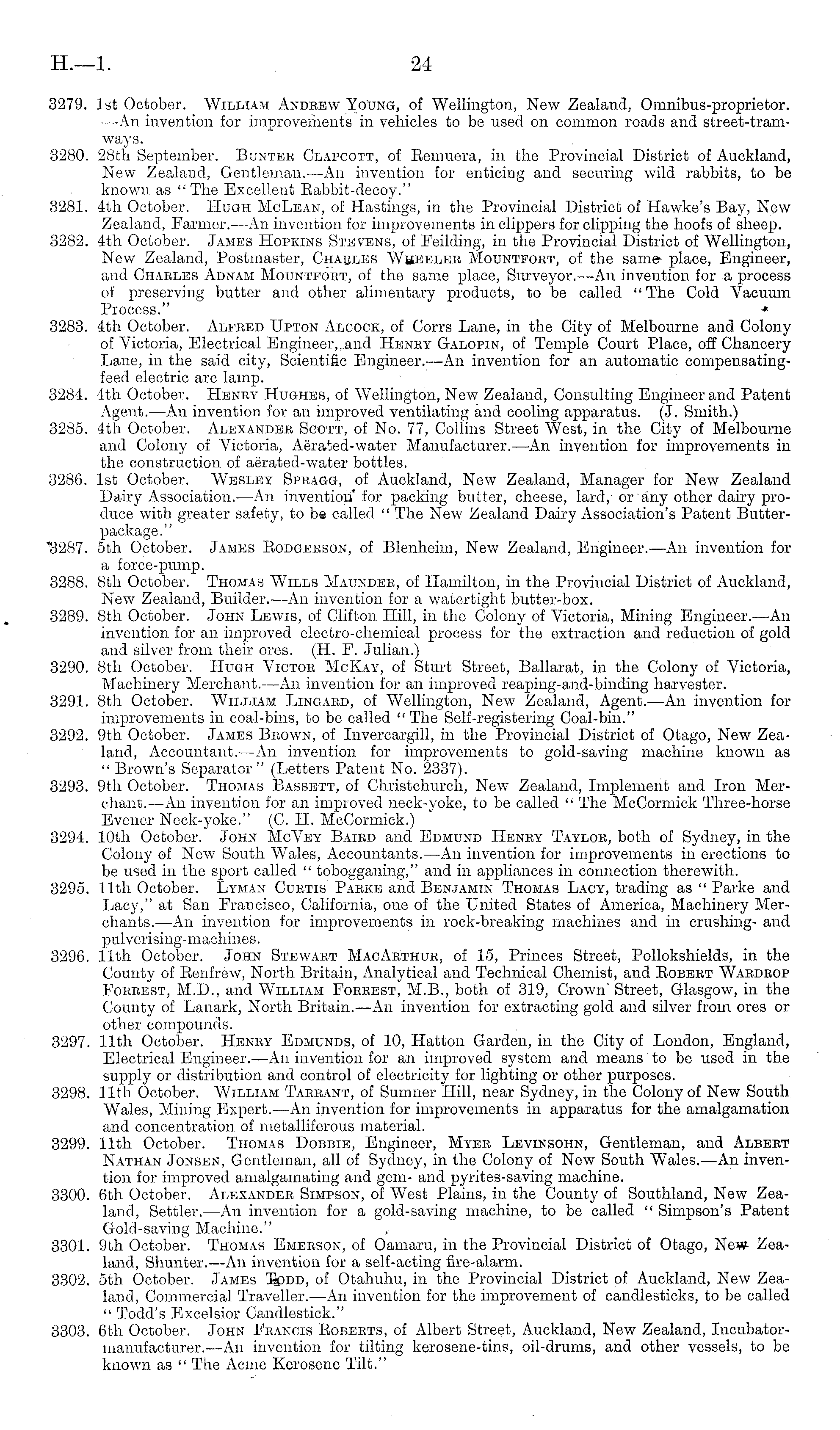 3279. Ist October. William Andrew Young, of Wellington, New Zealand, Omnibus-proprietor. —An invention for improvements in vehicles to be used on common roads and street-tram-ways. 3280. 28th September. Bunter Clapcott, of Bemuera, in the Provincial District of Auckland, New Zealand, Gentleman.—An invention for enticing and securing wild rabbits, to be known as "The Excellent Babbit-decoy." 3281. 4th October. Hugh McLean, of Hastings, in the Provincial District of Hawke's Bay, New Zealand, Farmer. —An invention for improvements in clippers for clipping the hoofs of sheep. 3282. 4th October. James Hopkins Stevens, of Feilding, in the Provincial District of Wellington, New Zealand, Postmaster, Charles Wheeler Mountfort, of the same- place, Engineer, and Charles Adnam Mountfort, of the same place, Surveyor.—An invention for a process of preserving butter and other alimentary products, to be called " The Cold Vacuum Process." 3283. 4th October. Alfred Upton Alcock, of Corrs Lane, in the City of Melbourne and Colony of Victoria, Electrical Engineer,, and Heney Galopin, of Temple Court Place, off Chancery Lane, in the said city, Scientific Engineer.—An invention for an automatic compensatingfeed electric arc lamp. 3284. 4th October. Heney Hughes, of Wellington, New Zealand, Consulting Engineer and Patent Agent. —An invention for an improved ventilating and cooling apparatus. (J. Smith.) 3285. 4th October. Alexander Scott, of No. 77, Collins Street West, in the City of Melbourne and Colony of Victoria, Aerated-water Manufacturer.—An invention for improvements in the construction of aerated-water bottles. 3286. Ist October. Wesley Spragg, of Auckland, New Zealand, Manager for New Zealand Dairy Association. —An invention" for packing butter, cheese, lard, or any other dairy produce with greater safety, to be called " The New Zealand Dairy Association's Patent Butterpackage." '3287. sth October. James Bodgerson, of Blenheim, New Zealand, Engineer.—An invention for a force-pump. 3288. Bth October. Thomas Wills Maunder, of Hamilton, in the Provincial District of Auckland, New Zealand, Builder.—An invention for a watertight butter-box. 3289. Bth October. John Lewis, of Clifton Hill, in the Colony of Victoria, Mining Engineer. —An invention for an improved electro-chemical process for the extraction and reduction of gold and silver from their ores. (H. F. Julian.) 3290. Bth October. Hugh Victor McKay, of Sturt Street, Ballarat, in the Colony of Victoria, Machinery Merchant.—An invention for an improved reaping-and-bindiiig harvester. 3291. Bth October. William Lingard, of Wellington, New Zealand, Agent.—An invention for iniprovements in coal-bins, to be called "The Self-registering Coal-bin." 3292. 9th October. James Brown, of Invercargill, in the Provincial District of Otago, New Zealand, Accountant. —An invention for improvements to gold-saving machine known as "Brown's Separator" (Letters Patent No. 2337). 3293. 9th October. Thomas Bassett, of Christchurch, New Zealand, Implement and Iron Merchant.—An invention for an improved neck-yoke, to be called " The McCormick Three-horse Evener Neck-yoke." (C. H. McCormick.) 3294. 10th October. John McVey Baird and Edmund Henry Tayloe, both of Sydney, in the Colony of New South Wales, Accountants. —An invention for improvements in erections to be used in the sport called " tobogganing," and in appliances in connection therewith. 3295. llth October. Lyman Cuetis Paeke and Benjamin Thomas Lacy, trading as " Parke and Lacy," at San Francisco, California, one of the United States of America, Machinery Merchants.—An invention for improvements in rock-breaking machines and in crushing- and pulverising-machiues. 3296. llth October. John Stewart Mac Arthur, of 15, Princes Street, Pollokshields, in the County of Benfrew, North Britain, Analytical and Technical Chemist, and Bobert Wardrop Forrest, M.D., and William Forrest, M.8., both of 319, Crown' Street, Glasgow, in the County of Lanark, North Britain.—An invention for extracting gold and silver from ores or other compounds. 3297. llth October. Henry Edmunds, of 10, Hatton Garden, in the City of London, England, Electrical Engineer.—An invention for an improved system and means to be used in the supply or distribution and control of electricity for lighting or other purposes. 3298. llth October. William Tarrant, of Sumner Hill, near Sydney, in the Colony of New South Wales, Mining Expert.—An invention for improvements in apparatus for the amalgamation and concentration of metalliferous material. 3299. llth October. Thomas Dobbie, Engineer, Myer Levinsohn, Gentleman, and Albert Nathan Jonsen, Gentleman, all of Sydney, in the Colony of New South Wales. —An invention for improved amalgamating and gem- and pyrites-saving machine. 3300. 6th October. Alexandee Simpson, of West Plains, in the County of Southland, New Zealand, Settler. —An invention for a gold-saving machine, to be called " Simpson's Patent Gold-saving Machine." 3301. 9th October. Thomas Emeeson, of Oamaru, in the Provincial District of Otago, New Zealand, Shunter. —An invention for a self-acting fire-alarm. 3302. sth October. James Tcidd, of Otahuhu, in the Provincial District of Auckland, New Zealand, Commercial Traveller. —An invention for the improvement of candlesticks, to be called " Todd's Excelsior Candlestick." 3303. 6th October. John Francis Boberts, of Albert Street, Auckland, New Zealand, Incubatormanufacturer.—An invention for tilting kerosene-tins, oil-drums, and other vessels, to be known as " The Acme Kerosene Tilt."