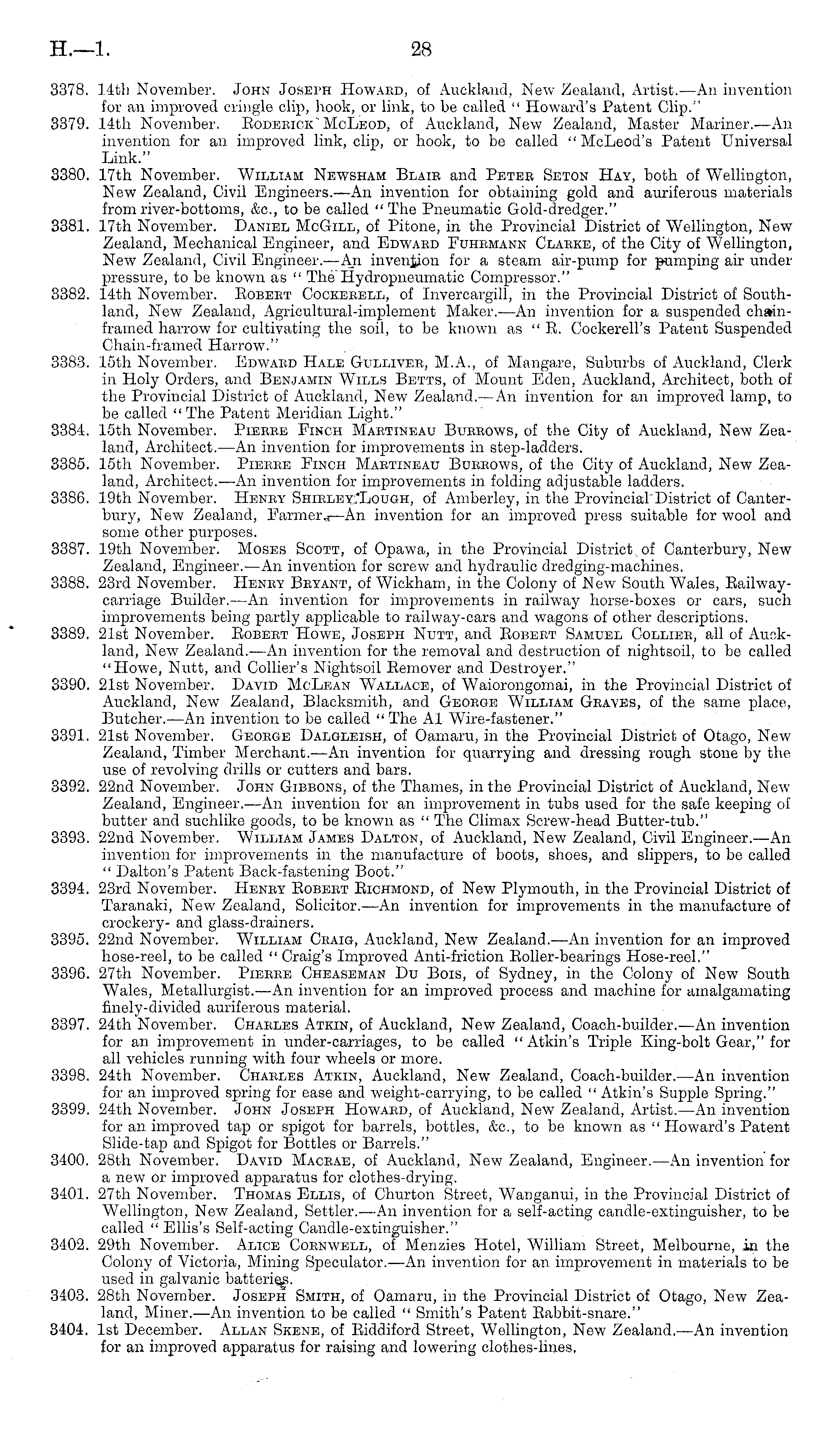 3378. 14th November. John Joseph Howard, of Auckland, New Zealand, Artist.—An invention for an improved cringle clip, hook, or link, to be called " Howard's Patent Clip." 3379. llth November. Boderick" McLeod, of Auckland, New Zealand, Master Mariner.—An invention for an improved link, clip, or hook, to be called " McLeod's Patent Universal Link." 3380. 17th November. W tilliam Newsham Blair and Peter Seton Hay, both of Wellington, New Zealand, Civil Engineers. —An invention for obtaining gold and auriferous materials from river-bottoms, &c, to be called " The Pneumatic Gold-dredger." 3381. 17th November. Daniel McGill, of Pitone, in the Provincial District of Wellington, New Zealand, Mechanical Engineer, and Edward Fuhrmann Clarke, of the City of Wellington, New Zealand, Civil Engineer.—An invention for a steam air-pump for pumping air under pressure, to be known as " The Hydropneumatic Compressor." 3382. 14th November. Bobeet Cockeeell, of Invercargill, in the Provincial District of Southland, New Zealand, Agricultural-implement Maker. —An invention for a suspended chainframed harrow for cultivating the soil, to be known as " B. Cockerell's Patent Suspended Chain-framed Harrow." 3383. 15th November. Edwaed Hale Gullivee, M.A., of Mangare, Suburbs of Auckland, Clerk in Holy Orders, and Benjamin Wills Betts, of Mount Eden, Auckland, Architect, both of the Provincial District of Auckland, New Zealand.— An invention for an improved lamp, to be called " The Patent Meridian Light." 3384. 15th November. Pieeee Finch Maetineau Burrows, of the City of Auckland, New Zealand, Architect.—An invention for improvements in step-ladders. 3385. 15th November. Pierre Finch Martineau Burrows, of the City of Auckland, New Zealand, Architect.—An invention for improvements in folding adjustable ladders. 3386. 19th November. Henry Shirley Lough, of Amberley, in the Provincial District of Canterbury, New Zealand, Farmer.:—An invention for an improved press suitable for wool and some other purposes. 3387. 19th November. Moses Scott, of Opawa, in the Provincial District of Canterbury, New Zealand, Engineer. —An invention for screw and hydraulic dredging-machines. 3388. 23rd November. Henry Bryant, of Wickham, in the Colony of New South Wales, Bailwaycarriage Builder.—An invention for improvements in railway horse-boxes or cars, such improvements being partly applicable to railway-cars and wagons of other descriptions. 3389. 21st November. Bobert Howe, Joseph Nutt, and Bobeet Samuel Collier, all of Auckland, New Zealand. —An invention for the removal and destruction of nightsoil, to be called "Howe, Nutt, and Collier's Nightsoil Bemover and Destroyer." 3390. 21st November. David McLean Wallace, of Waiorongomai, in the Provincial District of Auckland, New Zealand, Blacksmith, and George William Graves, of the same place, Butcher..—An invention to be called " The Al Wire-fastener." 3391. 21st November. George Dalgleish, of Oamaru, in the Provincial District of Otago, New Zealand, Timber Merchant. —An invention for quarrying and dressing rough stone by the use of revolving drills or cutters and bars. 3392. 22nd November. John Gibbons, of the Thames, in the Provincial District of Auckland, NewZealand, Engineer.—An invention for an improvement in tubs used for the safe keeping of butter and suchlike goods, to be known as " The Climax Screw-head Butter-tub." 3393. 22nd November. William James Dalton, of Auckland, New Zealand, Civil Engineer.—An invention for improvements in the manufacture of boots, shoes, and slippers, to be called " Dalton's Patent Back-fastening Boot." 3394. 23rd November. Henry Bobert Bichmond, of New Plymouth, in the Provincial District of Taranaki, New Zealand, Solicitor.—An invention for improvements in the manufacture of crockery- and glass-drainers. 3395. 22nd November. William Craig, Auckland, New Zealand.—An invention for an improved hose-reel, to be called " Craig's Improved Anti-friction Boiler-bearings Hose-reel." 3396. 27th November. Pieeee Cheaseman Dv Bois, of Sydney, in the Colony of New South Wales, Metallurgist. —An invention for an improved process and machine for amalgamating finely-divided auriferous material. 3397. 24th November. Chaeles Atkin, of Auckland, New Zealand, Coach-builder.—An invention for an improvement in under-carriages, to be called " Atkins Triple King-bolt Gear," for all vehicles running with four wheels or more. 3398. 24th November. Chaeles Atkin, Auckland, New Zealand, Coach-builder.—An invention for an improved spring for ease and weight-carrying, to be called " Atkins Supple Spring." 3399. 24th November. John Joseph Howaed, of Auckland, New Zealand, Artist.—An invention for an improved tap or spigot for barrels, bottles, &c, to be known as " Howard's Patent Slide-tap and Spigot for Bottles or Barrels." 3400. 28th November. David Maceae, of Auckland, New Zealand, Engineer.—An invention for a new or improved apparatus for clothes-drying. 3401. 27th November. Thomas Ellis, of Churton Street, Wanganui, in the Provincial District of Wellington, New Zealand, Settler. —An invention for a self-acting candle-extinguisher, to be called " Ellis's Self-acting Candle-extinguisher." 3402. 29th November. Alice Cornwell, of Menzies Hotel, William Street, Melbourne, in the Colony of Victoria, Mining Speculator.—An invention for an improvement in materials to be used in galvanic batterie^. 3403. 28th November. Joseph Smith, of Oamaru, in the Provincial District of Otago, New Zealand, Miner.—An invention to be called " Smith's Patent Babbit-snare." 3404. Ist December. Allan Skene, of Biddiford Street, Wellington, New Zealand. —An invention for an improved apparatus for raising and lowering clothes-lines,