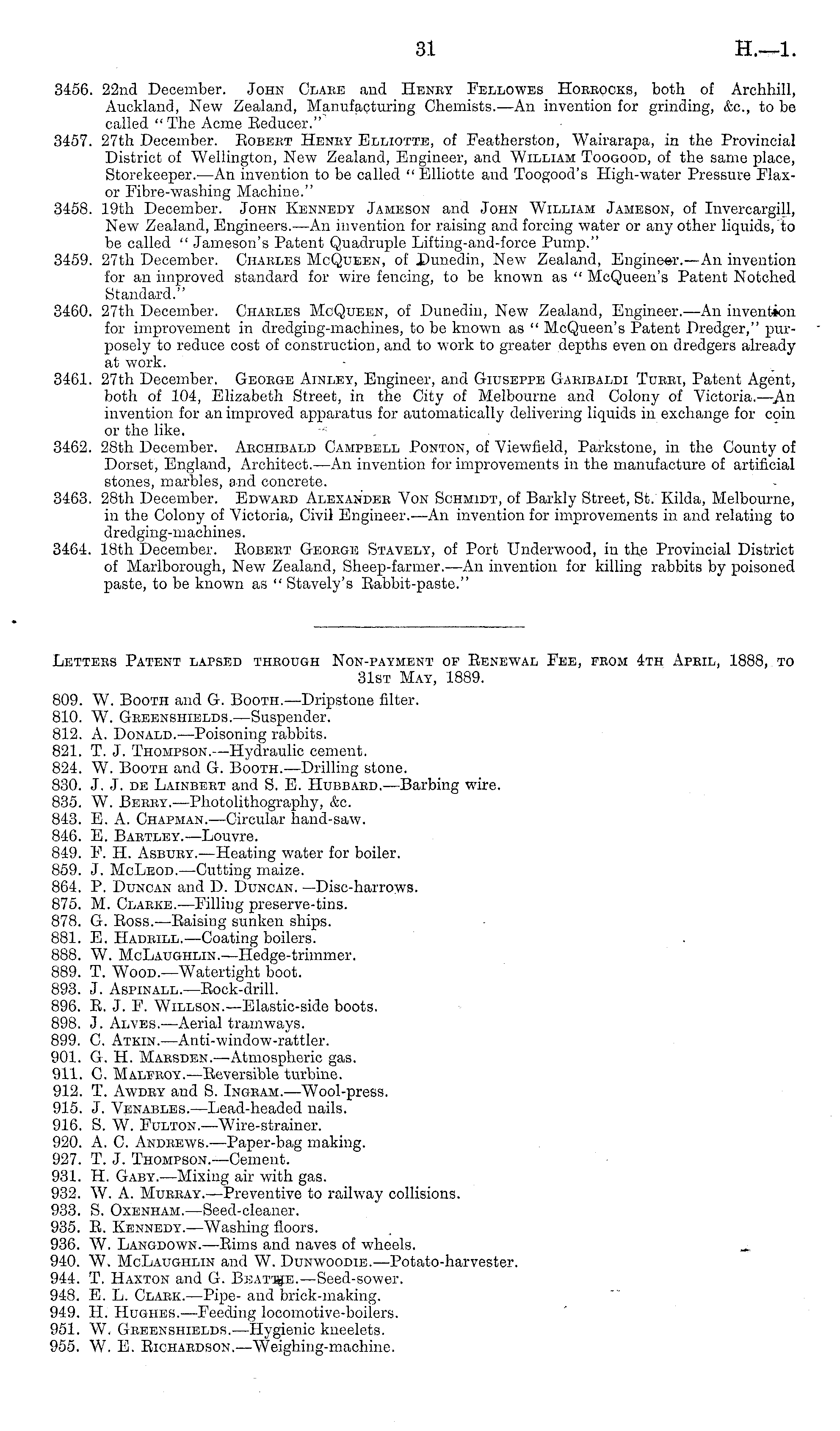 Letters Patent lapsed through Non-payment of Benewal Fee, from 4th April, 1888, to 31st May, 1889. 809. W. Booth and G. Booth. —Dripstone filter. 810. W. Greenshields. —Suspender. 812. A. Donald. —Poisoning rabbits. 821. T. J. Thompson.—Hydraulic cement. 824. W. Booth and G. Booth.—Drilling stone. 830. J. J. de Lambert and S. E. Hubbard.—Barbing wire. 835. W. Berry.—Photolithography, &c. 843. E. A. Chapman.—Circular hand-saw. 846. E. Bartley.—Louvre. 849. F. H. Asbury.—Heating water for boiler. 859. J. McLeod.—Cutting maize. 864. P. Duncan and D. Duncan. —Disc-harrows. 875. M. Clarke.—Filling preserve-tins. 878. G. Boss. —Baising sunken ships. 881. E. Hadrill. —Coating boilers. 888. W. McLaughlin.—Hedge-trimmer. 889. T. Wood.—Watertight boot. 893. J. Aspinall.—Bock-drill. 896. B. J. F. Willson.—Elastic-side boots. 898. J. Aeves. —Aerial tramways. 899. C. Atkin.—Anti-window-rattler. 901. G. H. Maesden.—Atmospheric gas. 911. C. Malfroy.—Beversible turbine. 912. T. Awdey and S. Ingram.—Wool-press. 915. J. Venables.—Lead-headed nails. 916. S. W. Fulton.—Wire-strainer. 920. A. C. Andrews. —Paper-bag making. 927. T. J. Thompson.—Cement. 931. H. Gaby.—Mixing air with gas. 932. W. A. Murray.—Preventive to railway collisions. 933. S. Oxenham.—Seed-cleaner. 935. B. Kennedy.—Washing floors. 936. W. Langdown.—Bims and naves of wheels. 910. W. McLaughlin and W. Dunwoodie.—Potato-harvester. 944. T. Haxton and G. Beat-he. —Seed-sower. 948. E. L. Clark.—Pipe- and brick-making. 949. 11. Hughes.—Feeding locomotive-boilers. 951. W. Greenshields.—Hygienic kneelets. 955. W. E. Bichardson. —Weighing-machine.