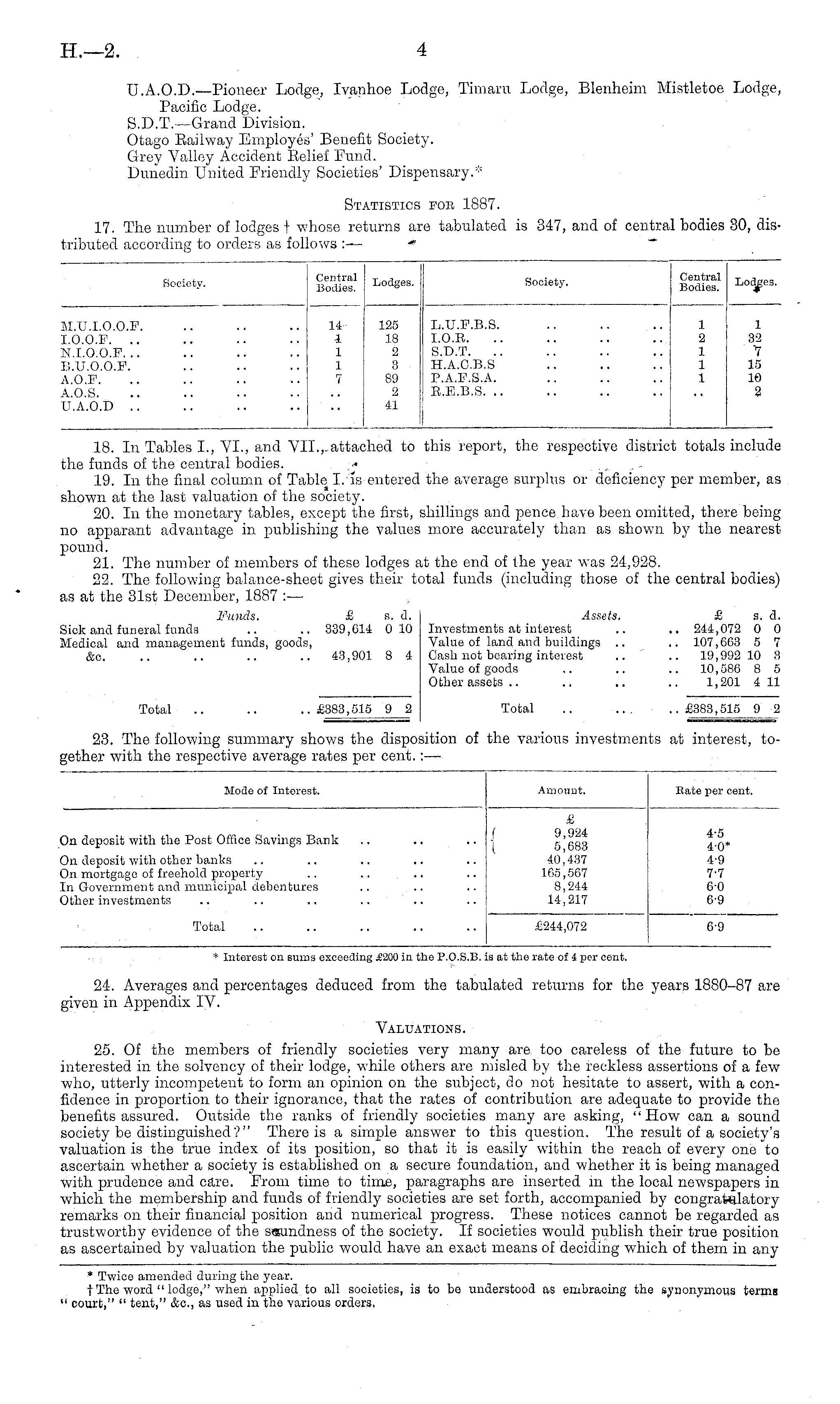 U.A.O.D.—Pioneer Lodge, Ivanhoe Lodge, Timaru Lodge, Blenheim Mistletoe Lodge, Pacific Lodge. S.D.T.— Grand Division. Otago Eailway Employes' Benefit Society. Grey Valley Accident Belief Fund. Dunedin United Friendly Societies' Dispensary.* Statistics foe 1887. 17. The number of lodges t whose returns are tabulated is 347, and of central bodies 30, distributed according to orders as follows :—