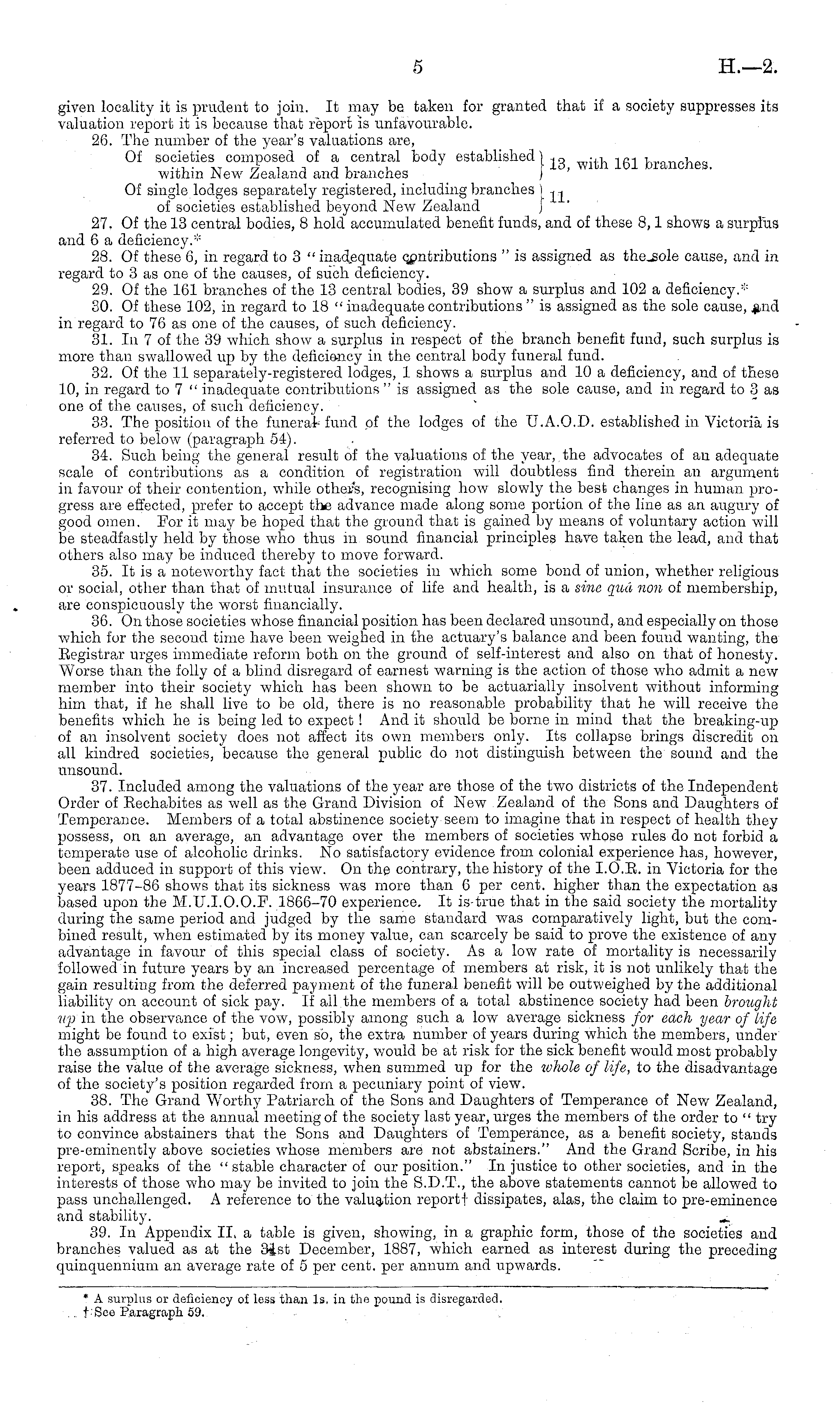 given locality it is prudent to join. It may be taken for granted that if a society suppresses its valuation report it is because that report is unfavourable. 26. The number of the year's valuations are, Of societies composed of a central body established) 1 q ; ,v IRI i.^ oin «i, nc , • ji ■ •«T rr ~\ ~\ ~r i i I iO. it lull XU JL fJX. cl/IICQGs. within New Zealand and brancnes J Of single lodges separately registered, including branches j -,-. of societies established beyond New Zealand j 27. Of the 13 central bodies, 8 hold accumulated benefit funds, and of these 8,1 shows a surplus and 6 a deficiency.* 28. Of these 6, in regard to 3 "inadequate contributions " is assigned as the^sole cause, and in regard to 3 as one of the causes, of such deficiency. 29. Of the 161 branches of the 13 central bodies, 39 show a surplus and 102 a deficiency.* 30. Of these 102, in regard to 18 " inadequate contributions " is assigned as the sole cause, #nd in regard to 76 as one of the causes, of such deficiency. 31. In 7 of the 39 which show a surplus in respect of the branch benefit fund, such surplus is more than swallowed up by the deficiency in the central body funeral fund. 32. Of the 11 separately-registered lodges, 1 shows a surplus and 10 a deficiency, and of these 10, in regard to 7 " inadequate contributions " is assigned as the sole cause, and in regard to 3 as one of the causes, of such deficiency. 33. The position of the funeral- fund of the lodges of the U.A.O.D. established in Victoria is referred to below (paragraph 54). 34. Such being the general result of the valuations of the year, the advocates of an adequate scale of contributions as a condition of registration will doubtless find therein an argument in favour of their contention, while others, recognising how slowly the best changes in human progress are effected, prefer to accept the advance made along some portion of the line as an augury of good omen. For it may be hoped that the ground that is gained by means of voluntary action will be steadfastly held by those who thus in sound financial principles have taken the lead, and that others also may be induced thereby to move forward. 35. It is a noteworthy fact that the societies in which some bond of union, whether religious or social, other than that of mutual insurance of life and health, is a sine qua non of membership, are conspicuously the worst financially. 36. On those societies whose financial position has been declared unsound, and especially on those which for the second time have been weighed in the actuary's balance and been found wanting, the Eegistrar urges immediate reform both on the ground of self-interest and also on that of honesty. Worse than the folly of a blind disregard of earnest warning is the action of those who admit a new member into their society which has been shown to be actuarially insolvent without informing him that, if he shall live to be old, there is no reasonable probability that he will receive the benefits which he is being led to expect ! And it should be borne in mind that the breaking-up of an insolvent society does not affect its own members only. Its collapse brings discredit on all kindred societies, because the general public do not distinguish between the sound and the unsound. 37. Included among the valuations of the year are those of the two districts of the Independent Order of Eechabites as well as the Grand Division of New Zealand of the Sons and Daughters of Temperance. Members of a total abstinence society seem to imagine that in respect of health they possess, on an average, an advantage over the members of societies whose rules do not forbid a temperate use of alcoholic drinks. No satisfactory evidence from colonial experience has, however, been adduced in support of this view. On the contrary, the history of the 1.0. E. in Victoria for the years 1877-86 shows that its sickness was more than 6 per cent, higher than the expectation as based upon the M.U.1.0.0.F. 1866-70 experience. It is true that in the said society the mortality during the same period and judged by the same standard was comparatively light, but the combined result, when estimated by its money value, can scarcely be said to prove the existence of any advantage in favour of this special class of society. As a low rate of mortality is necessarily followed in future years by an increased percentage of members at risk, it is not unlikely that the gain resulting from the deferred payment of the funeral benefit will be outweighed by the additional liability on account of sick pay. If ail the members of a total abstinence society had been brought up in the observance of the vow, possibly among such a low average sickness for each year of Life might be found to exist; but, even so, the extra number of years during which the members, under the assumption of a high average longevity, would be at risk for the sick benefit would most probably raise the value of the average sickness, when summed up for the whole of life, to the disadvantage of the society's position regarded from a pecuniary point of view. 38. The Grand Worthy Patriarch of the Sons and Daughters of Temperance of New Zealand, in his address at the annual meeting of the society last year, urges the members of the order to " try to convince abstainers that the Sons and Daughters of Temperance, as a benefit society, stands pre-eminently above societies whose members are not abstainers." And the Grand Scribe, in his report, speaks of the " stable character of our position." In justice to other societies, and in the interests of those who may be invited to join the S.D.T., the above statements cannot be allowed to pass unchallenged. A reference to the valuation report! dissipates, alas, the claim to pre-eminence and stability. 39. In Appendix 11, a table is given, showing, in a graphic form, those of the societies and branches valued as at the 34st December, 1887, which earned as interest during the p