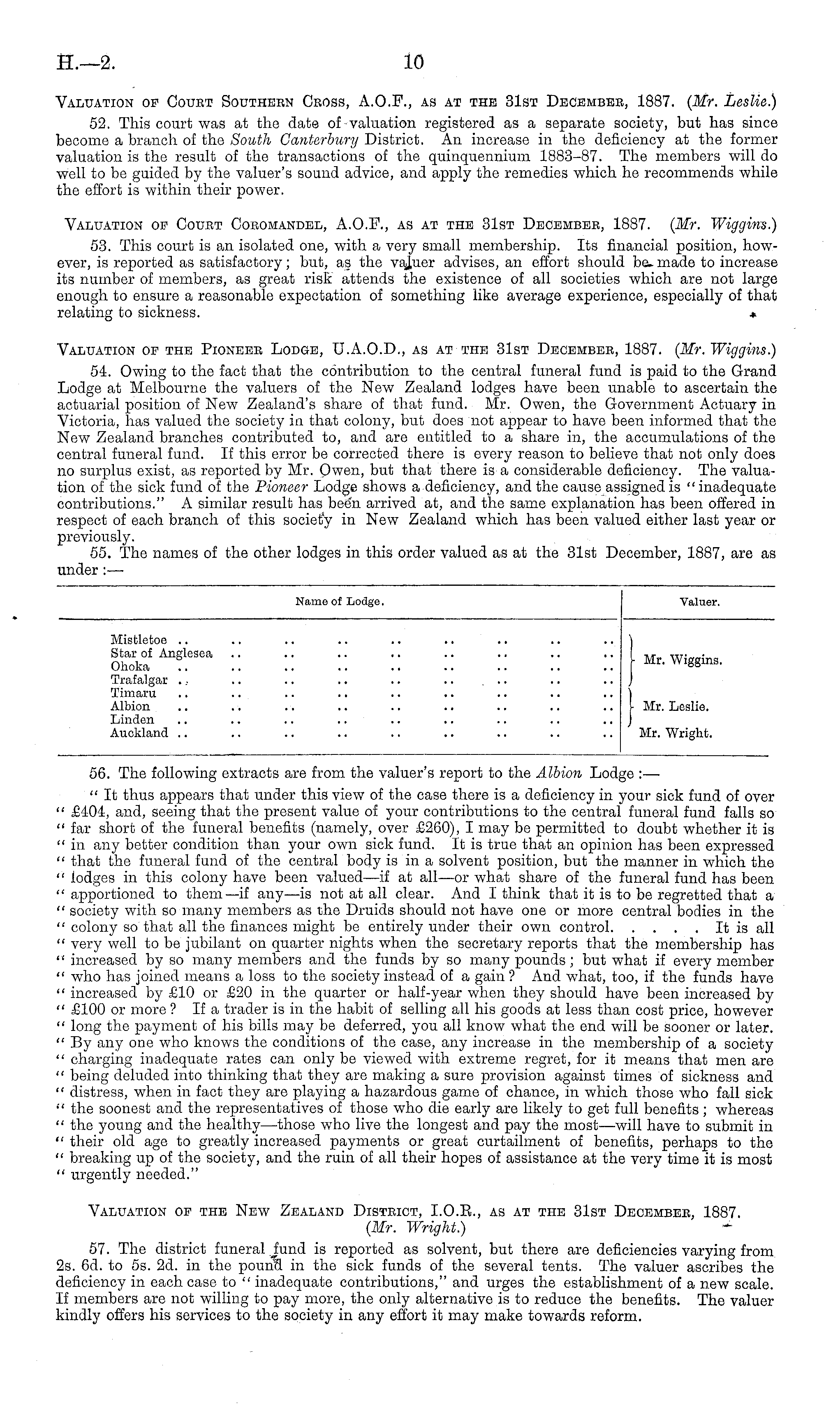 Valuation of Court Southeen Cross, A.0.F., as at the 31st December, 1887. (Mr. Leslie.) 52. This court was at the date of valuation registered as a separate society, but has since become a branch of the South Canterbury District. An increase in the deficiency at the former valuation is the result of the transactions of the quinquennium 1883-87. The members will do well to be guided by the valuer's sound advice, and apply the remedies which he recommends while the effort is within their power. Valuation of Court Coromandel, A.0.P., as at the 31st December, 1887. (Mr. Wiggins.) 53. This court is an isolated one, with a very small membership. Its financial position, however, is reported as satisfactory; but, as the vajuer advises, an effort should be» made to increase its number of members, as great risk attends the existence of all societies which are not large enough to ensure a reasonable expectation of something like average experience, especially of that relating to sickness. * Valuation of the Pioneer Lodge, U.A.0.D., as at the 31st December, 1887. (Mr. Wiggins.) 54. Owing to the fact that the contribution to the central funeral fund is paid to the Grand Lodge at Melbourne the valuers of the New Zealand lodges have been unable to ascertain the actuarial position of New Zealand's share of that fund. Mr. Owen, the Government Actuary in Victoria, has valued the society in that colony, but does not appear to have been informed that the New Zealand branches contributed to, and are entitled to a share in, the accumulations of the central funeral fund. If this error be corrected there is every reason to believe that not only does no surplus exist, as reported by Mr. Owen, but that there is a considerable deficiency. The valuation of the sick fund of the Pioneer Lodge shows a deficiency, and the cause assigned is " inadequate contributions." A similar result has been arrived at, and the same explanation has been offered in respect of each branch of this society in New Zealand which has been valued either last year or previously. 55. The names of the other lodges in this order valued as at the 31st December, 1887, are as under :■—■