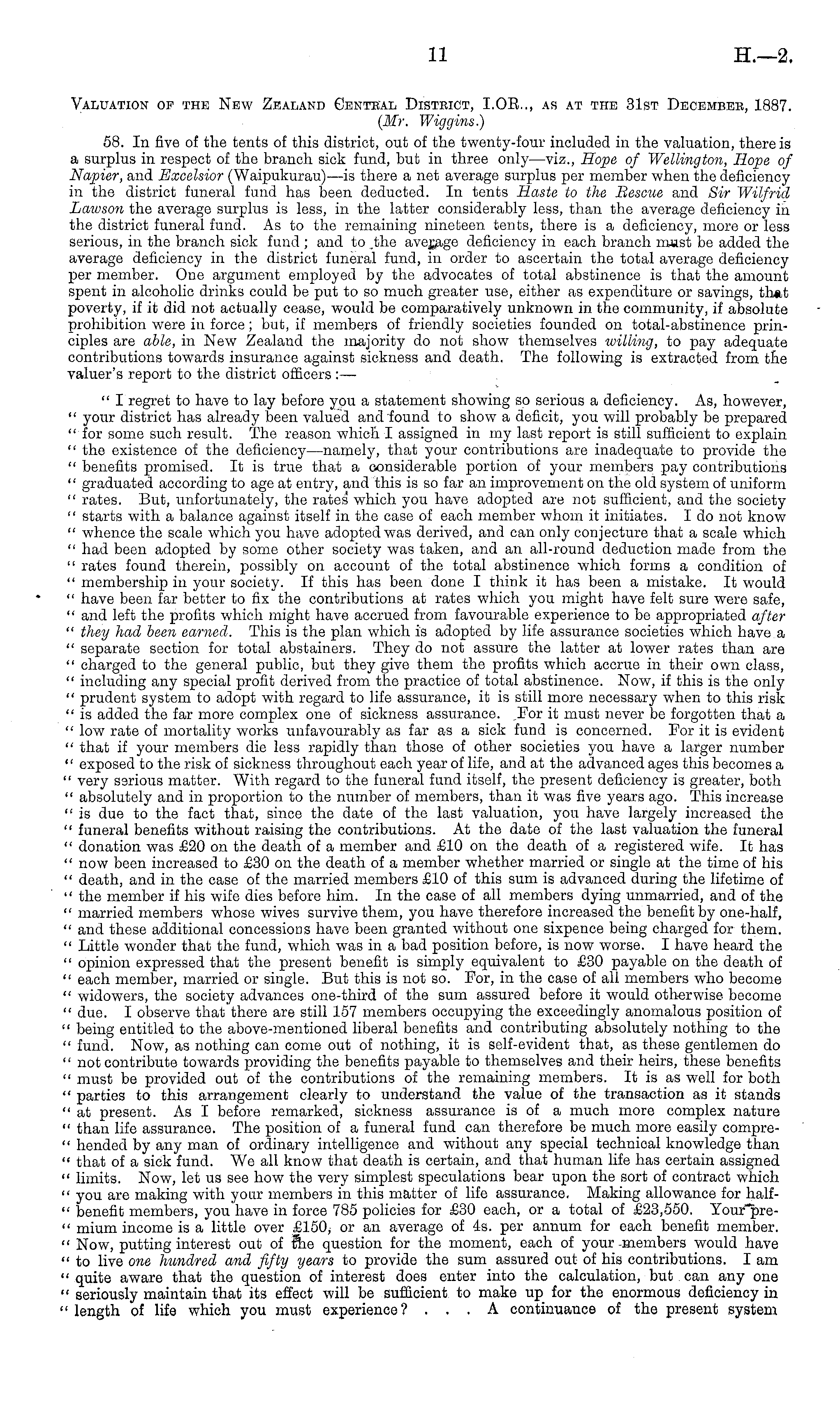 Valuation of the New Zealand Genteal Disteict, 1.08.., as at the 31st December, 1887. (Mr. Wiggins.) 58. In five of the tents of this district, out of the twenty-four included in the valuation, there is a surplus in respect of the branch sick fund, but in three only—viz., Hope of Wellington, Rope of Napier, and Excelsior (Waipukurau)—is there a net average surplus per member when the deficiency in the district funeral fund has been deducted. In tents Haste to the liescue and Sir Wilfrid Lawson the average surplus is less, in the latter considerably less, than the average deficiency in the district funeral fund. As to the remaining nineteen tents, there is a deficiency, more or less serious, in the branch sick fund ; and to the average deficiency in each branch must be added the average deficiency in the district funeral fund, in order to ascertain the total average deficiency per member. One argument employed by the advocates of total abstinence is that the amount spent in alcoholic drinks could be put to so much greater use, either as expenditure or savings, that poverty, if it did not actually cease, would be comparatively unknown in the community, if absolute prohibition were in force; but, if members of friendly societies founded on total-abstinence principles are able, in New Zealand the majority do not show themselves willing, to pay adequate contributions towards insurance against sickness and death. The following is extracted from the valuer's report to the district officers : — " I regret to have to lay before you a statement showing so serious a deficiency. As, however, " your district has already been valued and found to show a deficit, you will probably be prepared " for some such result. The reason which I assigned in my last report is still sufficient to explain " the existence of the deficiency—namely, that your contributions are inadequate to provide the " benefits promised. It is true that a considerable portion of your members pay contributions " graduated according to age at entry, and this is so far an improvement on the old system of uniform " rates. But, unfortunately, the rates which you have adopted are not sufficient, and the society " starts with a balance against itself in the case of each member whom it initiates. Ido not know " whence the scale which you have adopted was derived, and can only conjecture that a scale which " had been adopted by some other society was taken, and an all-round deduction made from the " rates found therein, possibly on account of the total abstinence which forms a condition of " membership in your society. If this has been done I think it has been a mistake. It would " have been far better to fix the contributions at rates which you might have felt sure were safe, " and left the profits which might have accrued from favourable experience to be appropriated after " they had been earned. This is the plan which is adopted by life assurance societies which have a " separate section for total abstainers. They do not assure the latter at lower rates than are " charged to the general public, but they give them the profits which accrue in their own class, " including any special profit derived from the practice of total abstinence. Now, if this is the only " prudent system to adopt with regard to life assurance, it is still more necessary when to this risk "is added the far more complex one of sickness assurance. For it must never be forgotten that a " low rate of mortality works unfavourably as far as a sick fund is concerned. For it is evident " that if your members die less rapidly than those of other societies you have a larger number " exposed to the risk of sickness throughout each year of life, and at the advanced ages this becomes a " very serious matter. With regard to the funeral fund itself, the present deficiency is greater, both " absolutely and in proportion to the number of members, than it was five years ago. This increase " is due to the fact that, since the date of the last valuation, you have largely increased the " funeral benefits without raising the contributions. At the date of the last valuation the funeral " donation was £20 on the death of a member and £10 on the death of a registered wife. It has " now been increased to £30 on the death of a member whether married or single at the time of his " death, and in the case of the married members £10 of this sum is advanced during the lifetime of " the member if his wife dies before him. In the case of all members dying unmarried, and of the " married members whose wives survive them, you have therefore increased the benefit by one-half, " and these additional concessions have been granted without one sixpence being charged for them. " Little wonder that the fund, which was in a bad position before, is now worse. I have heard the " opinion expressed that the present benefit is simply equivalent to £30 payable on the death of " each member, married or single. But this is not so. For, in the case of all members who become " widowers, the society advances one-third of the sum assured before it would otherwise become " due. I observe that there are still 157 members occupying the exceedingly anomalous position of " being entitled to the above-mentioned liberal benefits and contributing absolutely nothing to the " fund. Now, as nothing can come out of nothing, it is self-evident that, as these gentlemen do " not contribute towards providing the benefits payable to themselves and their heirs, these benefits " must be provided out of the contributions of the remaining members. It is as well for both " parties to this arrangement clearly to understand the value of the transaction as it stands "at present. As I before remarked, sickness assurance is of a much more complex nature " than life assurance. The position of a funeral fund can therefore be much more easily compre- " hended by any man of ordinary intelligence and without any special technical knowledge than